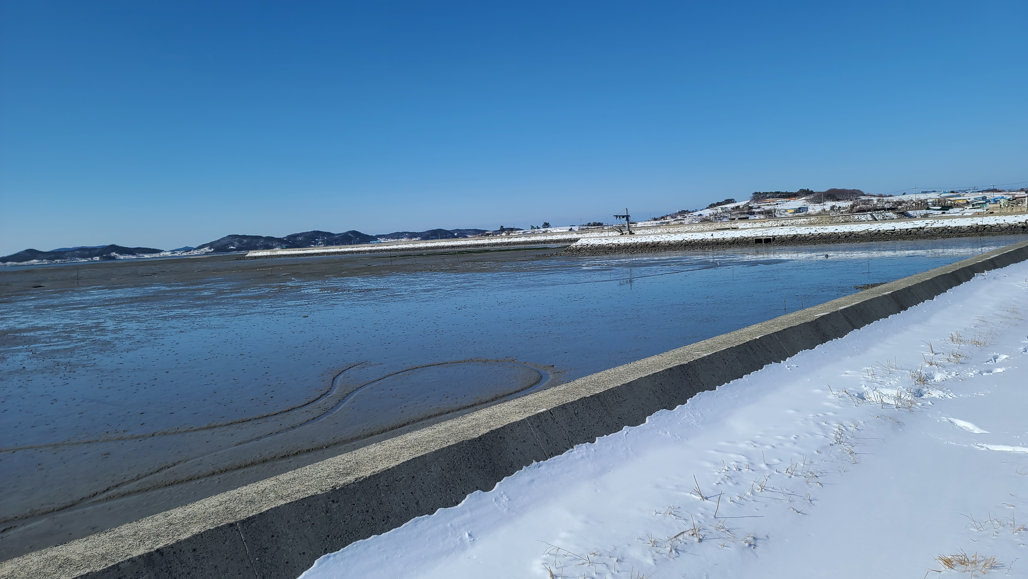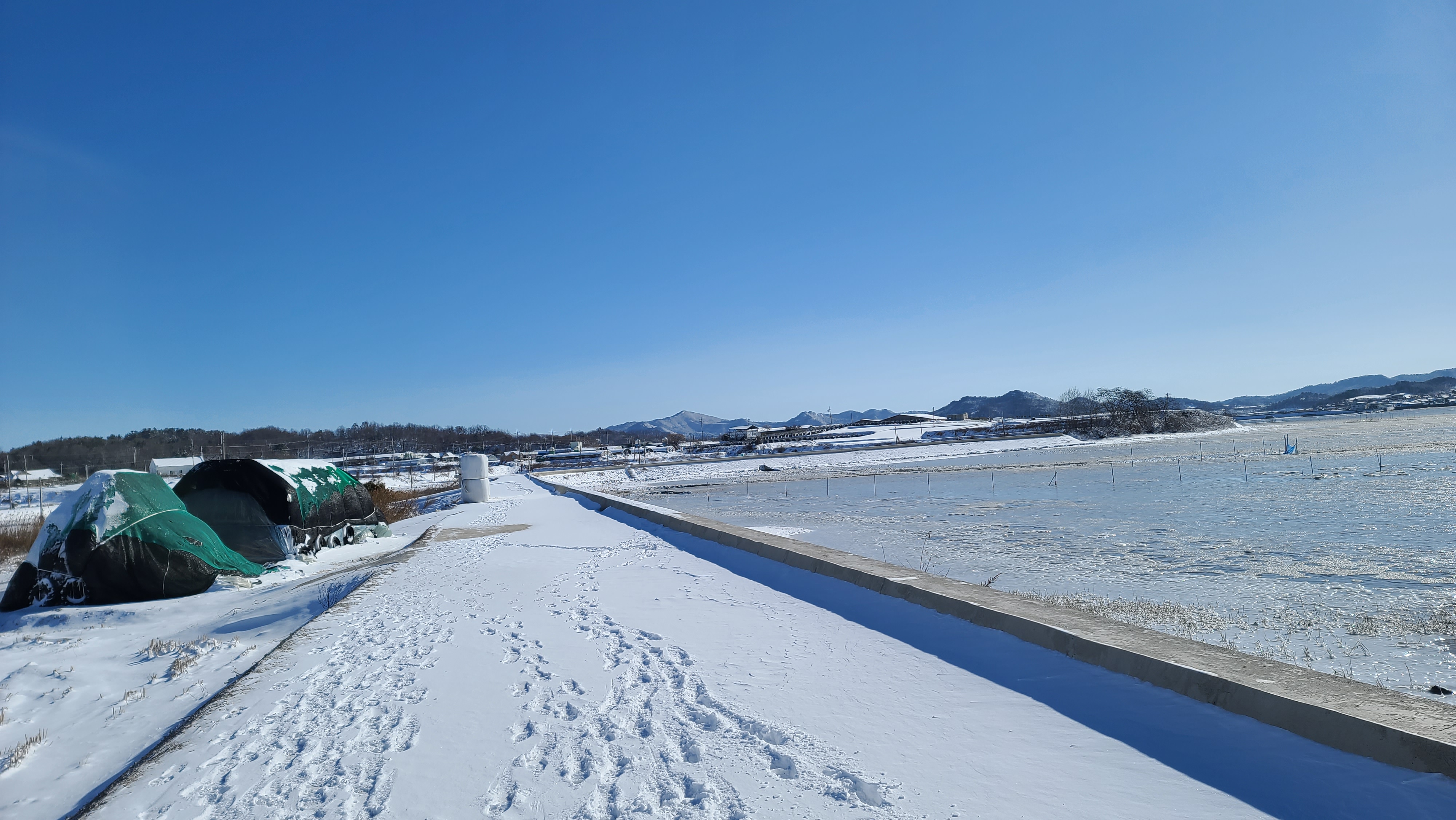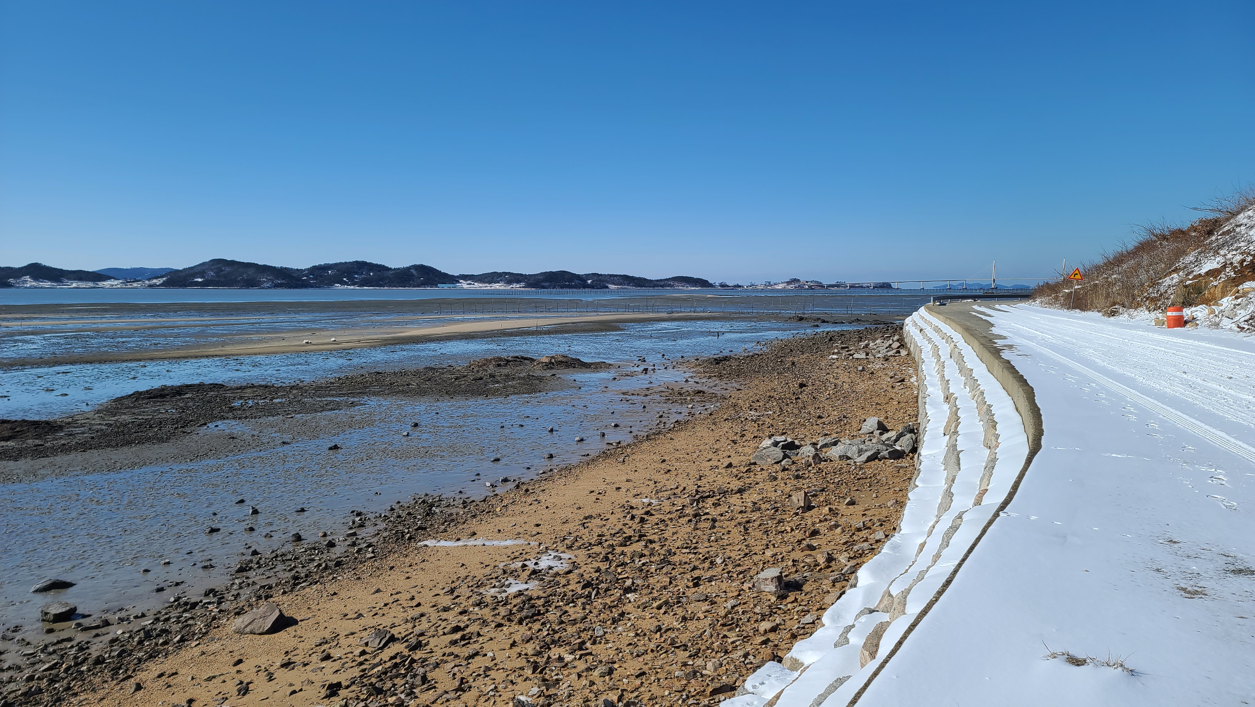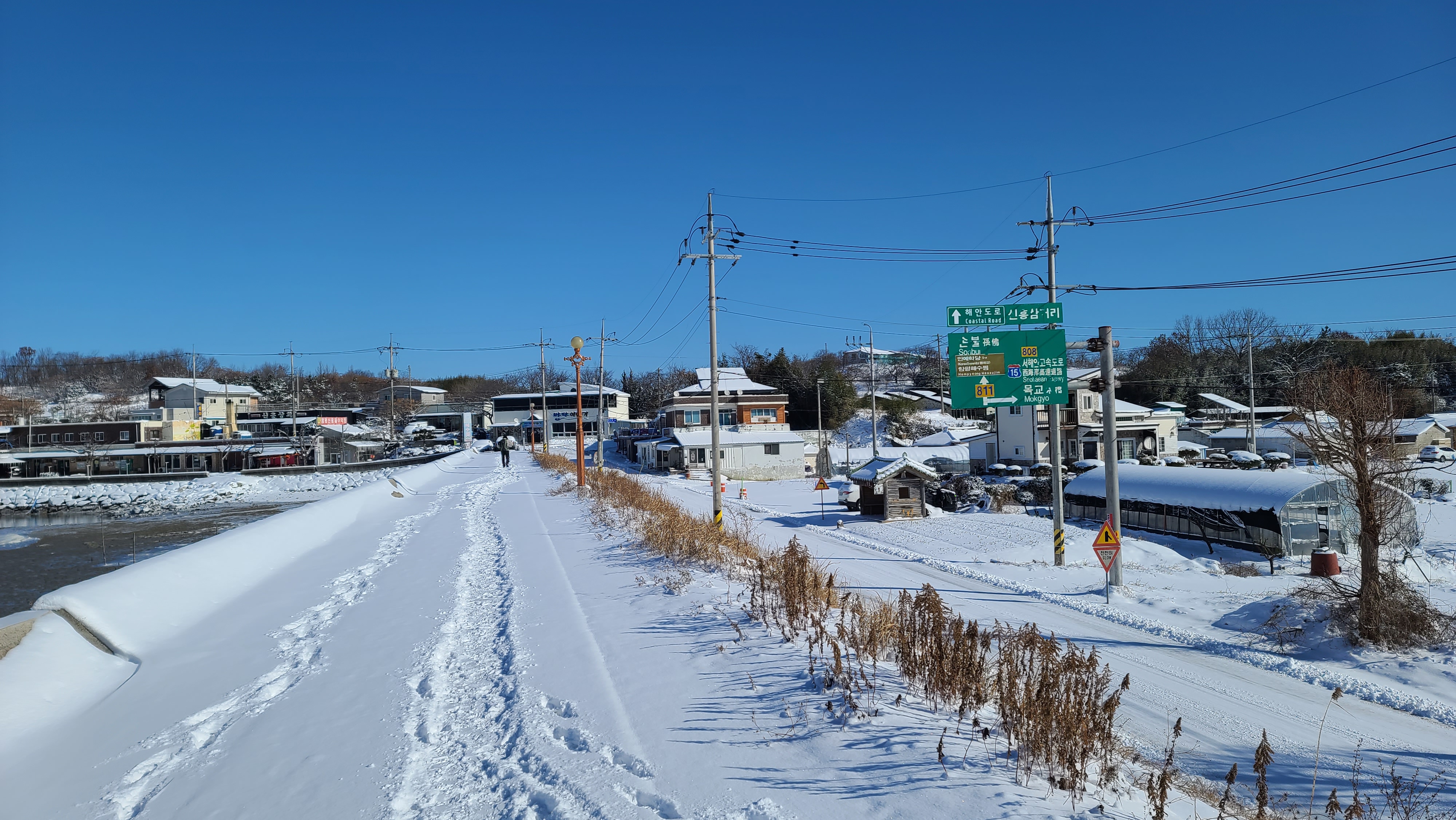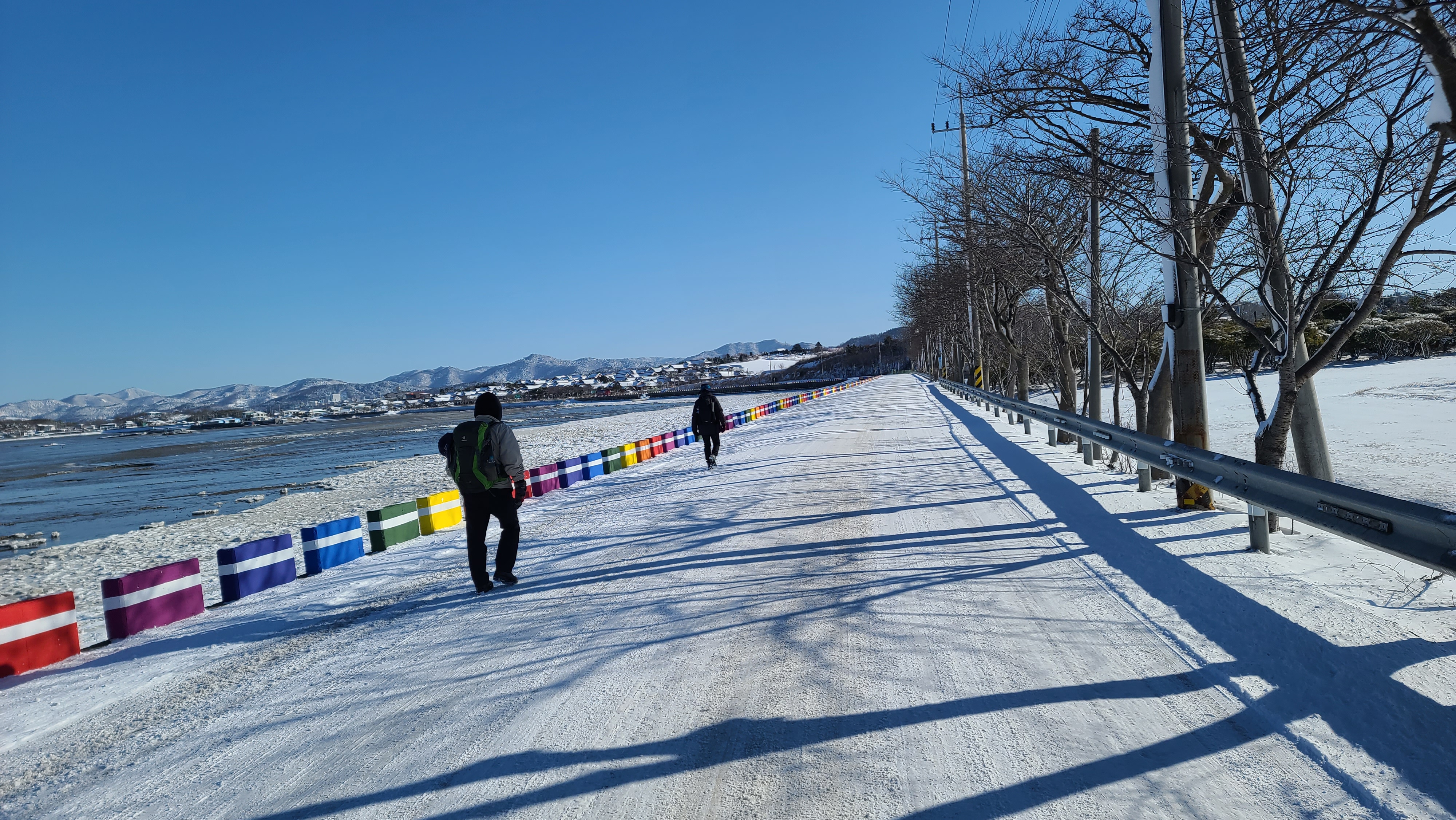 함해만 동쪽을 흐르는 산세는 높지 않고 나즈막한 산들이 이어지며, 해안과 산줄기 사이에 들녘이 펼쳐져 있다. 탐방하는 날은 운이 좋았는지, 눈 쌓인 산줄기와 눈 덮인 들녘이 투명한 겨울 햇빛을 받으며 거칠 것이 없이 탁트였다. 겨울산의 고적이 솟아오르고 겨울들녘의 평화가 펼쳐져 함해만 바다와 멋지게 어우러졌다. 그 중에서도 산남리의 들녘, 월천리의 들녘, 학산리의 들녘이 가슴에 새겨져 있다. 뒤에는 나즈막한 산맥이 흐르고, 앞에는 드넓은 평야가 펼쳐져 있는 마을들이 이웃하여 오손도손 자리하고 있다. 바람은은 들녘을 가로질러 바다를 건너 함해만 서쪽으로 불어가고 철새는 바다를 건너와 마을 앞 들녘의 하늘로 날아온다. 햇빛은 물 들어오는 바다에서 눈부시게 빛나고 물새들이 한가로이 유영을 즐긴다. 이 평화의 세상, 소박함이 그곳에 있으며 근면과 검소가 그곳에 있다. 긴 거리의 트레킹에 허우적거리다가 화려하지 않으나 빛나는 이 풍경의 아름다움에 길손은 벅차다.