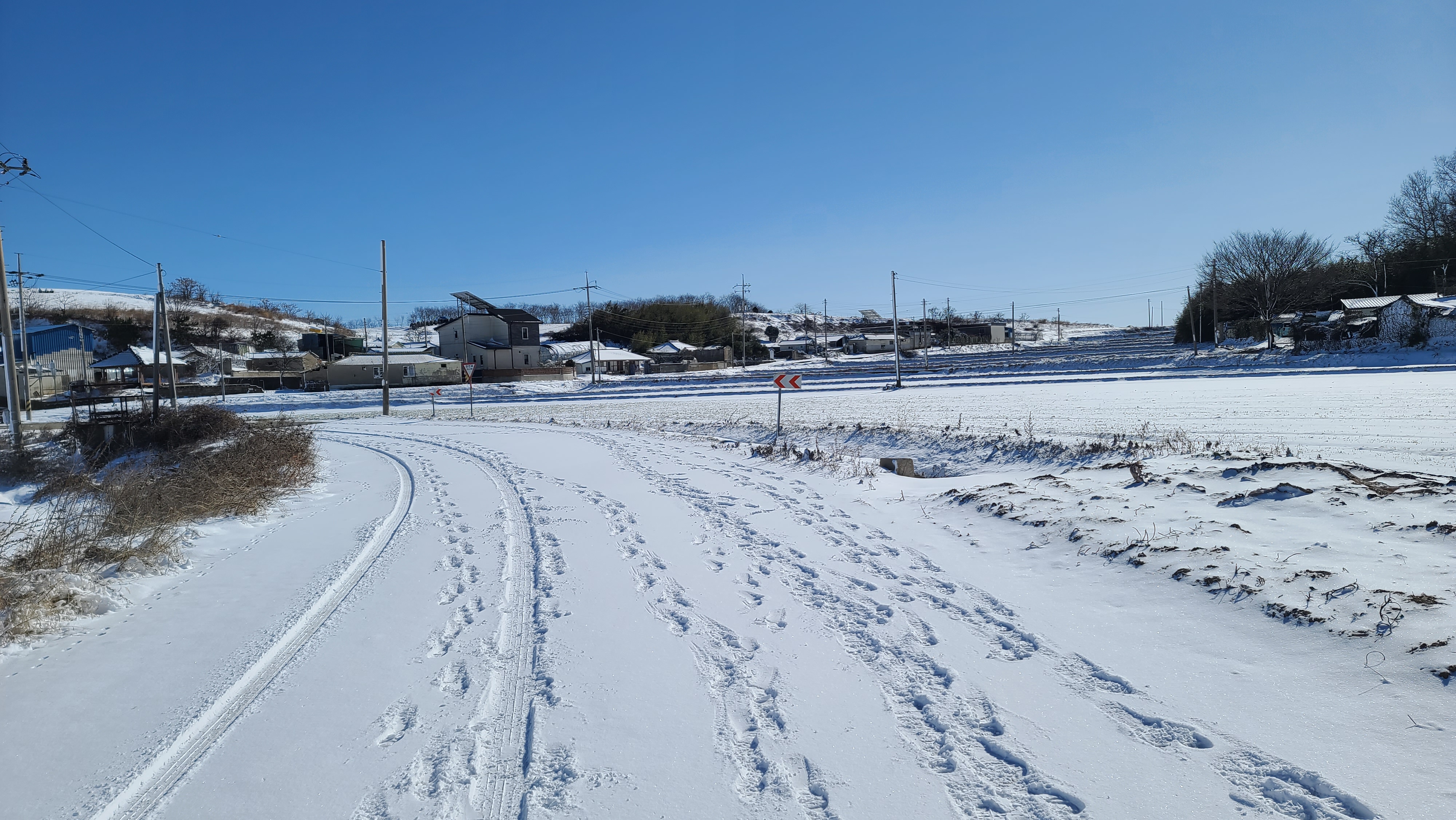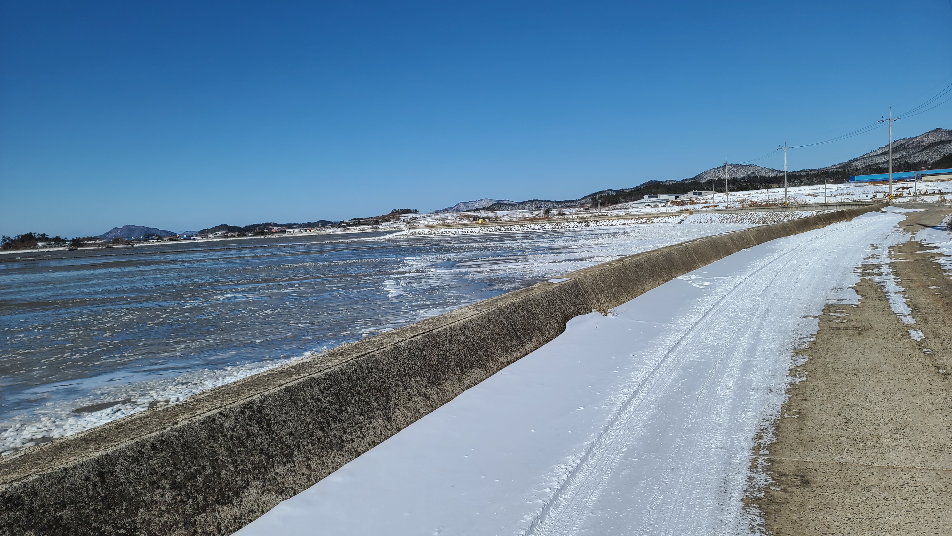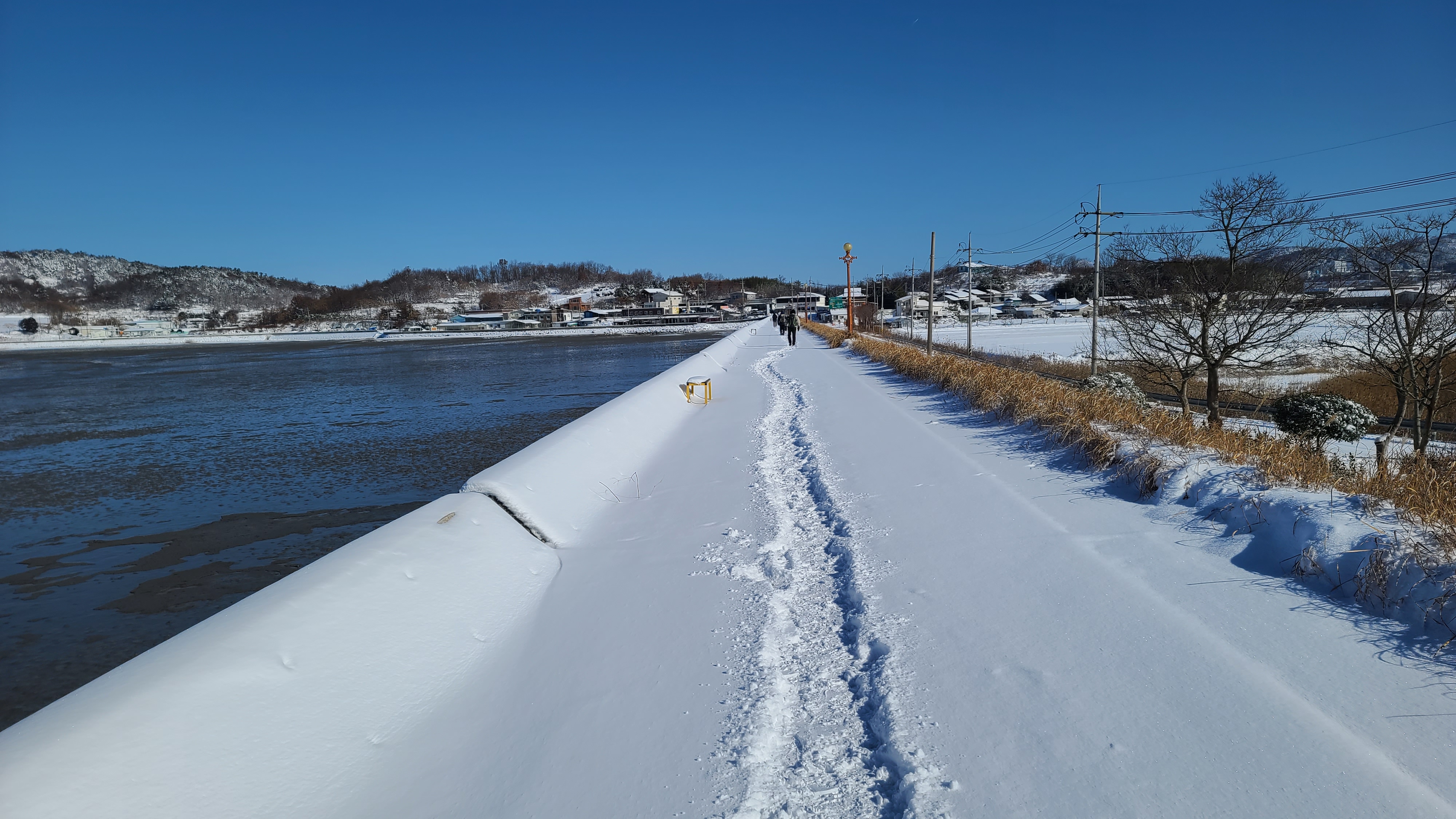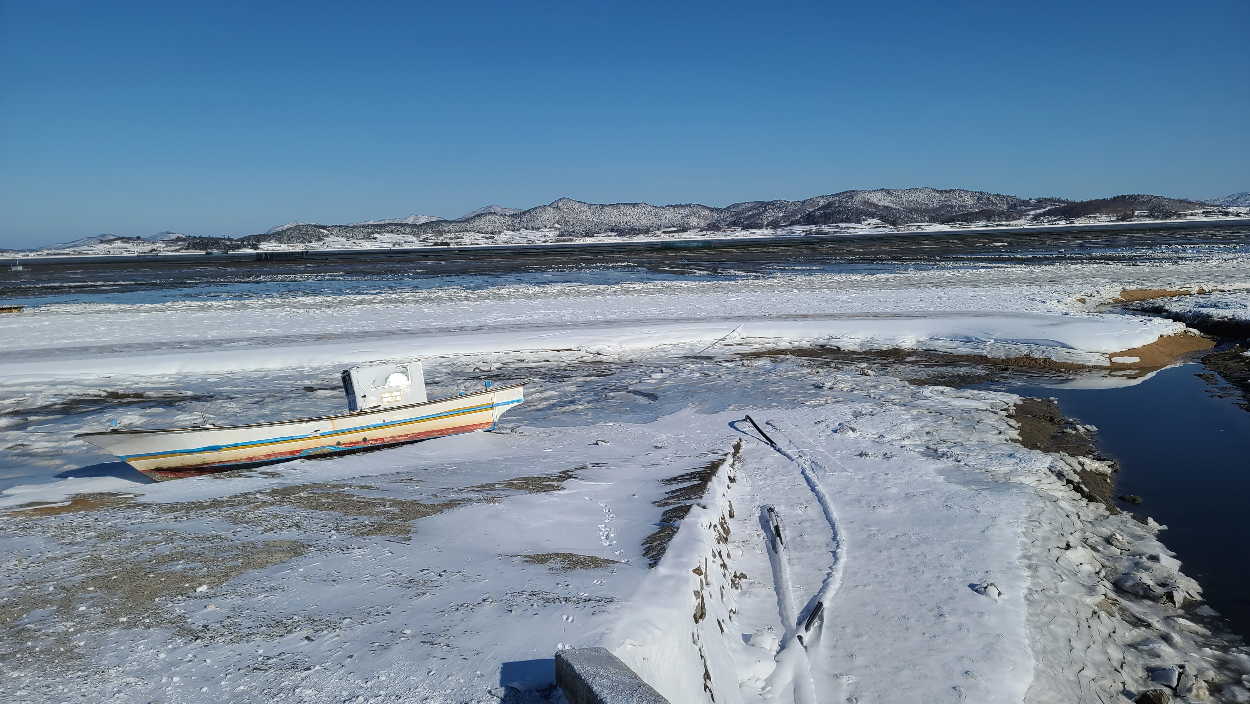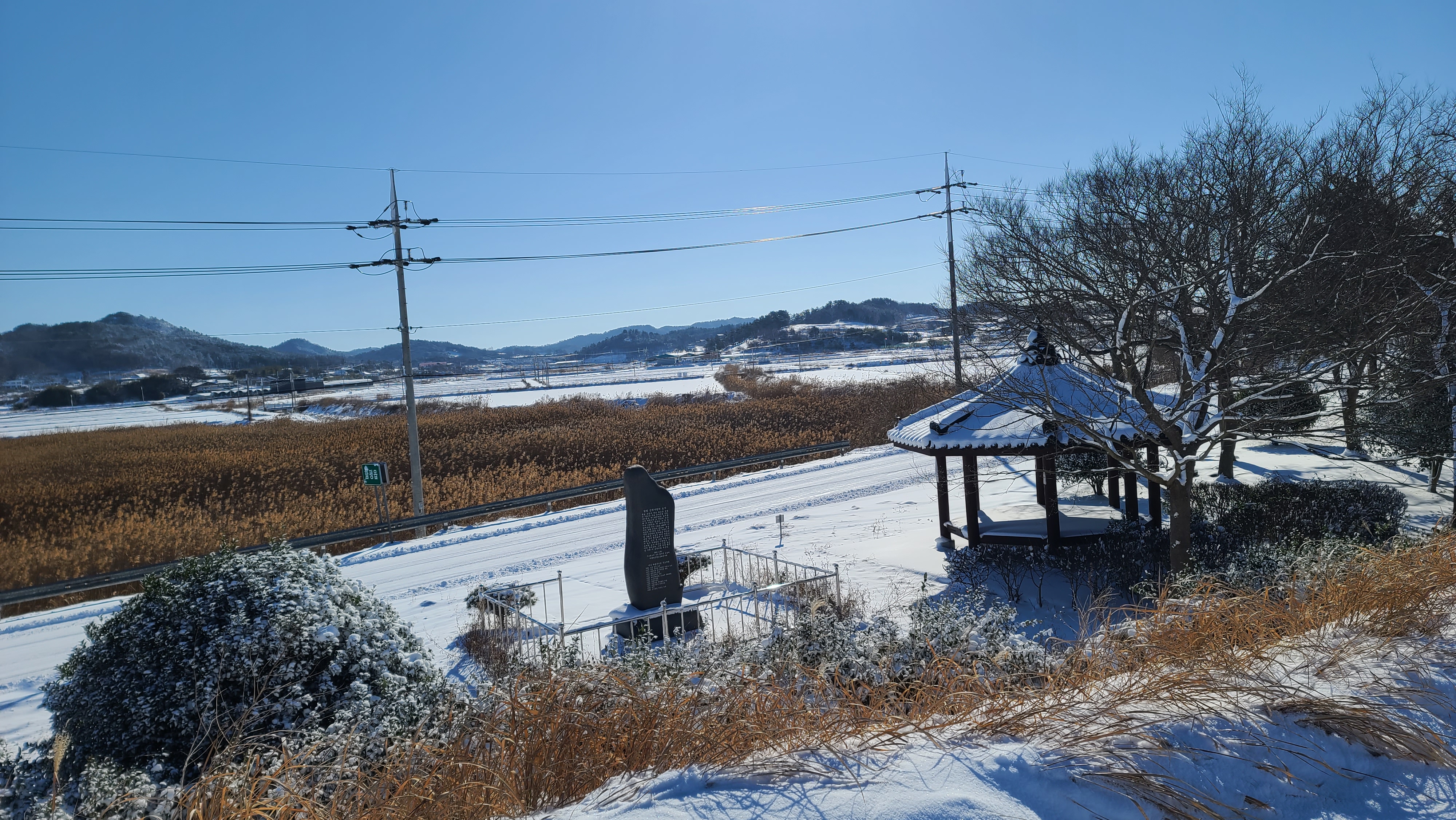 함해만 동쪽을 흐르는 산세는 높지 않고 나즈막한 산들이 이어지며, 해안과 산줄기 사이에 들녘이 펼쳐져 있다. 탐방하는 날은 운이 좋았는지, 눈 쌓인 산줄기와 눈 덮인 들녘이 투명한 겨울 햇빛을 받으며 거칠 것이 없이 탁트였다. 겨울산의 고적이 솟아오르고 겨울들녘의 평화가 펼쳐져 함해만 바다와 멋지게 어우러졌다. 그 중에서도 산남리의 들녘, 월천리의 들녘, 학산리의 들녘이 가슴에 새겨져 있다. 뒤에는 나즈막한 산맥이 흐르고, 앞에는 드넓은 평야가 펼쳐져 있는 마을들이 이웃하여 오손도손 자리하고 있다. 바람은은 들녘을 가로질러 바다를 건너 함해만 서쪽으로 불어가고 철새는 바다를 건너와 마을 앞 들녘의 하늘로 날아온다. 햇빛은 물 들어오는 바다에서 눈부시게 빛나고 물새들이 한가로이 유영을 즐긴다. 이 평화의 세상, 소박함이 그곳에 있으며 근면과 검소가 그곳에 있다. 긴 거리의 트레킹에 허우적거리다가 화려하지 않으나 빛나는 이 풍경의 아름다움에 길손은 벅차다.
