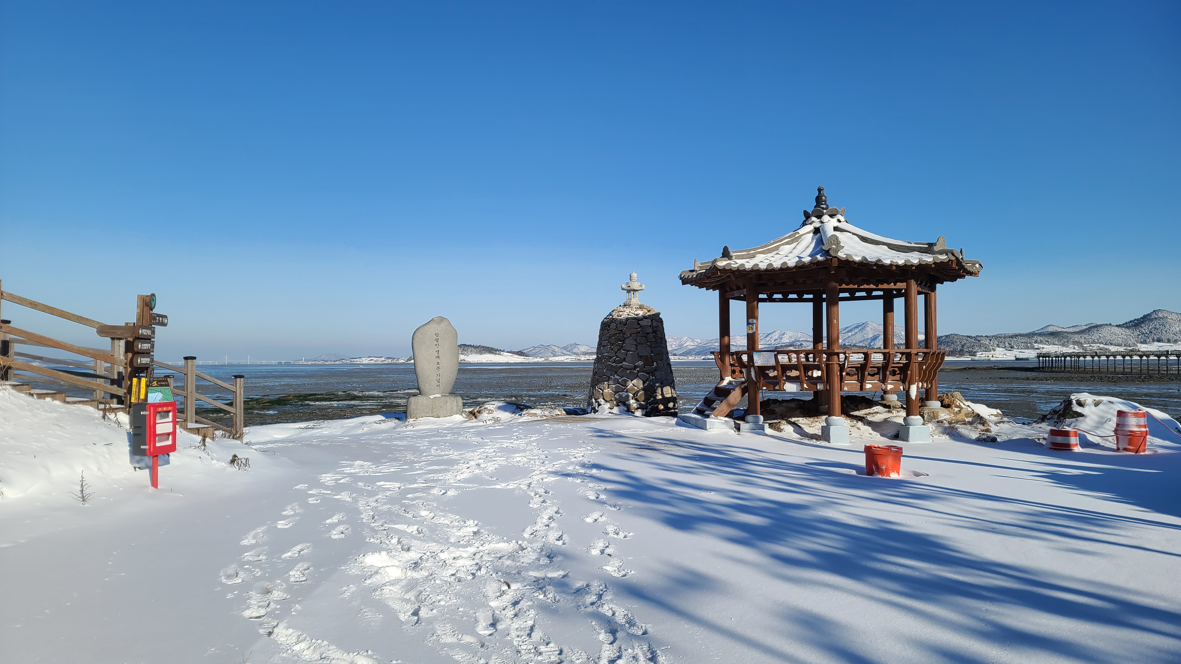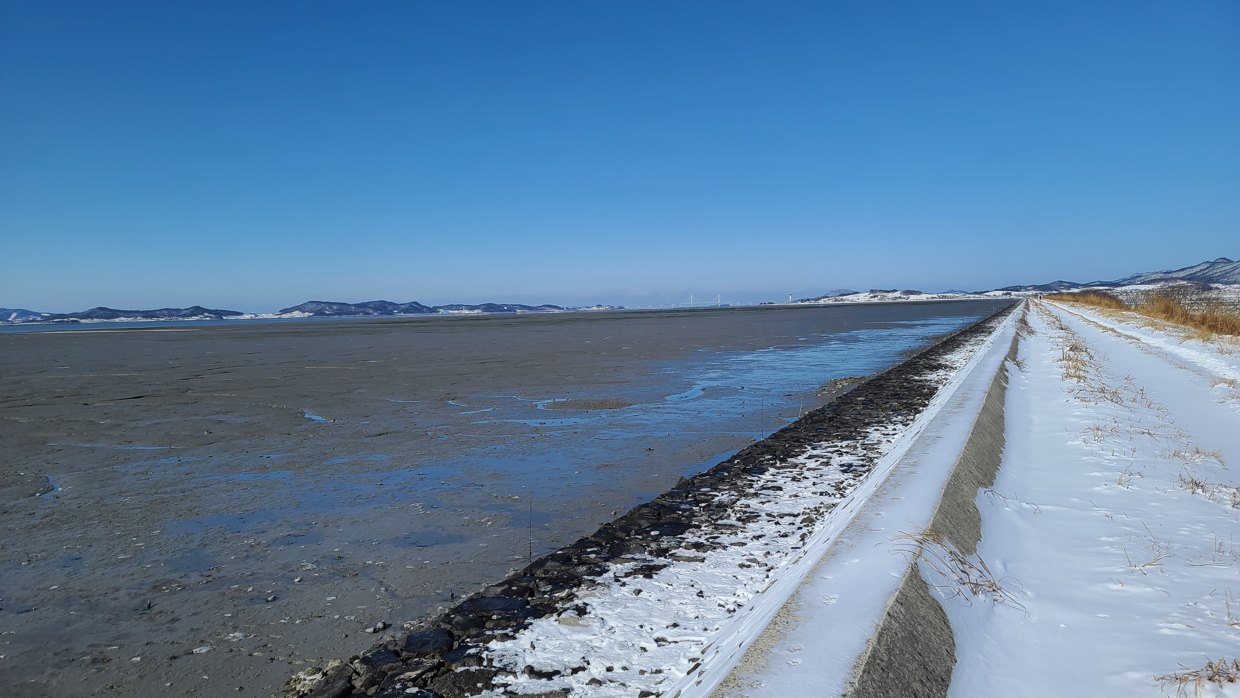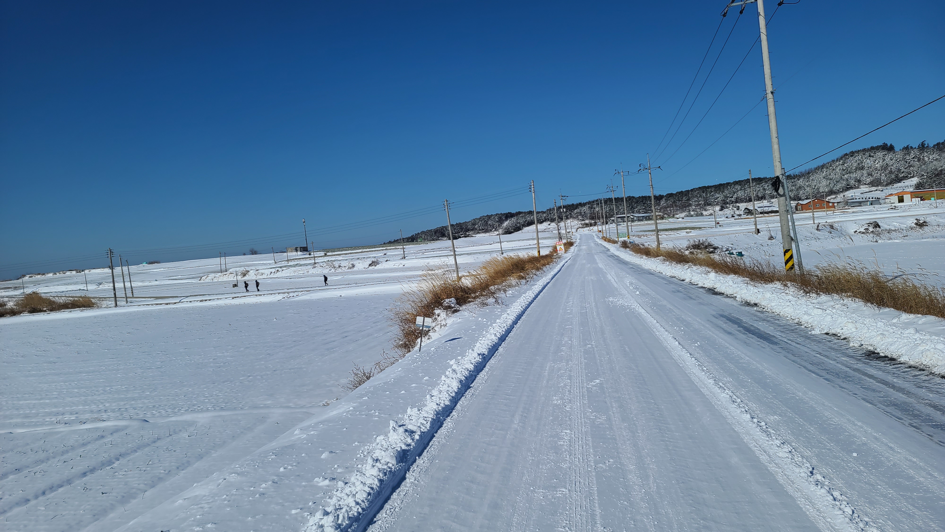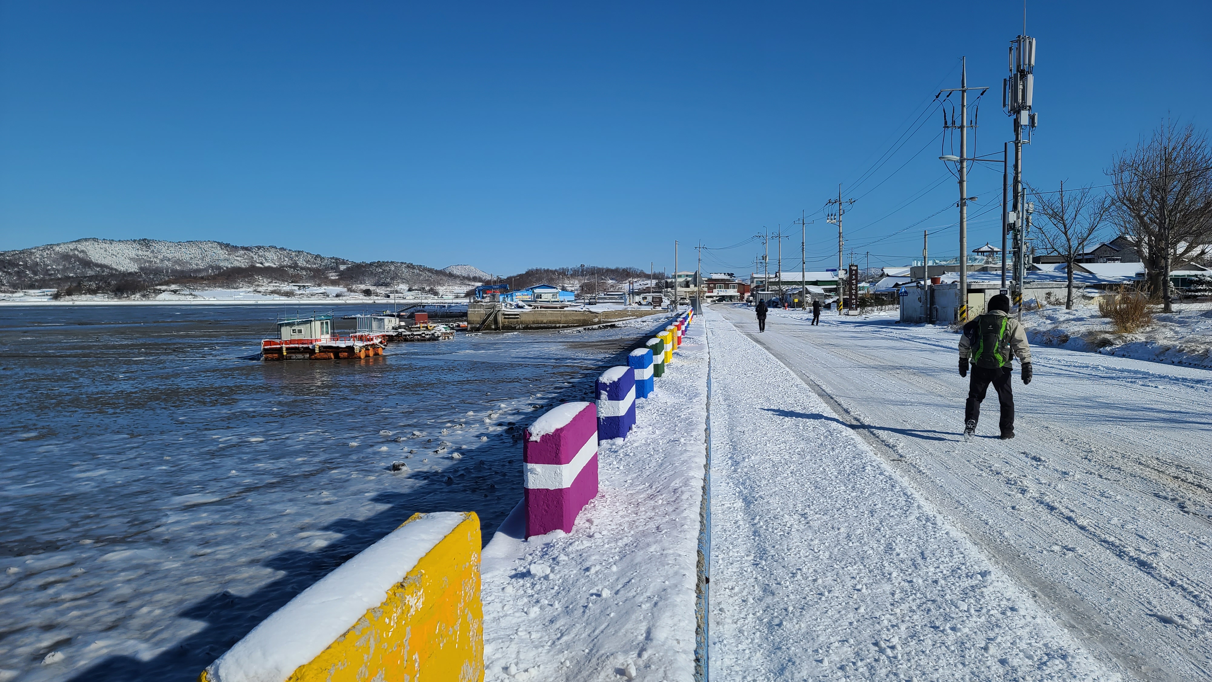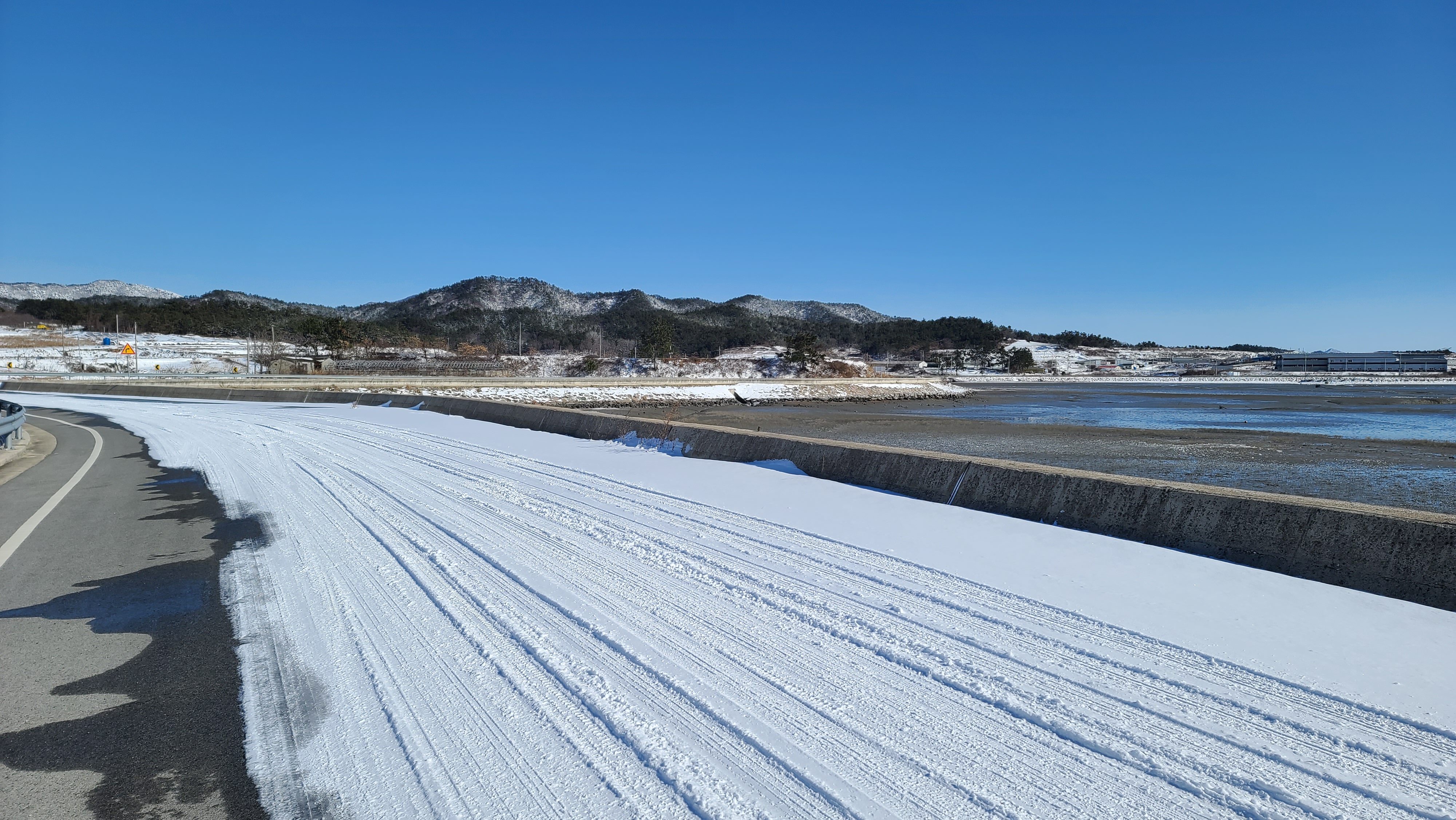 함해만 동쪽을 흐르는 산세는 높지 않고 나즈막한 산들이 이어지며, 해안과 산줄기 사이에 들녘이 펼쳐져 있다. 탐방하는 날은 운이 좋았는지, 눈 쌓인 산줄기와 눈 덮인 들녘이 투명한 겨울 햇빛을 받으며 거칠 것이 없이 탁트였다. 겨울산의 고적이 솟아오르고 겨울들녘의 평화가 펼쳐져 함해만 바다와 멋지게 어우러졌다. 그 중에서도 산남리의 들녘, 월천리의 들녘, 학산리의 들녘이 가슴에 새겨져 있다. 뒤에는 나즈막한 산맥이 흐르고, 앞에는 드넓은 평야가 펼쳐져 있는 마을들이 이웃하여 오손도손 자리하고 있다. 바람은은 들녘을 가로질러 바다를 건너 함해만 서쪽으로 불어가고 철새는 바다를 건너와 마을 앞 들녘의 하늘로 날아온다. 햇빛은 물 들어오는 바다에서 눈부시게 빛나고 물새들이 한가로이 유영을 즐긴다. 이 평화의 세상, 소박함이 그곳에 있으며 근면과 검소가 그곳에 있다. 긴 거리의 트레킹에 허우적거리다가 화려하지 않으나 빛나는 이 풍경의 아름다움에 길손은 벅차다.