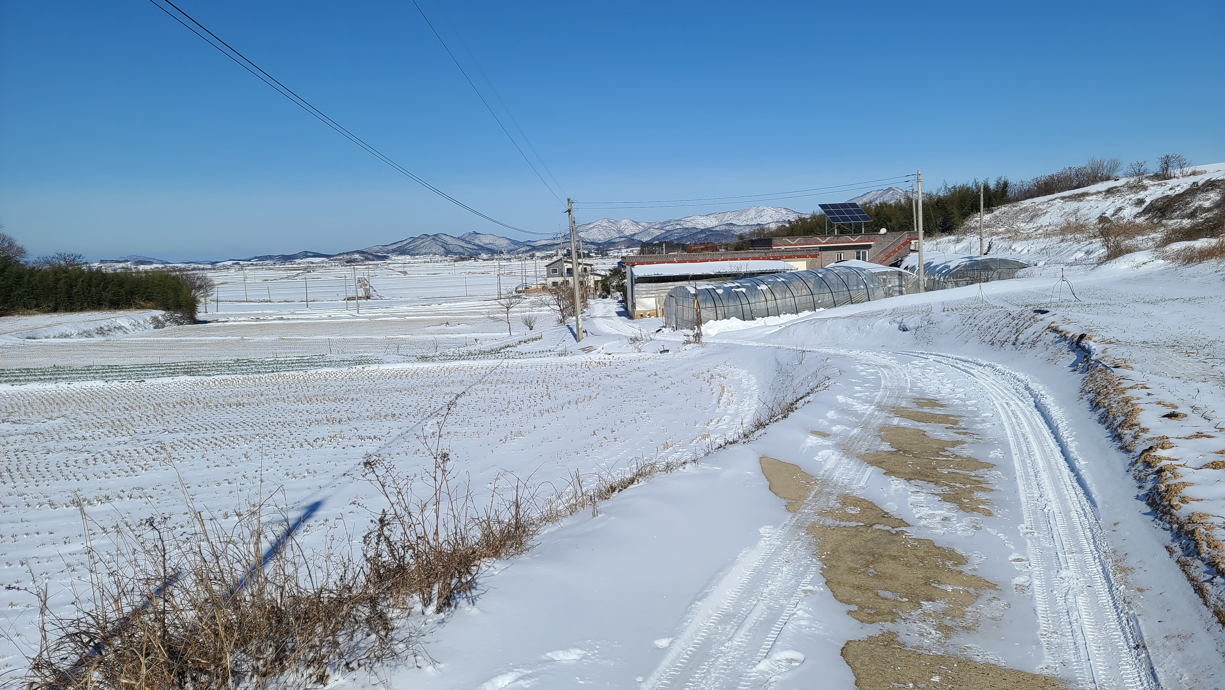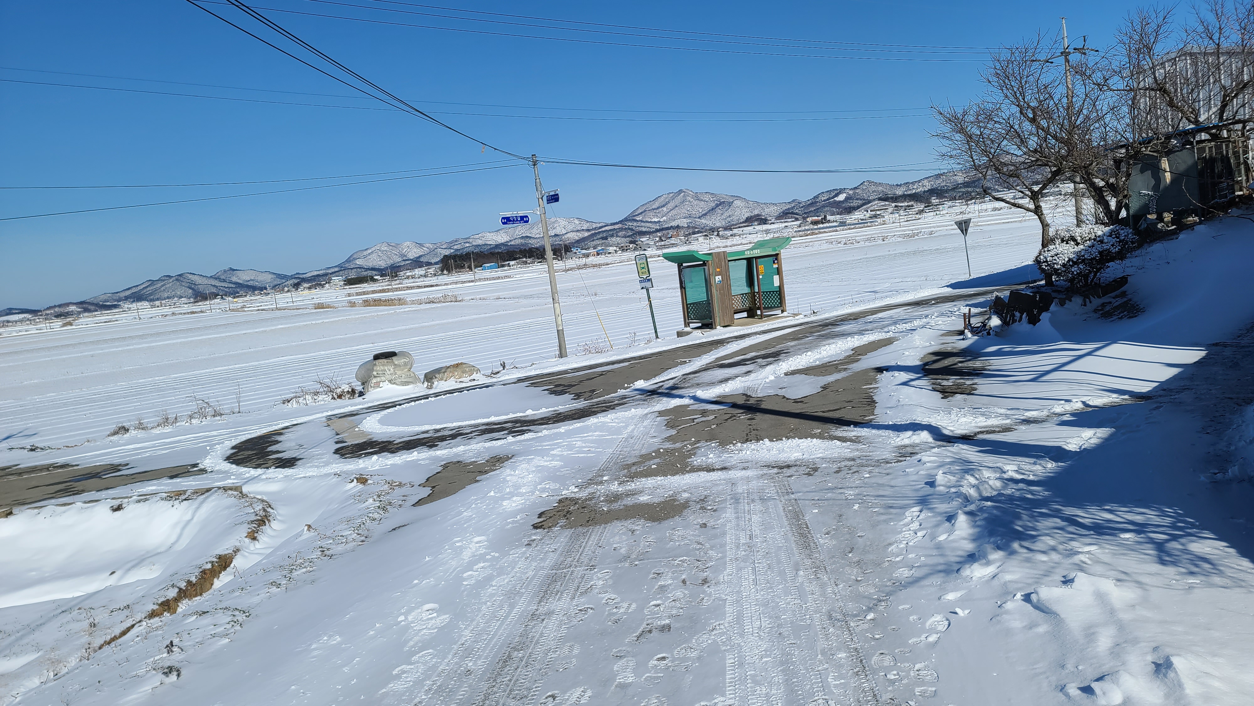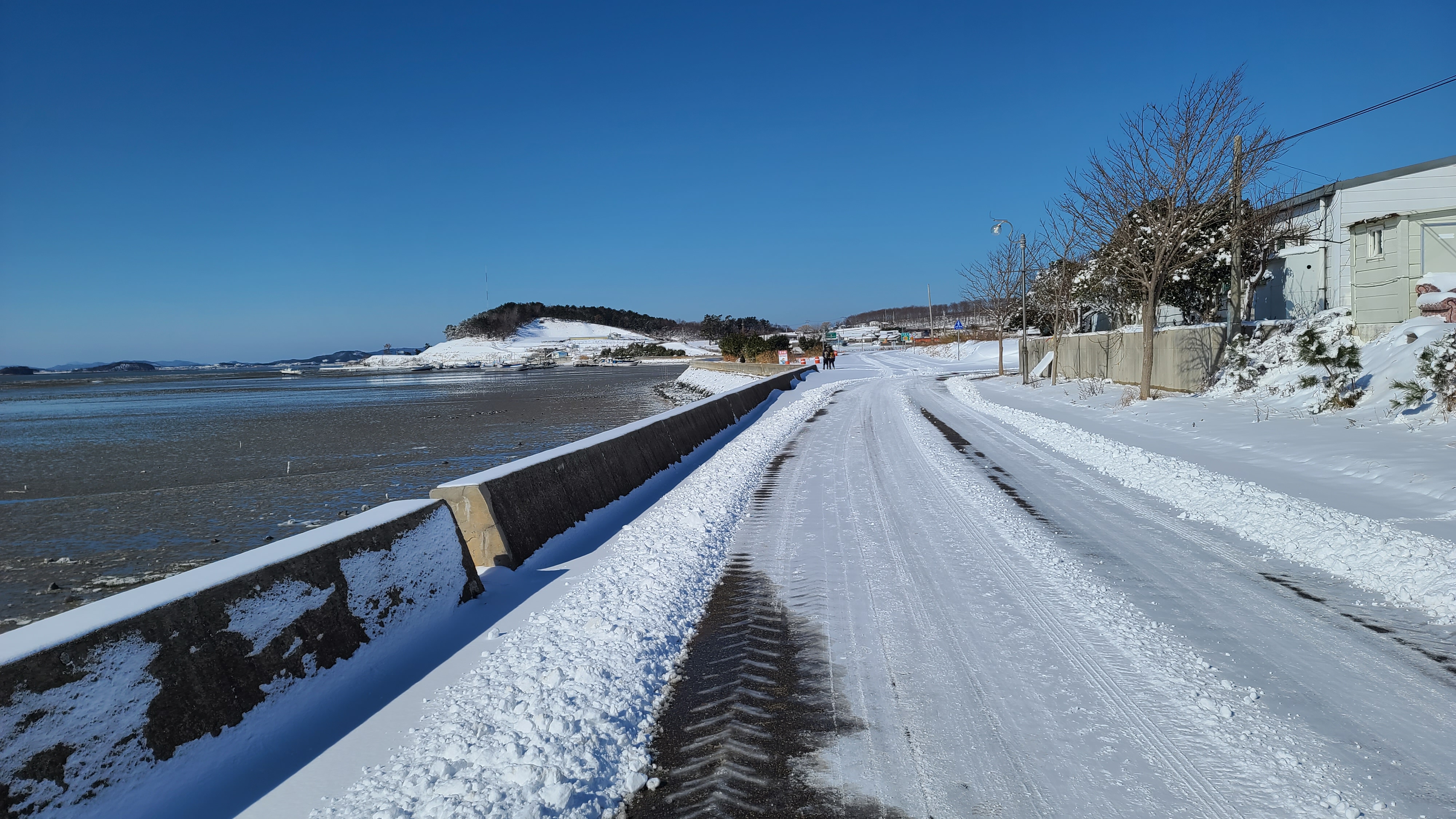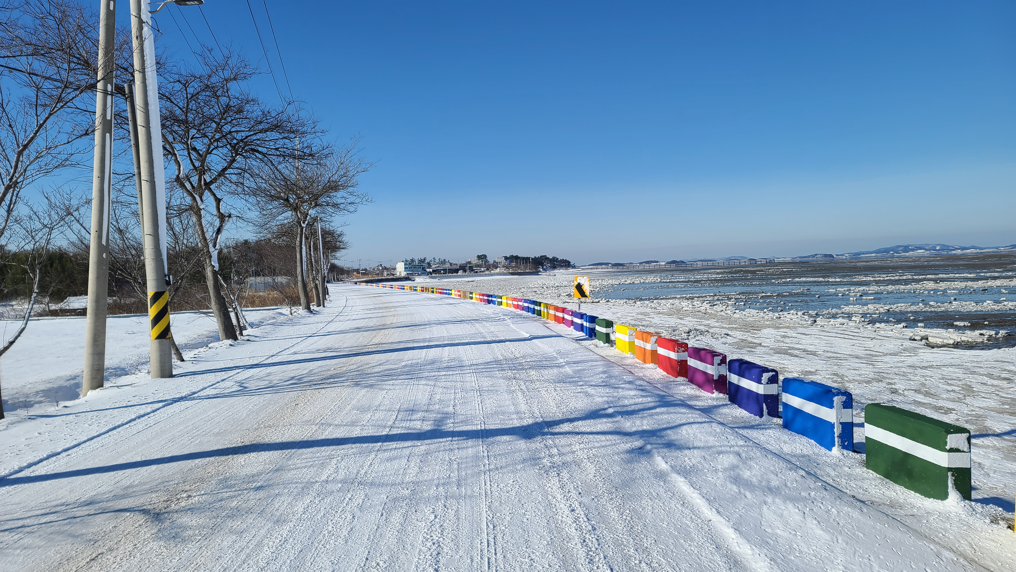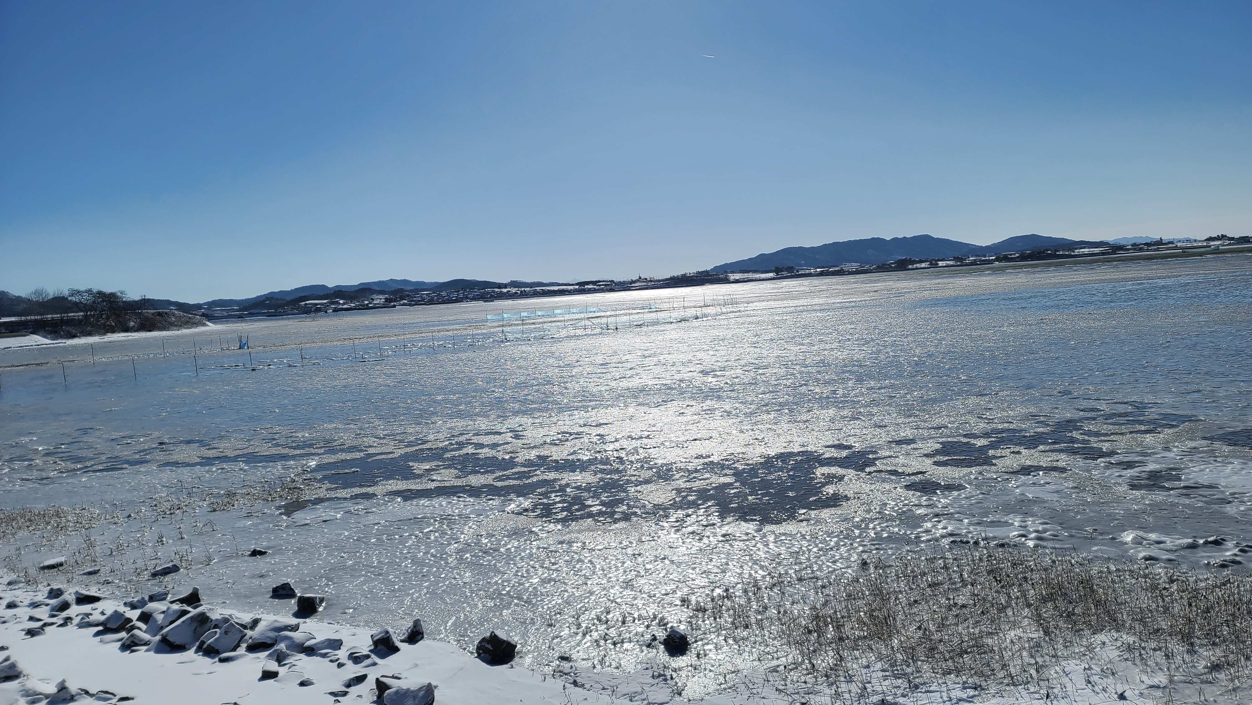 함해만 동쪽을 흐르는 산세는 높지 않고 나즈막한 산들이 이어지며, 해안과 산줄기 사이에 들녘이 펼쳐져 있다. 탐방하는 날은 운이 좋았는지, 눈 쌓인 산줄기와 눈 덮인 들녘이 투명한 겨울 햇빛을 받으며 거칠 것이 없이 탁트였다. 겨울산의 고적이 솟아오르고 겨울들녘의 평화가 펼쳐져 함해만 바다와 멋지게 어우러졌다. 그 중에서도 산남리의 들녘, 월천리의 들녘, 학산리의 들녘이 가슴에 새겨져 있다. 뒤에는 나즈막한 산맥이 흐르고, 앞에는 드넓은 평야가 펼쳐져 있는 마을들이 이웃하여 오손도손 자리하고 있다. 바람은은 들녘을 가로질러 바다를 건너 함해만 서쪽으로 불어가고 철새는 바다를 건너와 마을 앞 들녘의 하늘로 날아온다. 햇빛은 물 들어오는 바다에서 눈부시게 빛나고 물새들이 한가로이 유영을 즐긴다. 이 평화의 세상, 소박함이 그곳에 있으며 근면과 검소가 그곳에 있다. 긴 거리의 트레킹에 허우적거리다가 화려하지 않으나 빛나는 이 풍경의 아름다움에 길손은 벅차다.