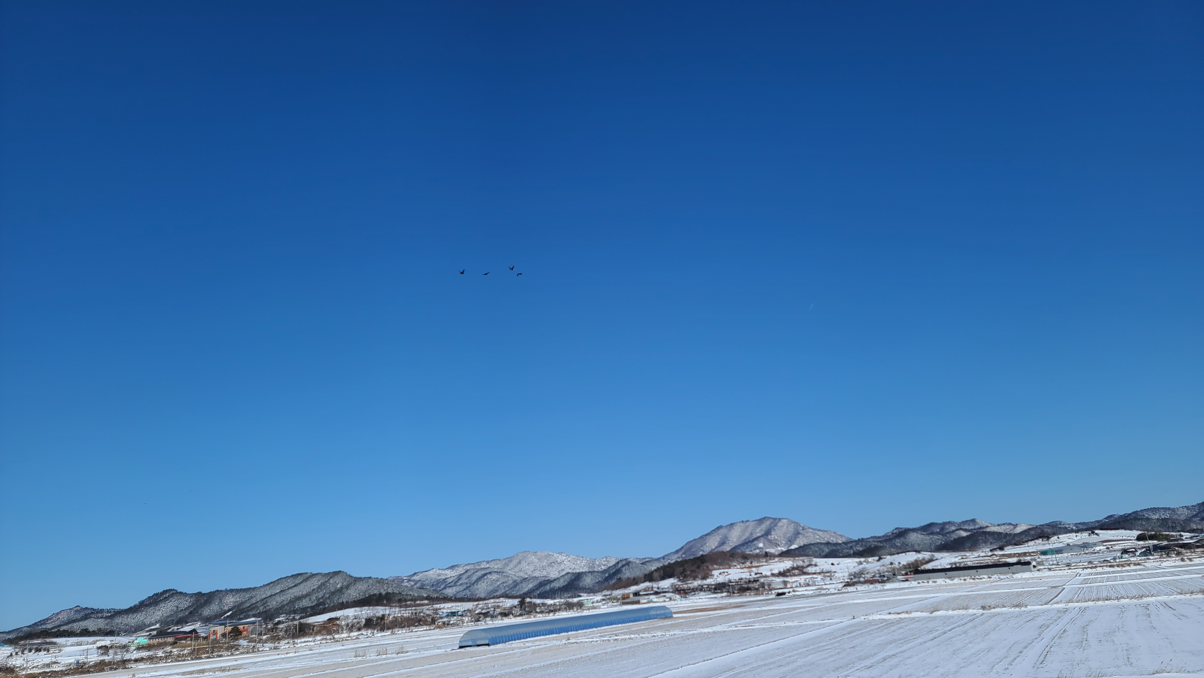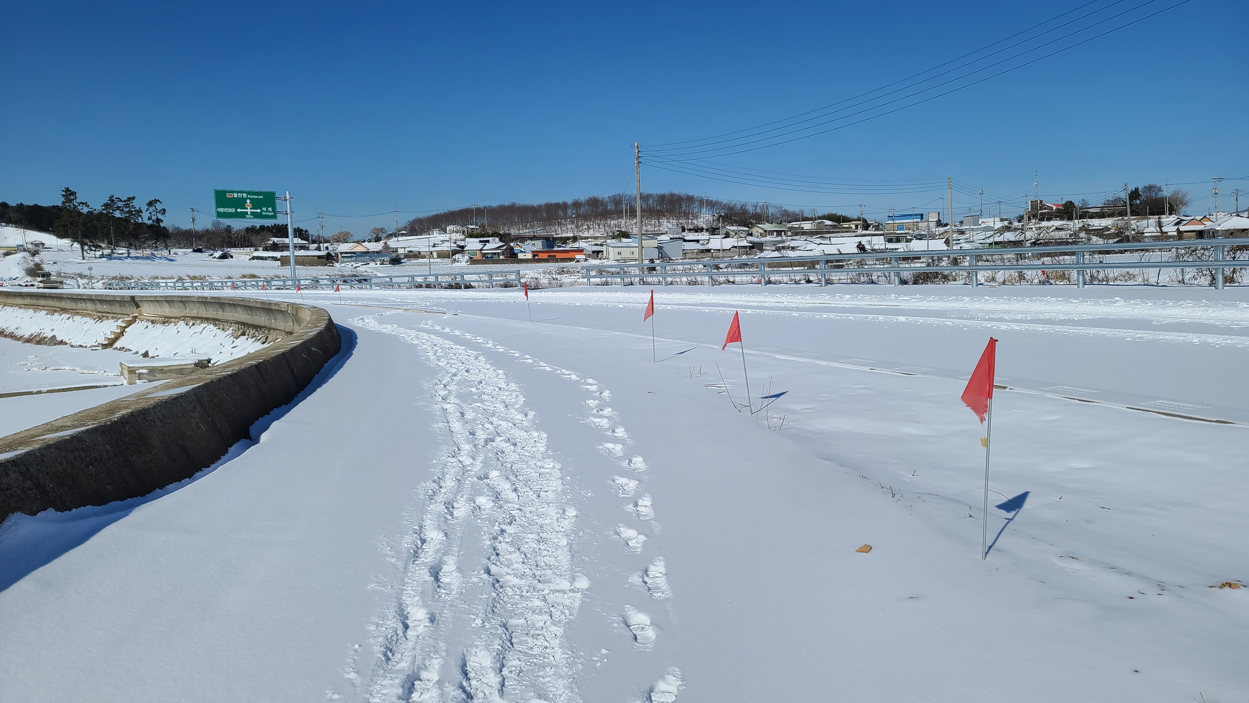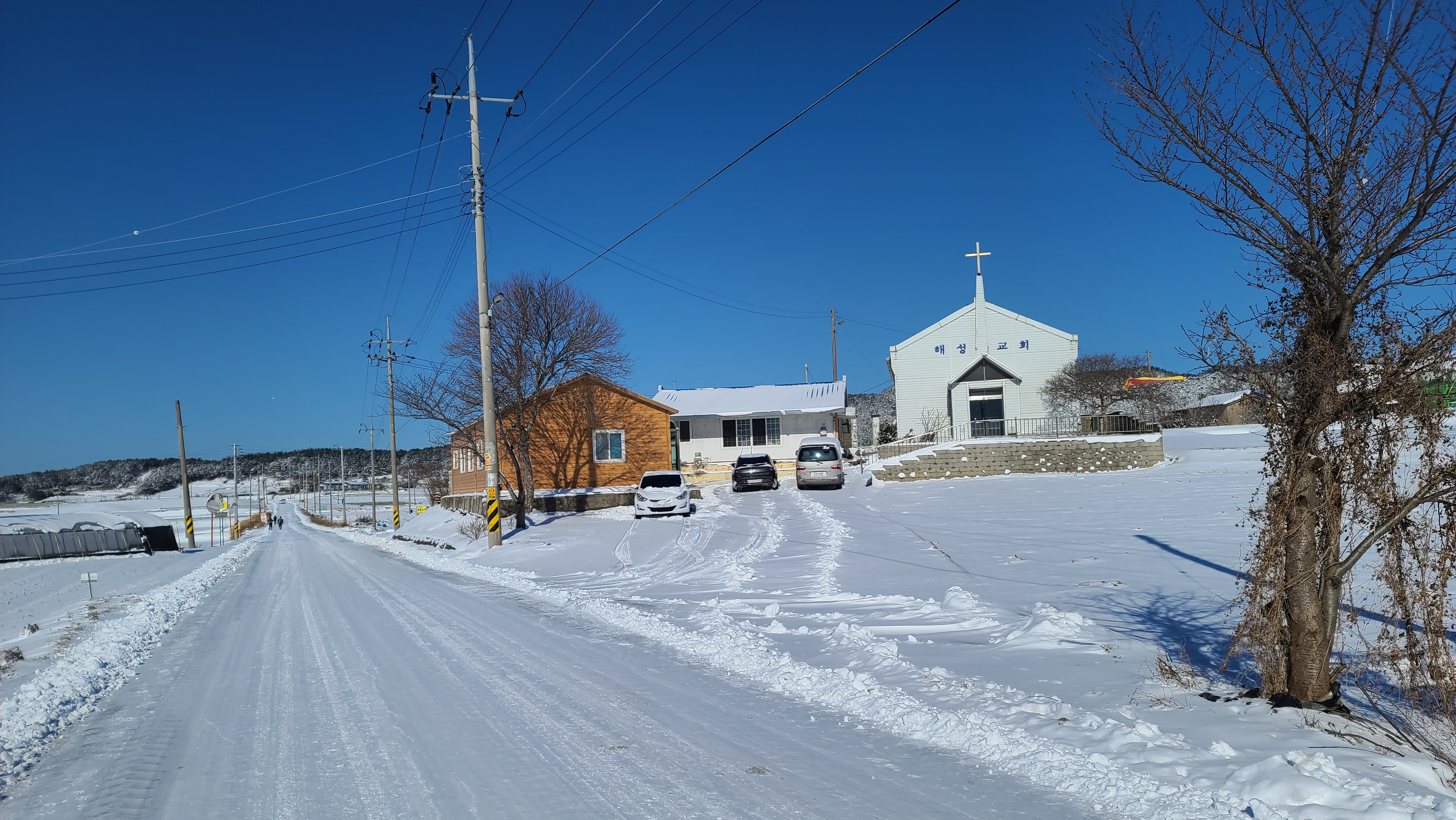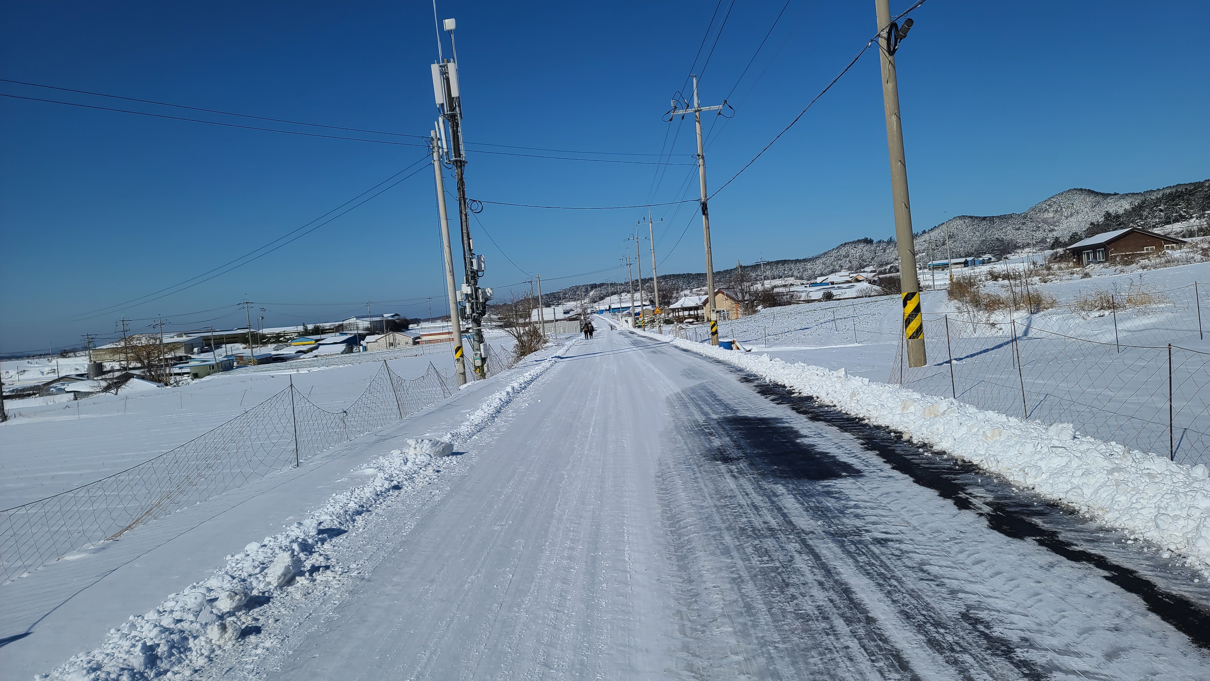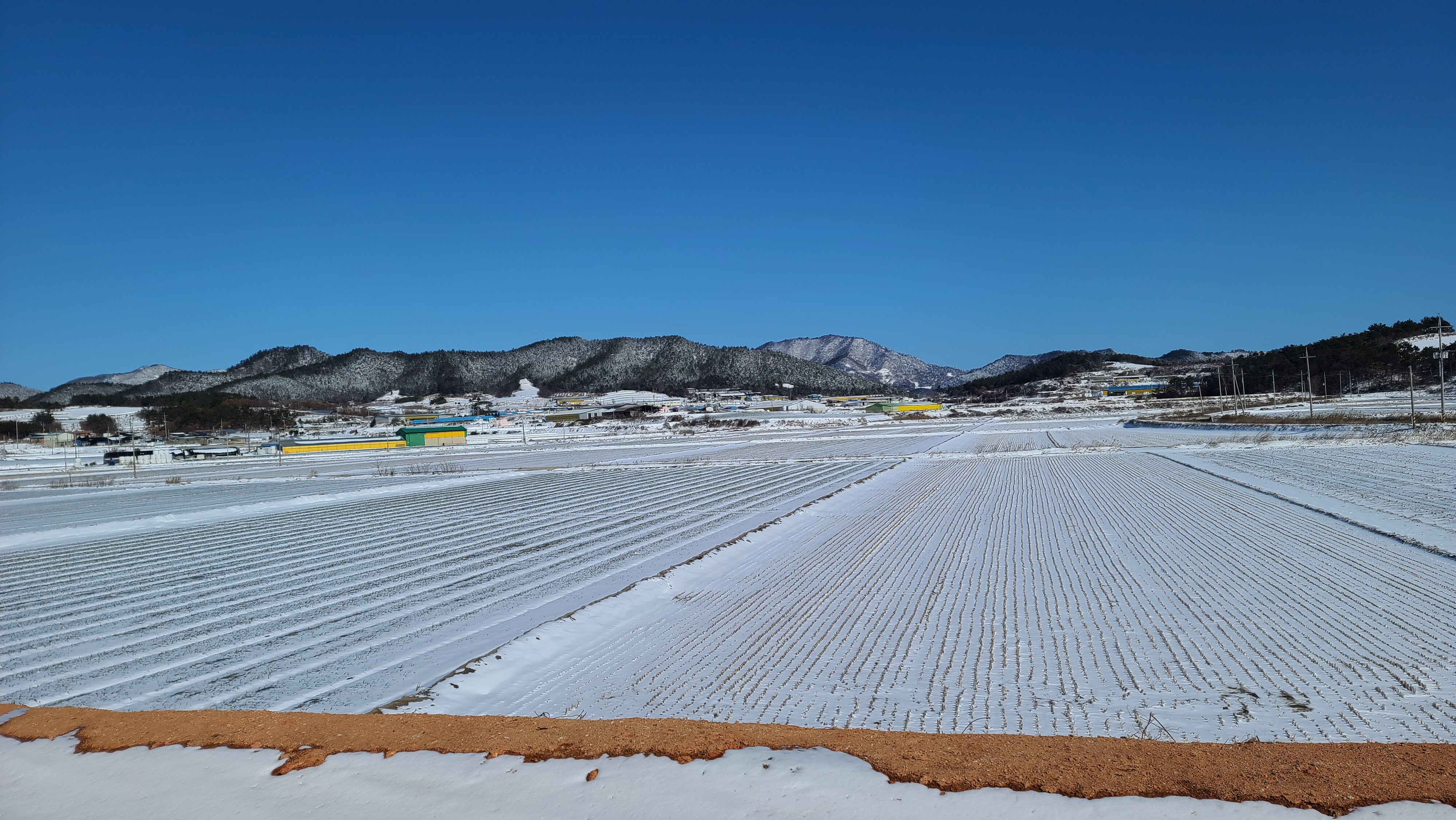 함해만 동쪽을 흐르는 산세는 높지 않고 나즈막한 산들이 이어지며, 해안과 산줄기 사이에 들녘이 펼쳐져 있다. 탐방하는 날은 운이 좋았는지, 눈 쌓인 산줄기와 눈 덮인 들녘이 투명한 겨울 햇빛을 받으며 거칠 것이 없이 탁트였다. 겨울산의 고적이 솟아오르고 겨울들녘의 평화가 펼쳐져 함해만 바다와 멋지게 어우러졌다. 그 중에서도 산남리의 들녘, 월천리의 들녘, 학산리의 들녘이 가슴에 새겨져 있다. 뒤에는 나즈막한 산맥이 흐르고, 앞에는 드넓은 평야가 펼쳐져 있는 마을들이 이웃하여 오손도손 자리하고 있다. 바람은은 들녘을 가로질러 바다를 건너 함해만 서쪽으로 불어가고 철새는 바다를 건너와 마을 앞 들녘의 하늘로 날아온다. 햇빛은 물 들어오는 바다에서 눈부시게 빛나고 물새들이 한가로이 유영을 즐긴다. 이 평화의 세상, 소박함이 그곳에 있으며 근면과 검소가 그곳에 있다. 긴 거리의 트레킹에 허우적거리다가 화려하지 않으나 빛나는 이 풍경의 아름다움에 길손은 벅차다.