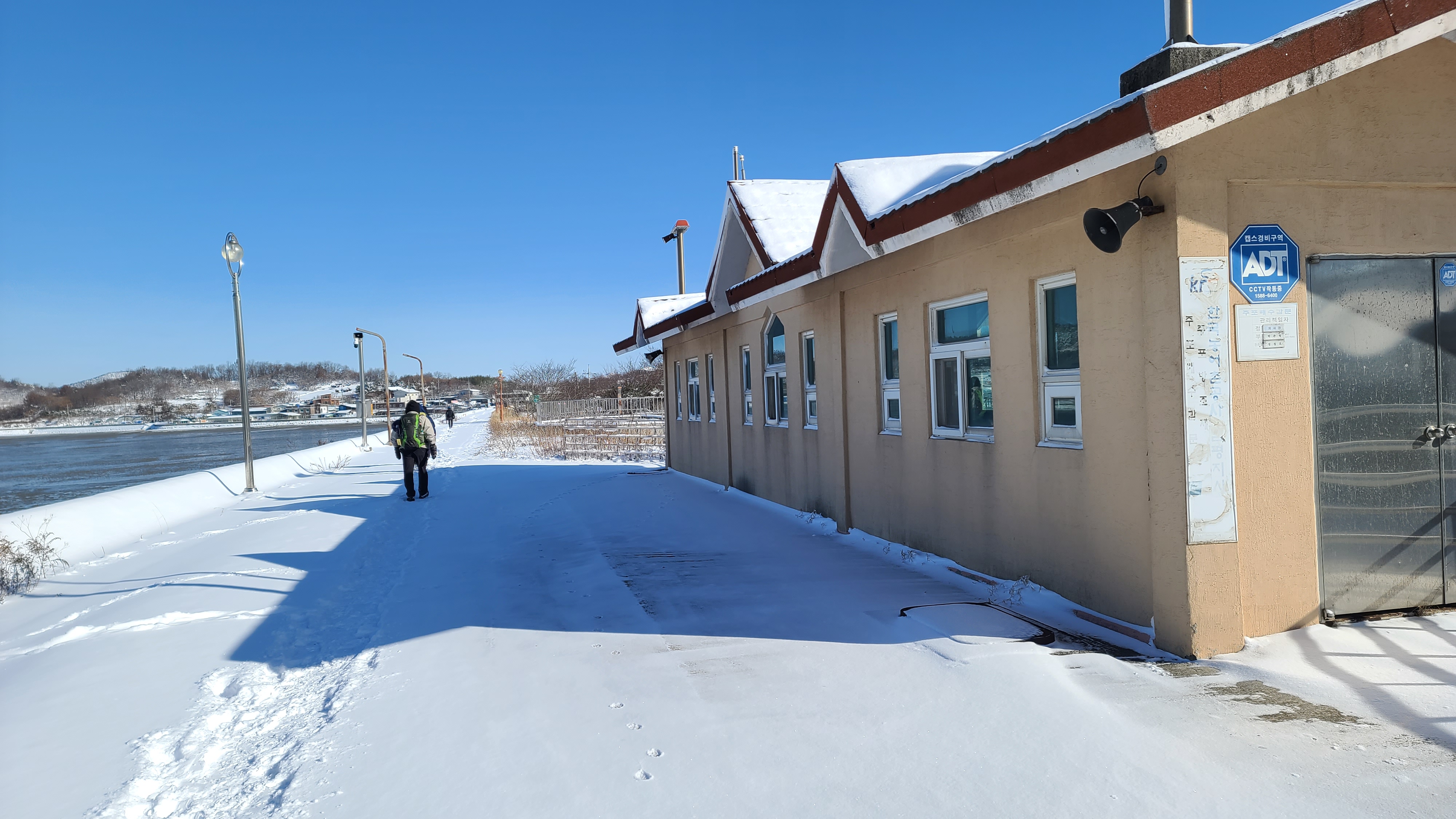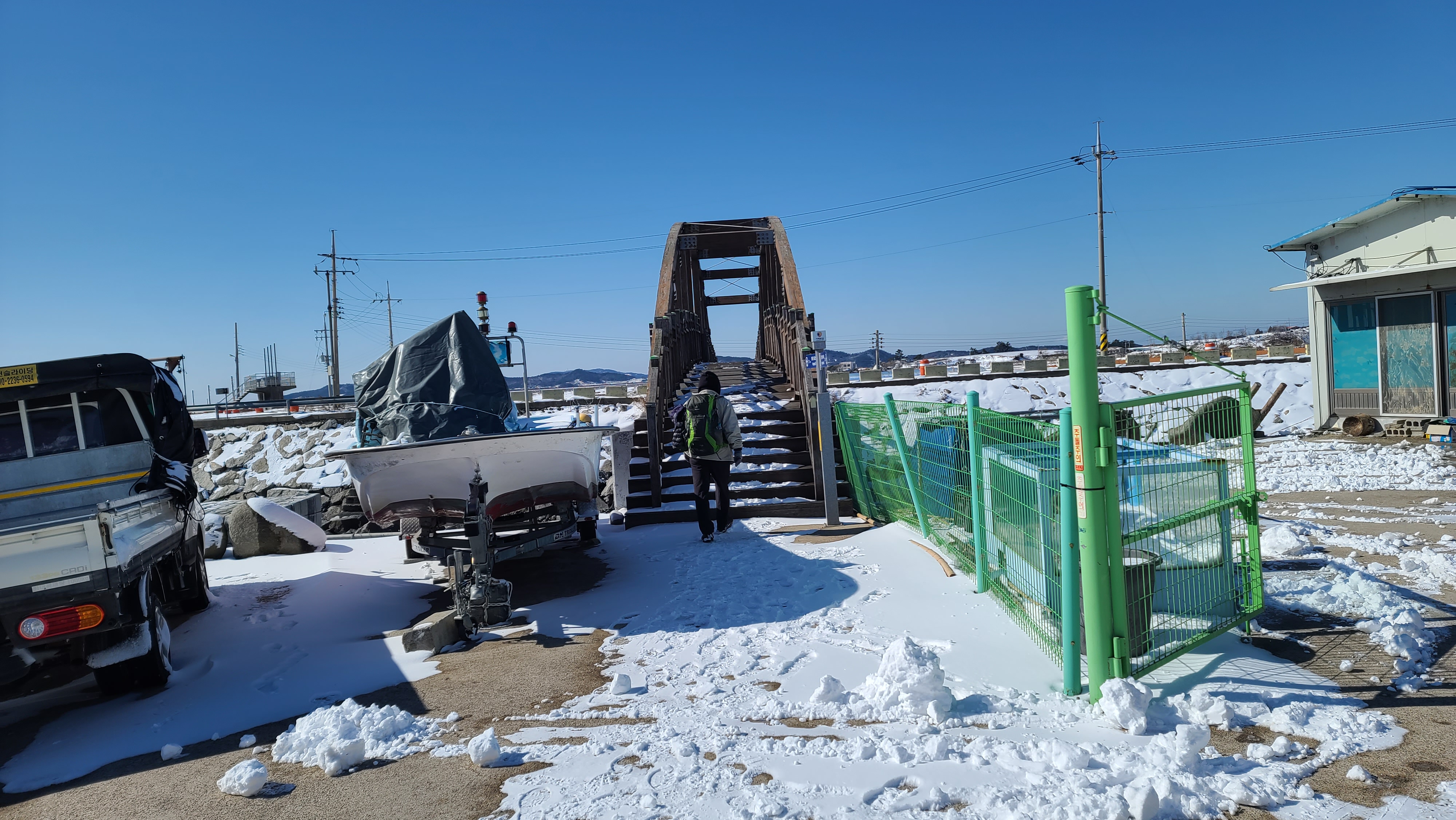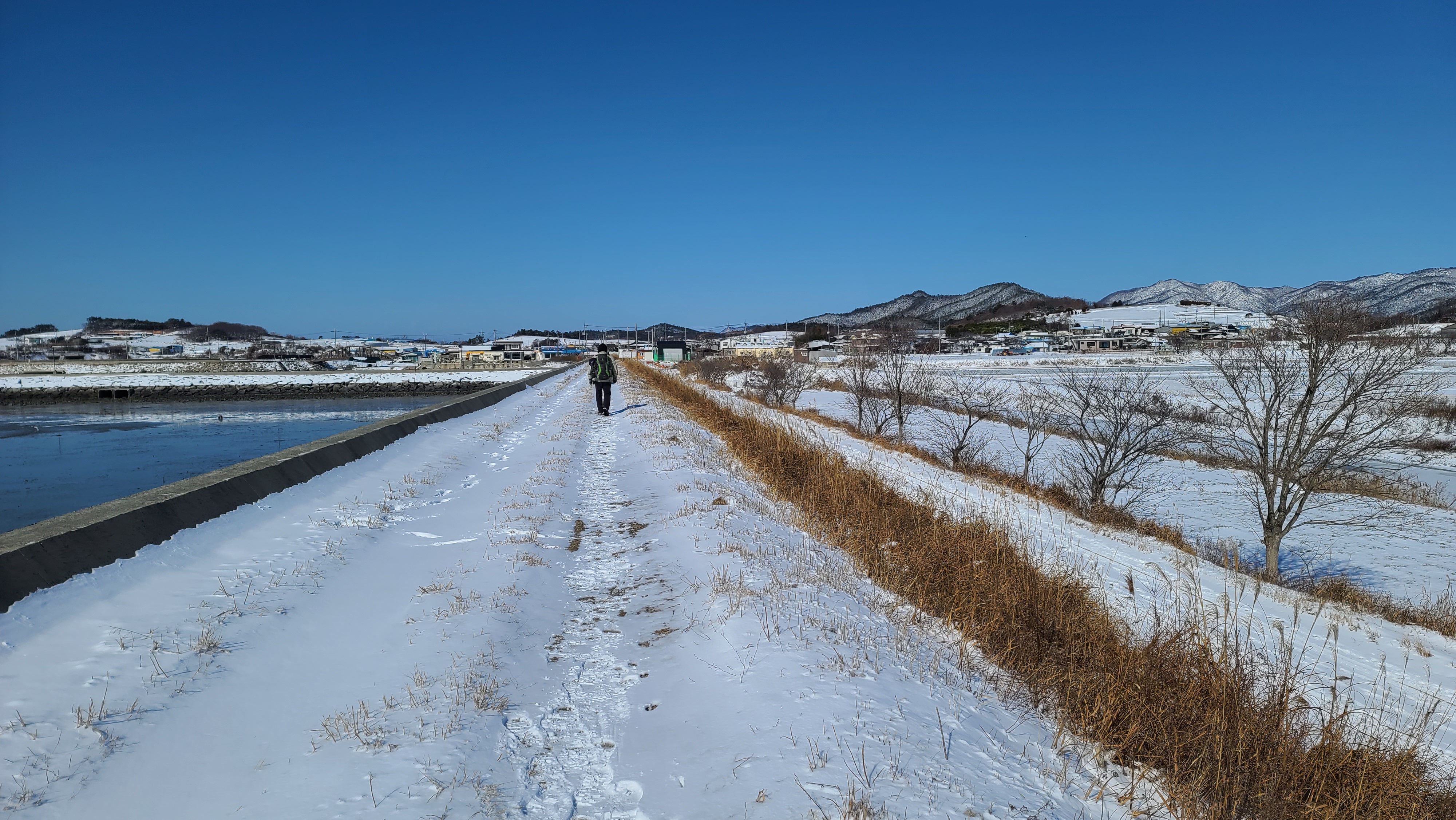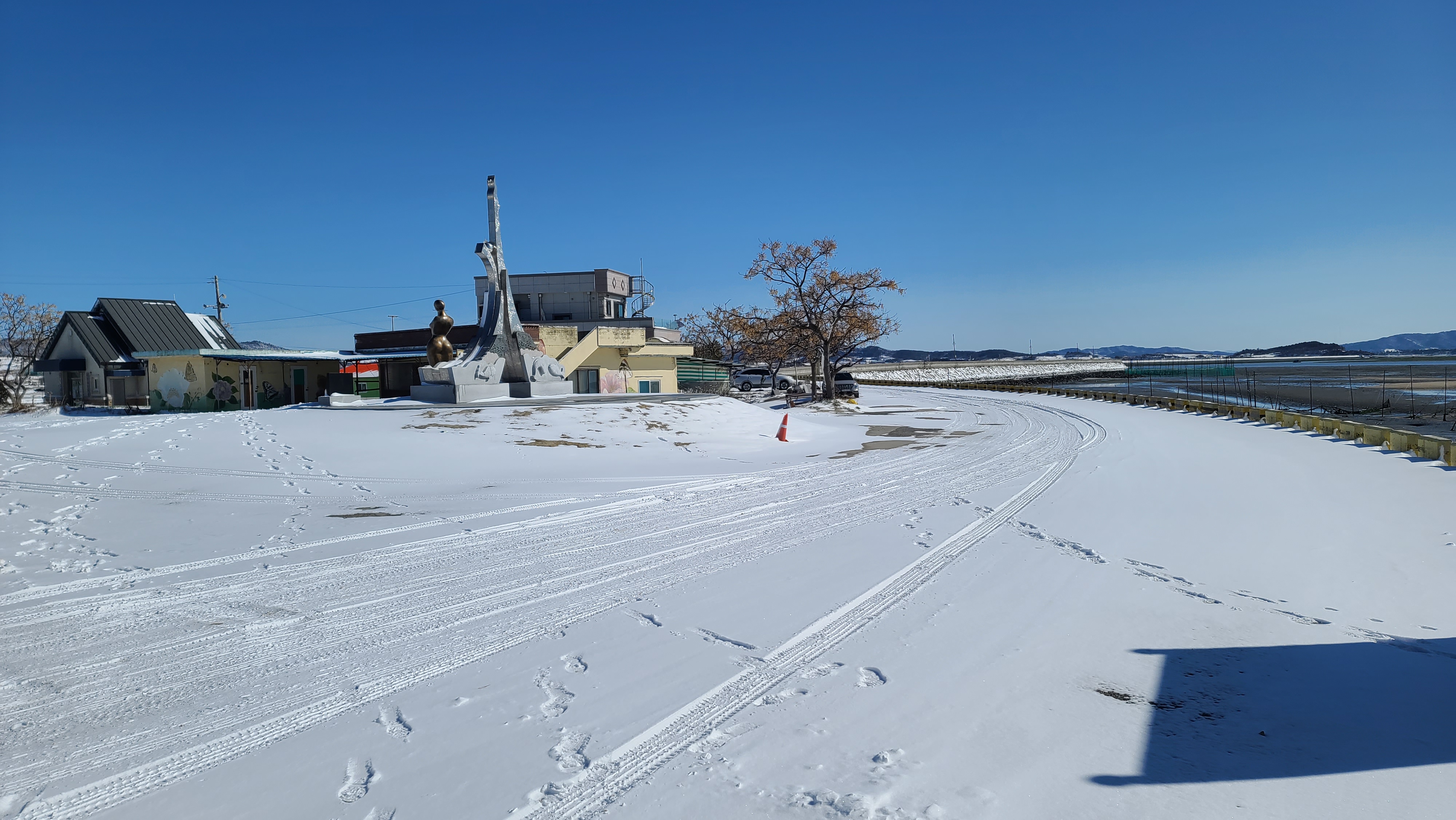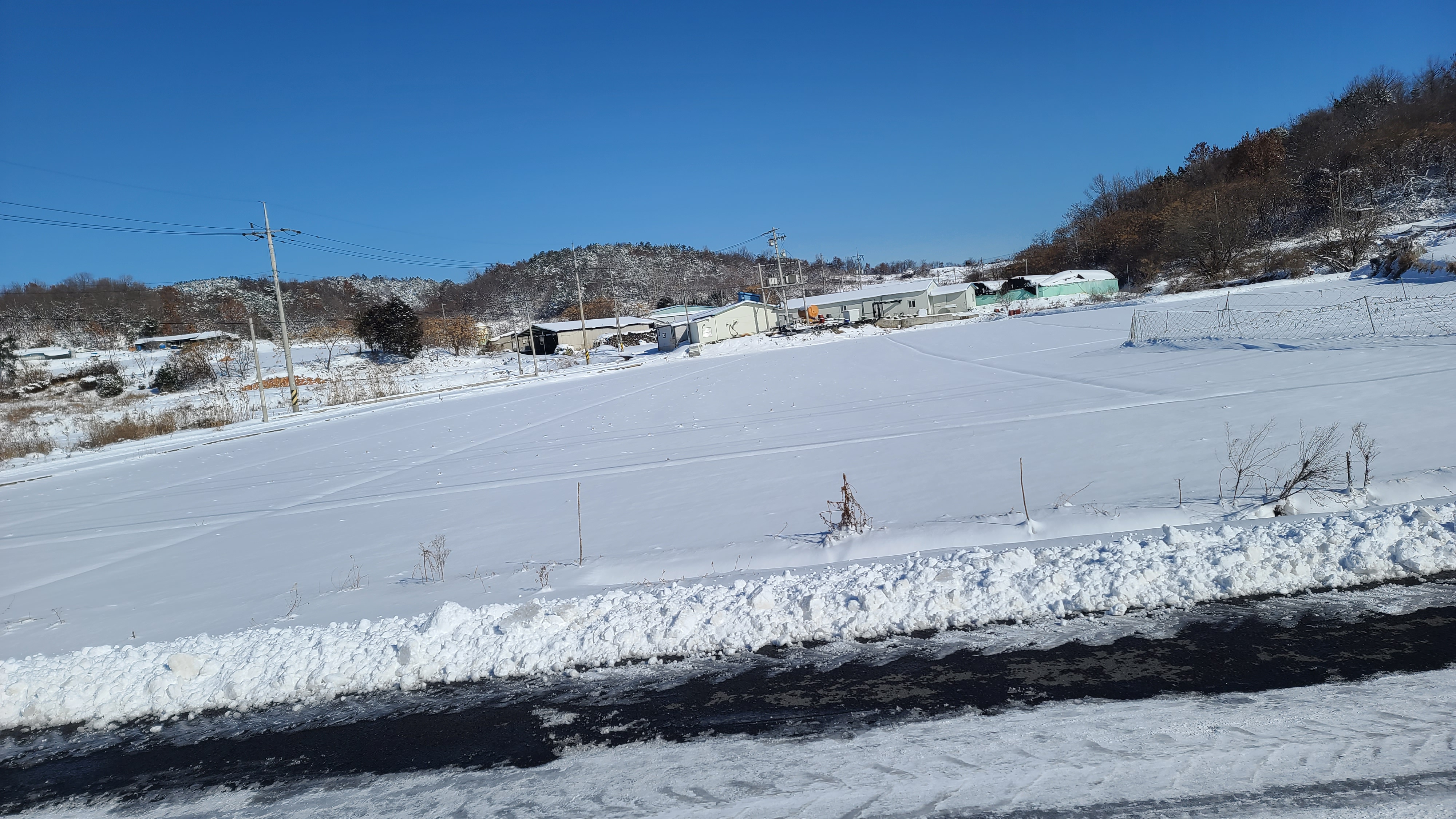 함해만 동쪽을 흐르는 산세는 높지 않고 나즈막한 산들이 이어지며, 해안과 산줄기 사이에 들녘이 펼쳐져 있다. 탐방하는 날은 운이 좋았는지, 눈 쌓인 산줄기와 눈 덮인 들녘이 투명한 겨울 햇빛을 받으며 거칠 것이 없이 탁트였다. 겨울산의 고적이 솟아오르고 겨울들녘의 평화가 펼쳐져 함해만 바다와 멋지게 어우러졌다. 그 중에서도 산남리의 들녘, 월천리의 들녘, 학산리의 들녘이 가슴에 새겨져 있다. 뒤에는 나즈막한 산맥이 흐르고, 앞에는 드넓은 평야가 펼쳐져 있는 마을들이 이웃하여 오손도손 자리하고 있다. 바람은은 들녘을 가로질러 바다를 건너 함해만 서쪽으로 불어가고 철새는 바다를 건너와 마을 앞 들녘의 하늘로 날아온다. 햇빛은 물 들어오는 바다에서 눈부시게 빛나고 물새들이 한가로이 유영을 즐긴다. 이 평화의 세상, 소박함이 그곳에 있으며 근면과 검소가 그곳에 있다. 긴 거리의 트레킹에 허우적거리다가 화려하지 않으나 빛나는 이 풍경의 아름다움에 길손은 벅차다.