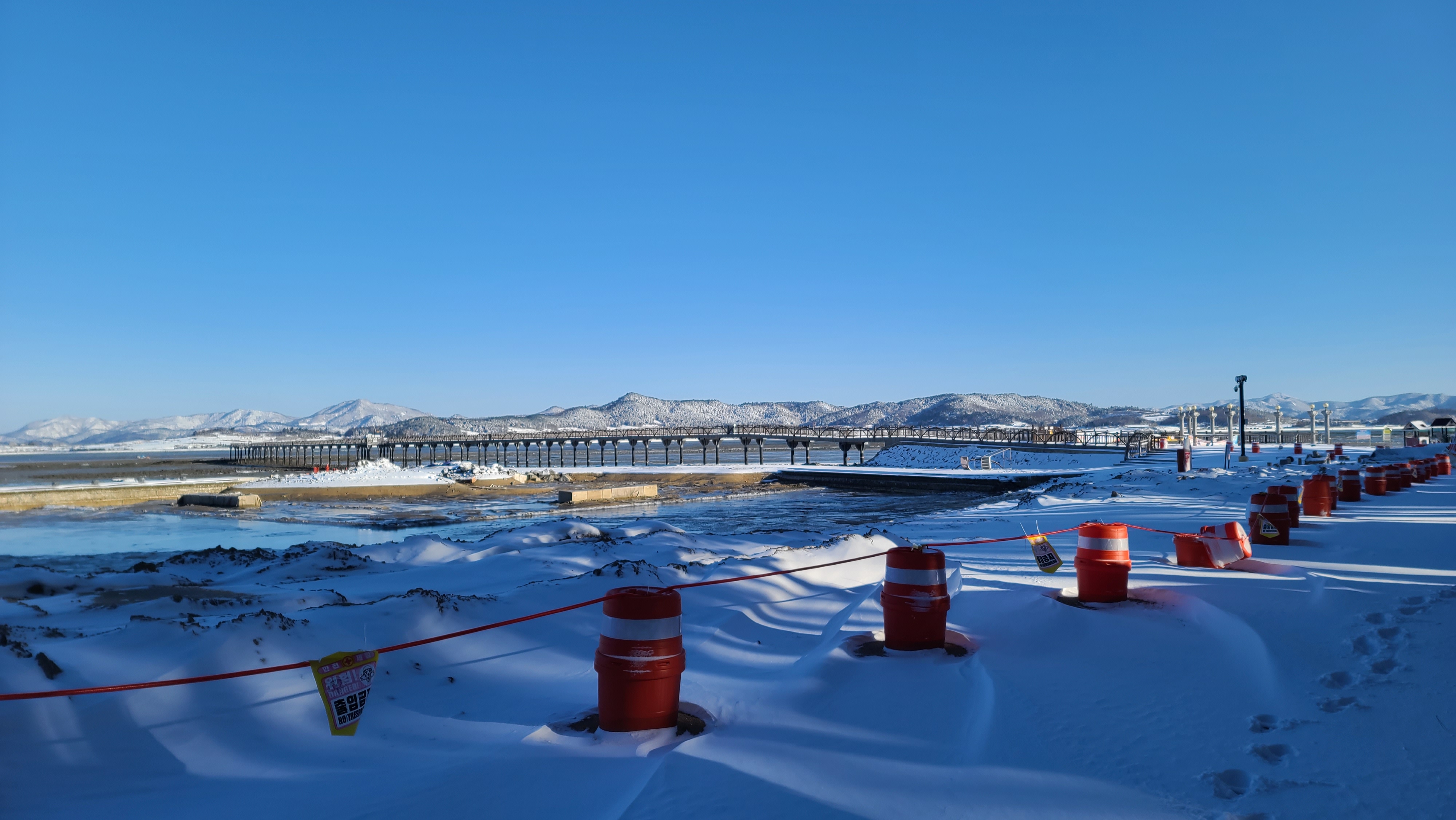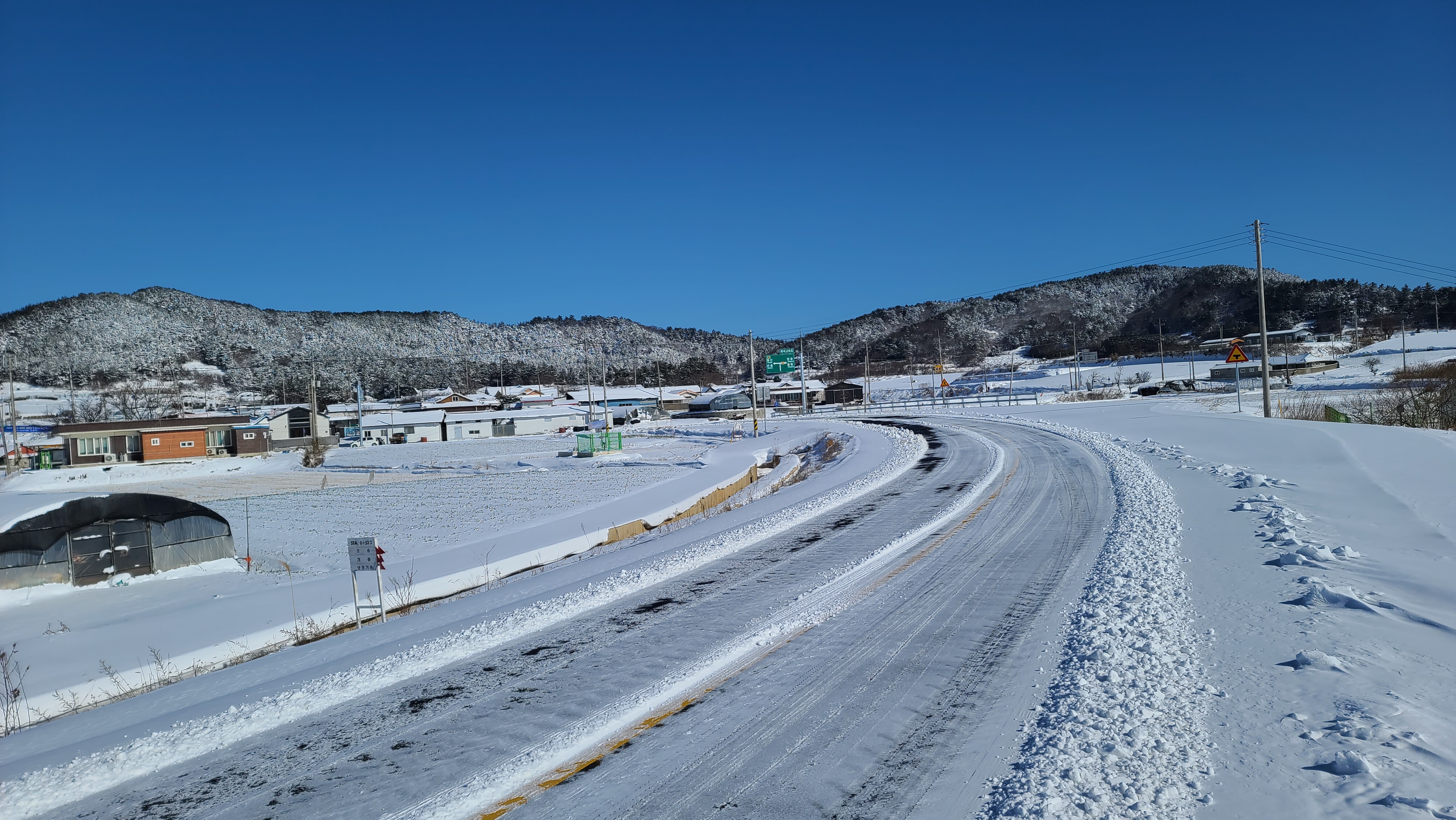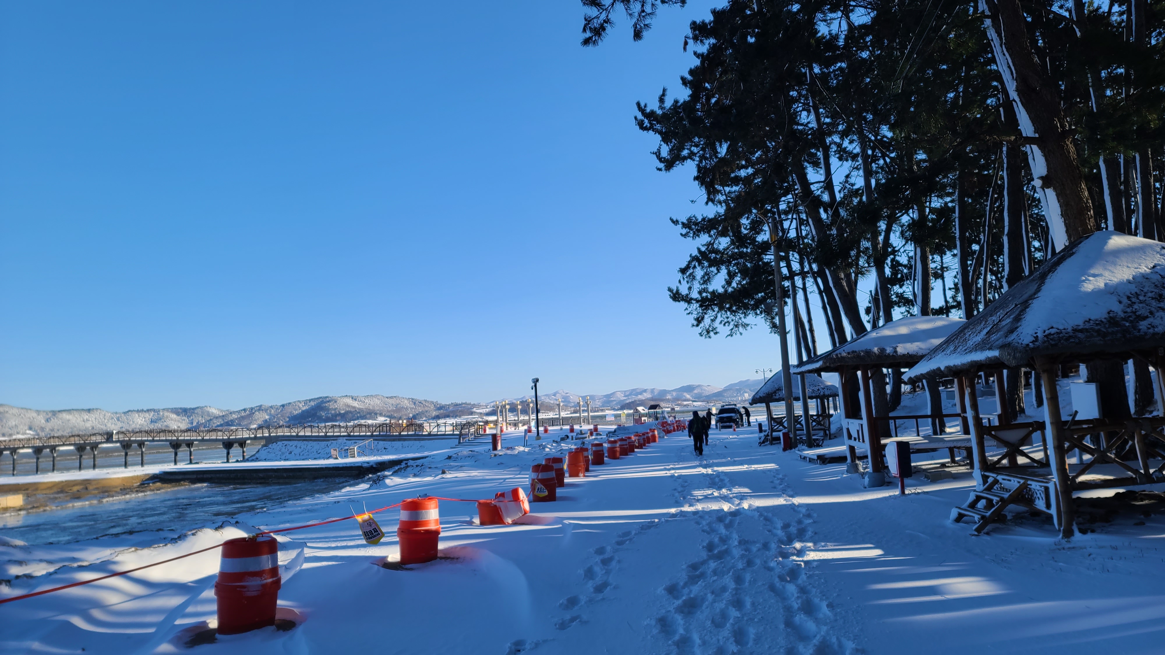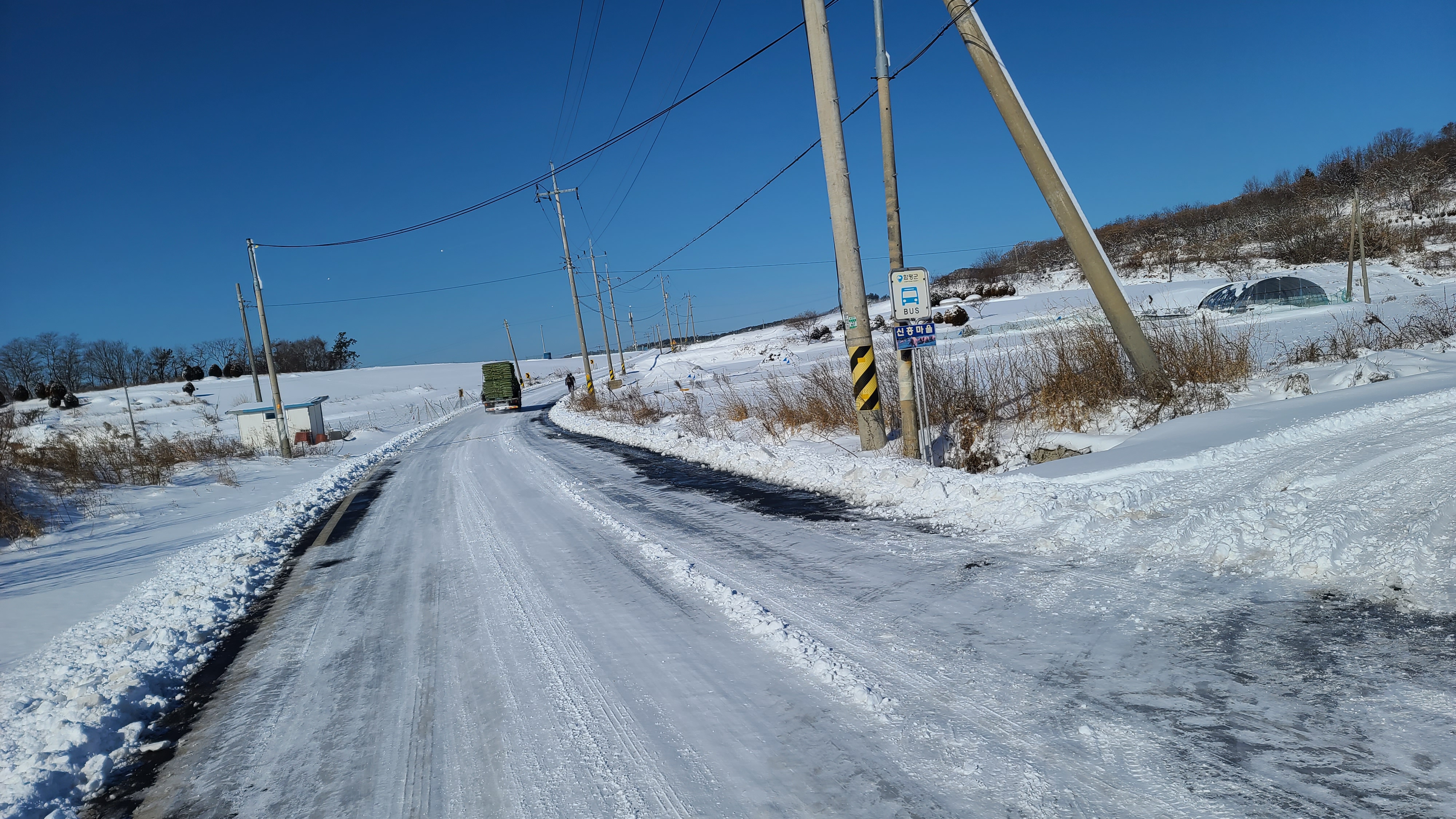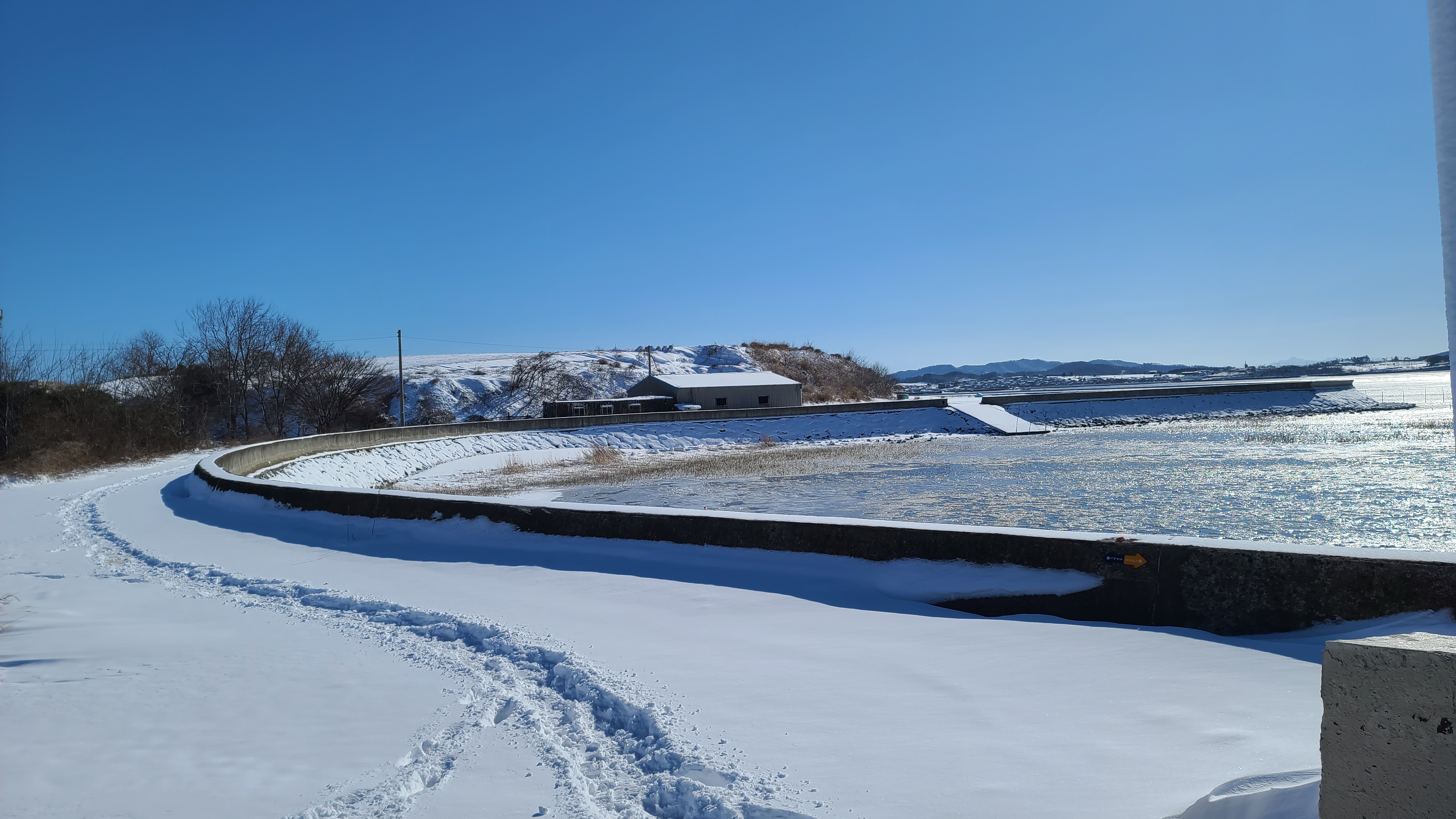 함해만 동쪽을 흐르는 산세는 높지 않고 나즈막한 산들이 이어지며, 해안과 산줄기 사이에 들녘이 펼쳐져 있다. 탐방하는 날은 운이 좋았는지, 눈 쌓인 산줄기와 눈 덮인 들녘이 투명한 겨울 햇빛을 받으며 거칠 것이 없이 탁트였다. 겨울산의 고적이 솟아오르고 겨울들녘의 평화가 펼쳐져 함해만 바다와 멋지게 어우러졌다. 그 중에서도 산남리의 들녘, 월천리의 들녘, 학산리의 들녘이 가슴에 새겨져 있다. 뒤에는 나즈막한 산맥이 흐르고, 앞에는 드넓은 평야가 펼쳐져 있는 마을들이 이웃하여 오손도손 자리하고 있다. 바람은은 들녘을 가로질러 바다를 건너 함해만 서쪽으로 불어가고 철새는 바다를 건너와 마을 앞 들녘의 하늘로 날아온다. 햇빛은 물 들어오는 바다에서 눈부시게 빛나고 물새들이 한가로이 유영을 즐긴다. 이 평화의 세상, 소박함이 그곳에 있으며 근면과 검소가 그곳에 있다. 긴 거리의 트레킹에 허우적거리다가 화려하지 않으나 빛나는 이 풍경의 아름다움에 길손은 벅차다.