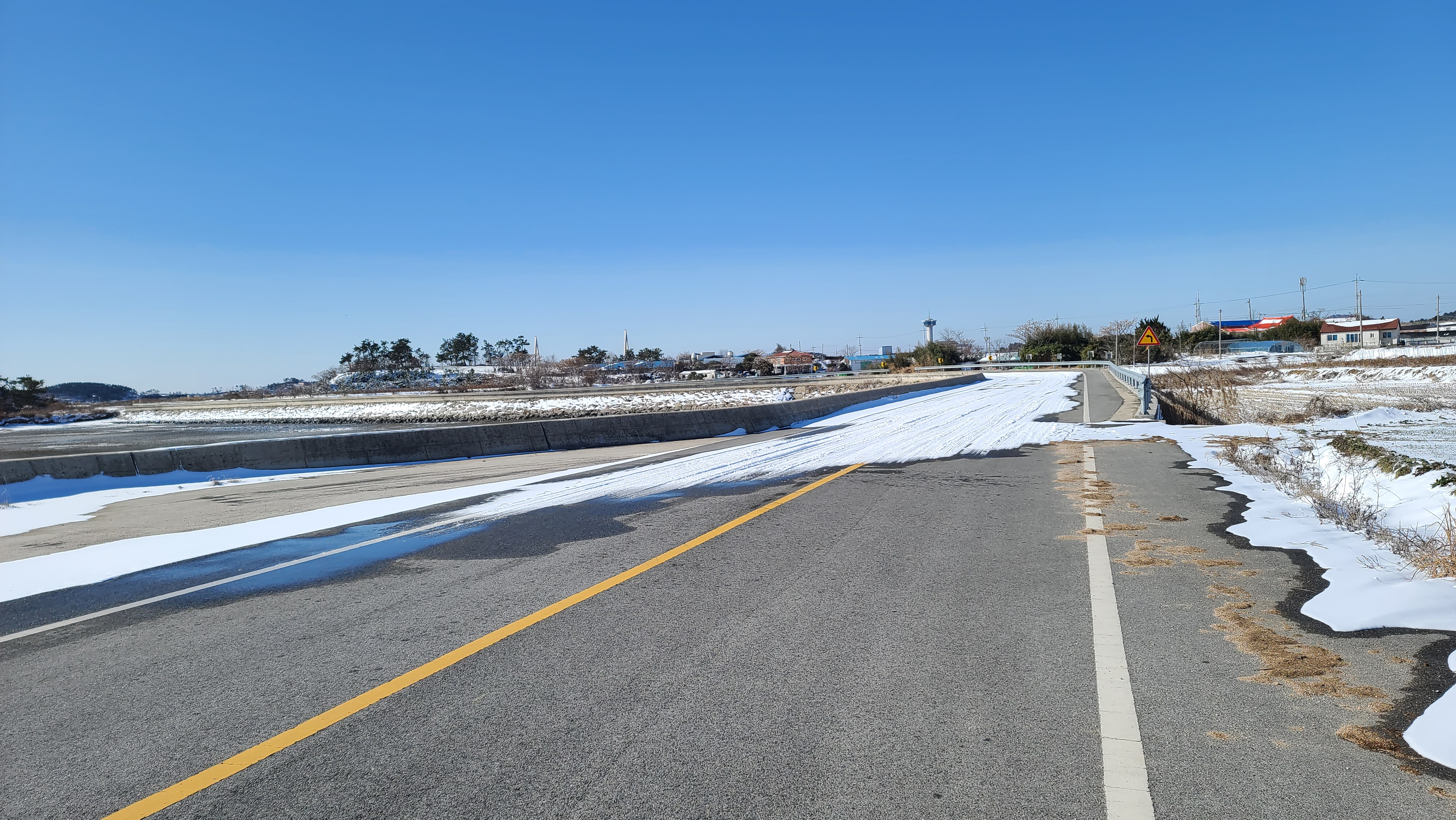 월천방조제를 빙 돌아서 오른쪽 뒤에 보이는 안악마을 앞으로 이어간다.