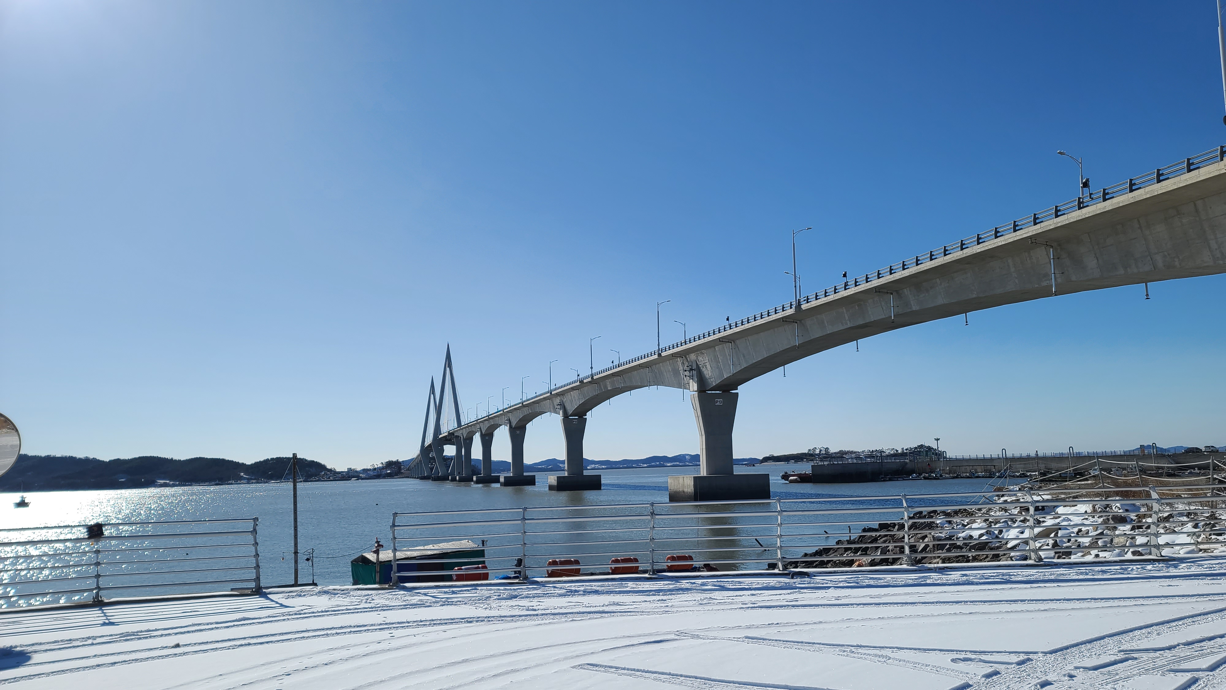 칠산대교와 칠산타워, 향화도 해변을 바라보며 칠산바다의 향화도항으로 향한다.