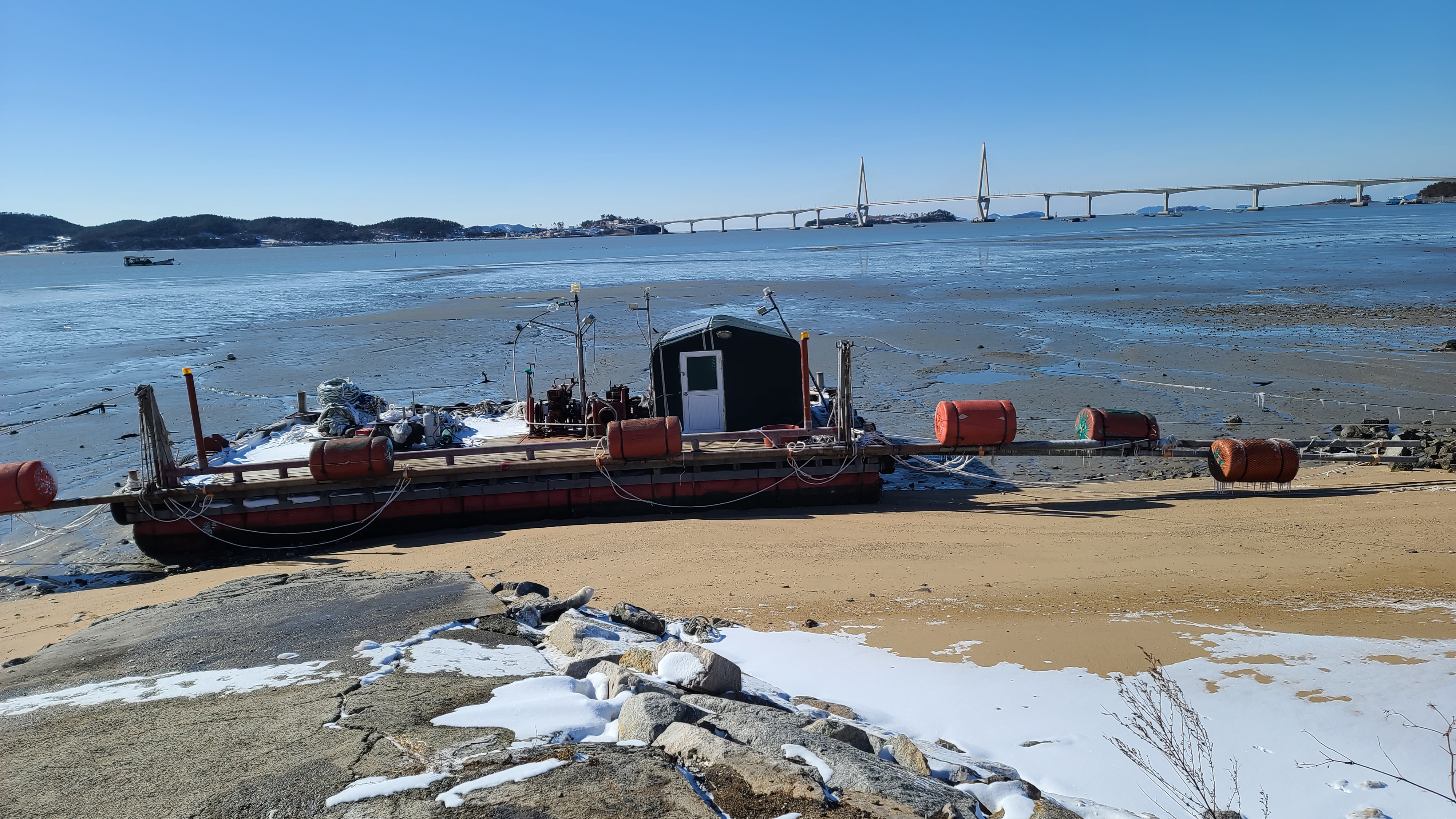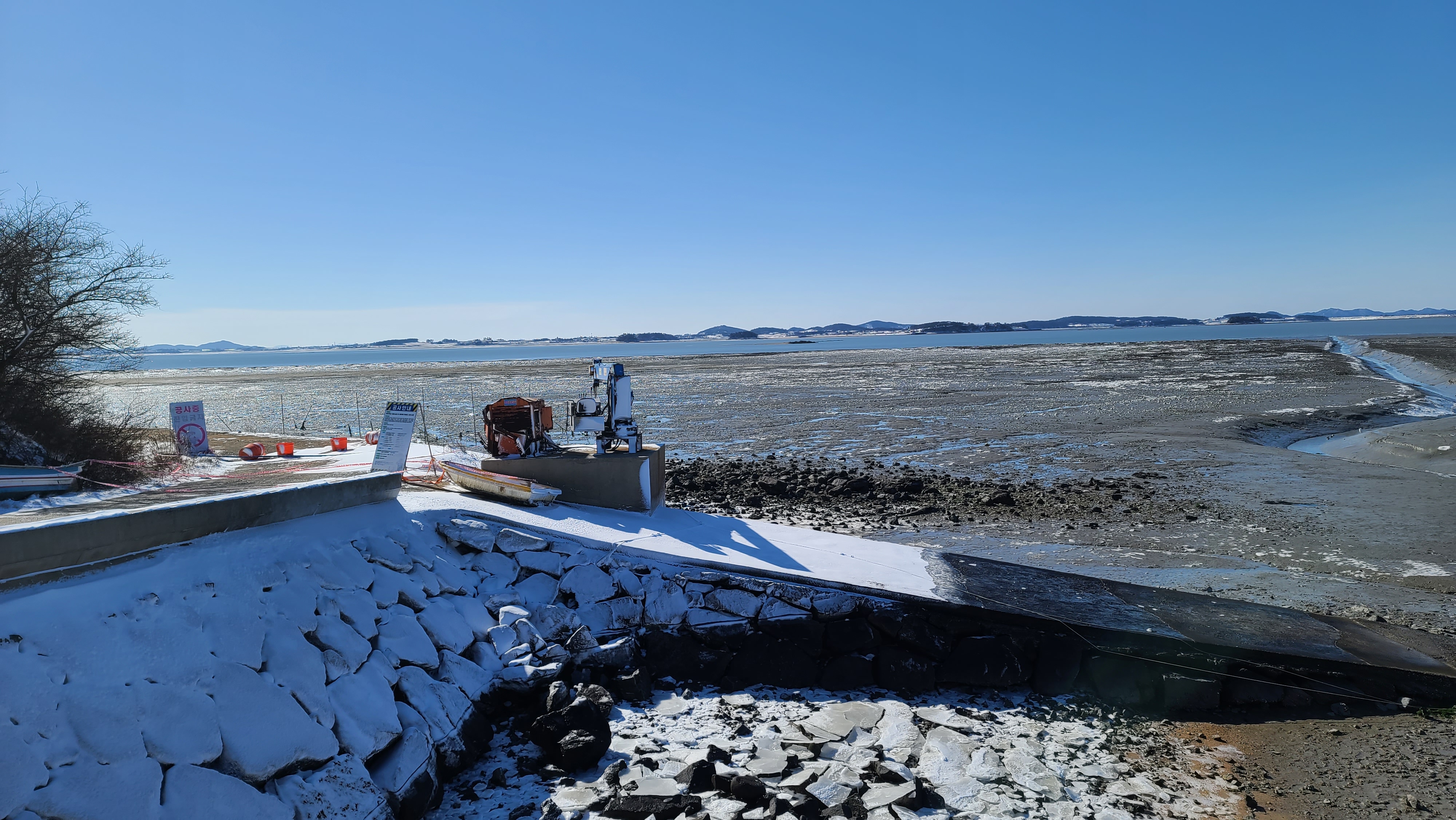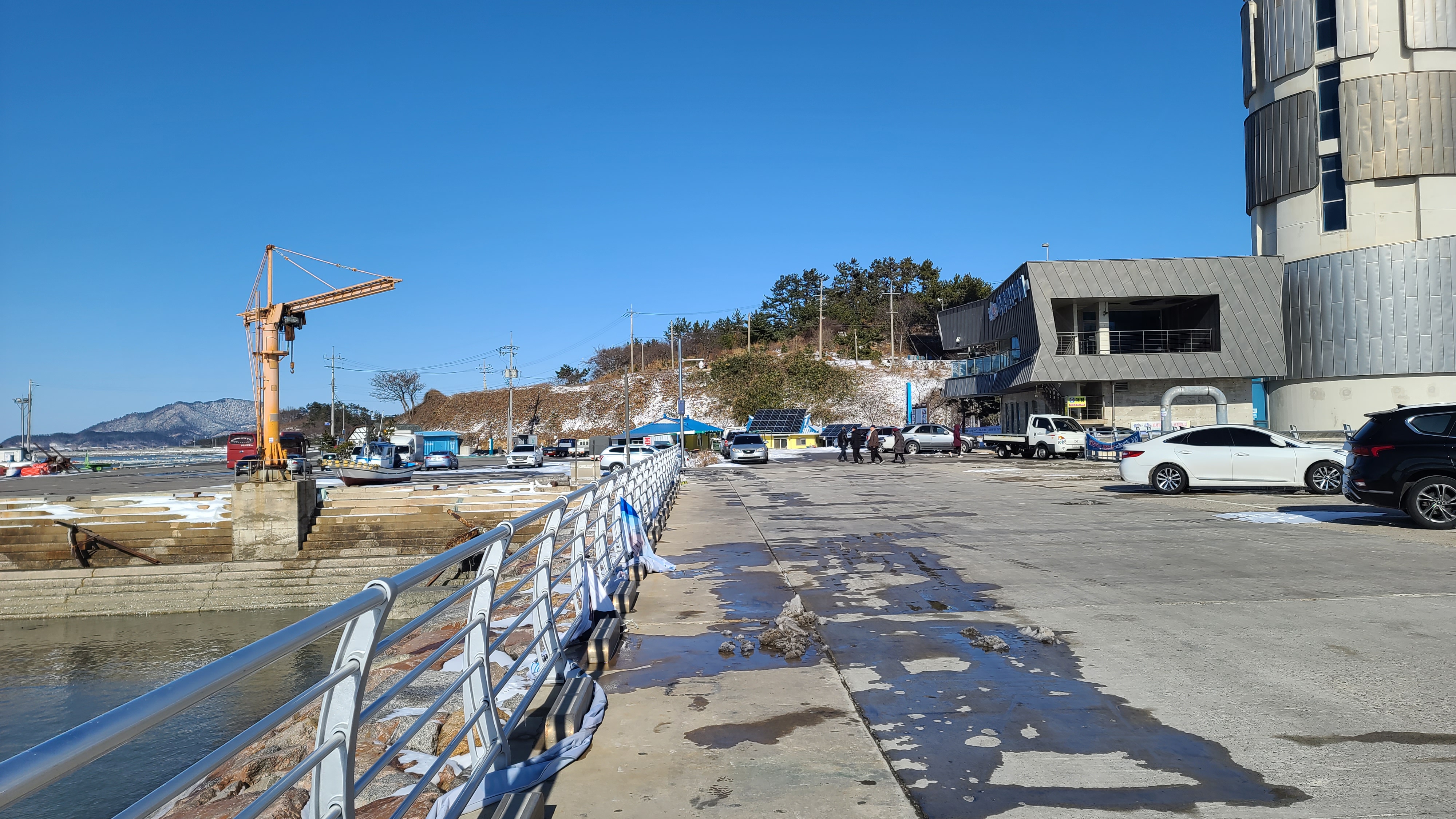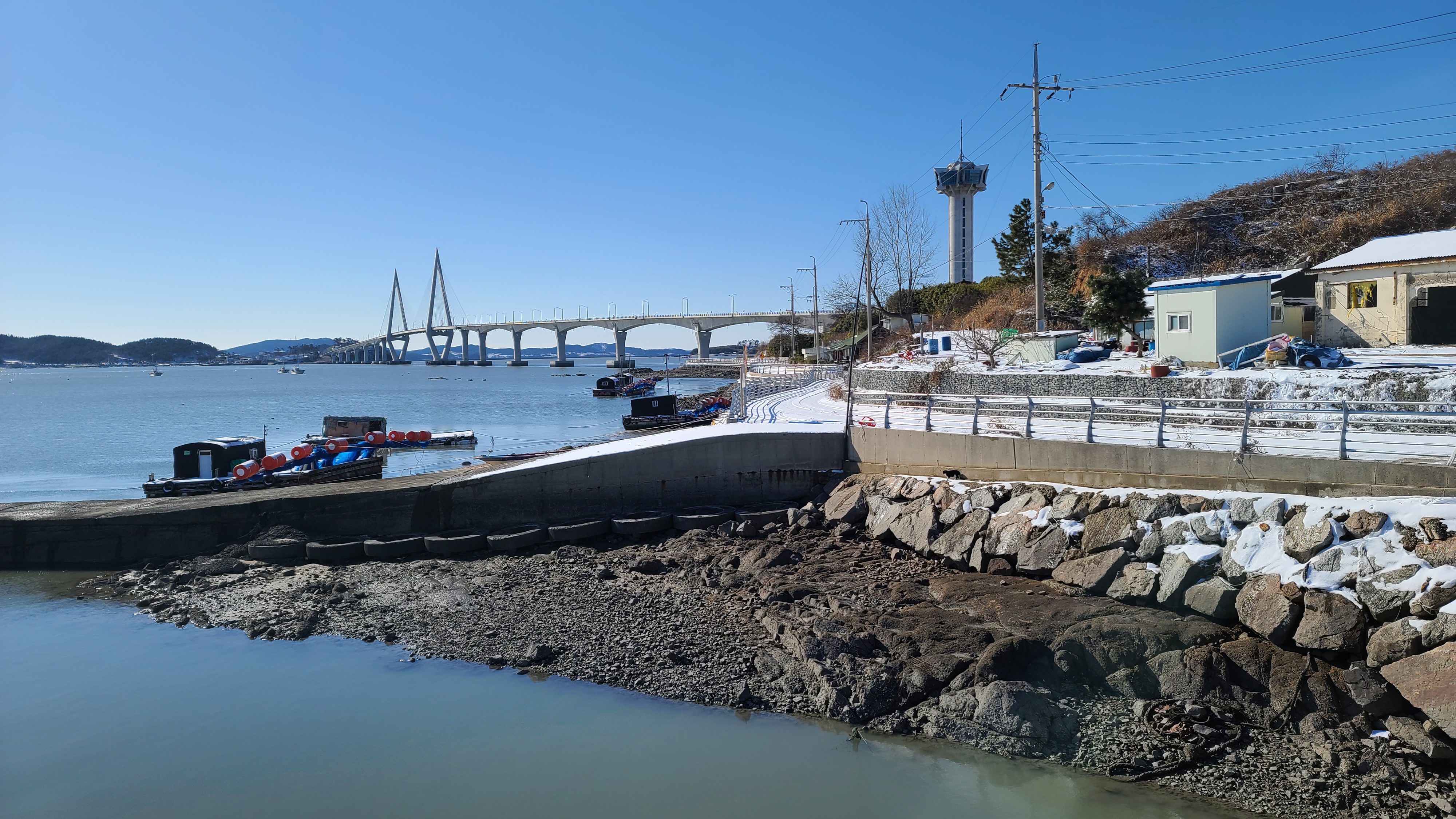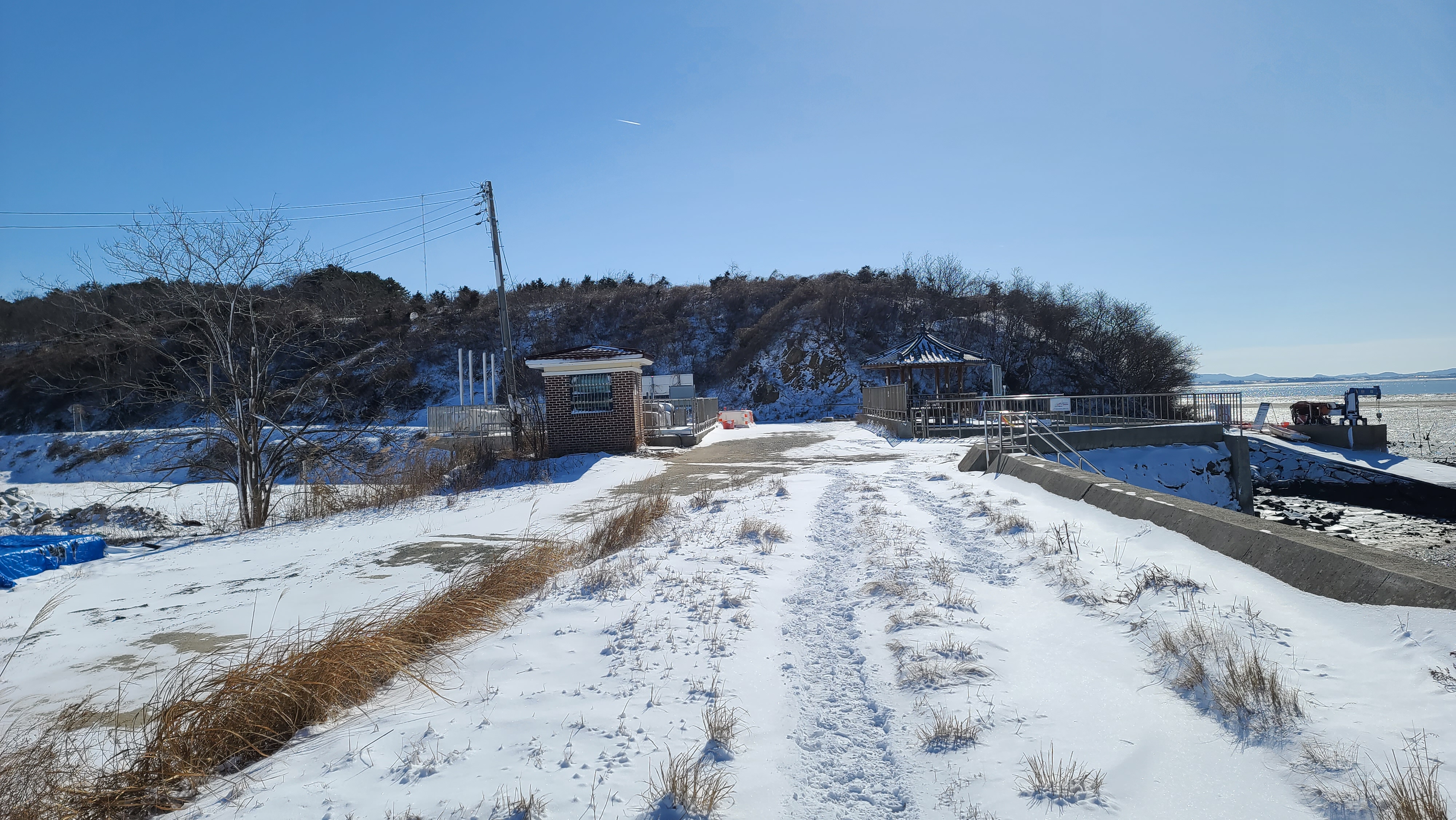 왼쪽에 석창배수갑문과 오른쪽에 쉼터정자가 있다. 해안도로 공사가 완성되면 돌꼬리 오른쪽으로 해안도로가 이어질 것이다.