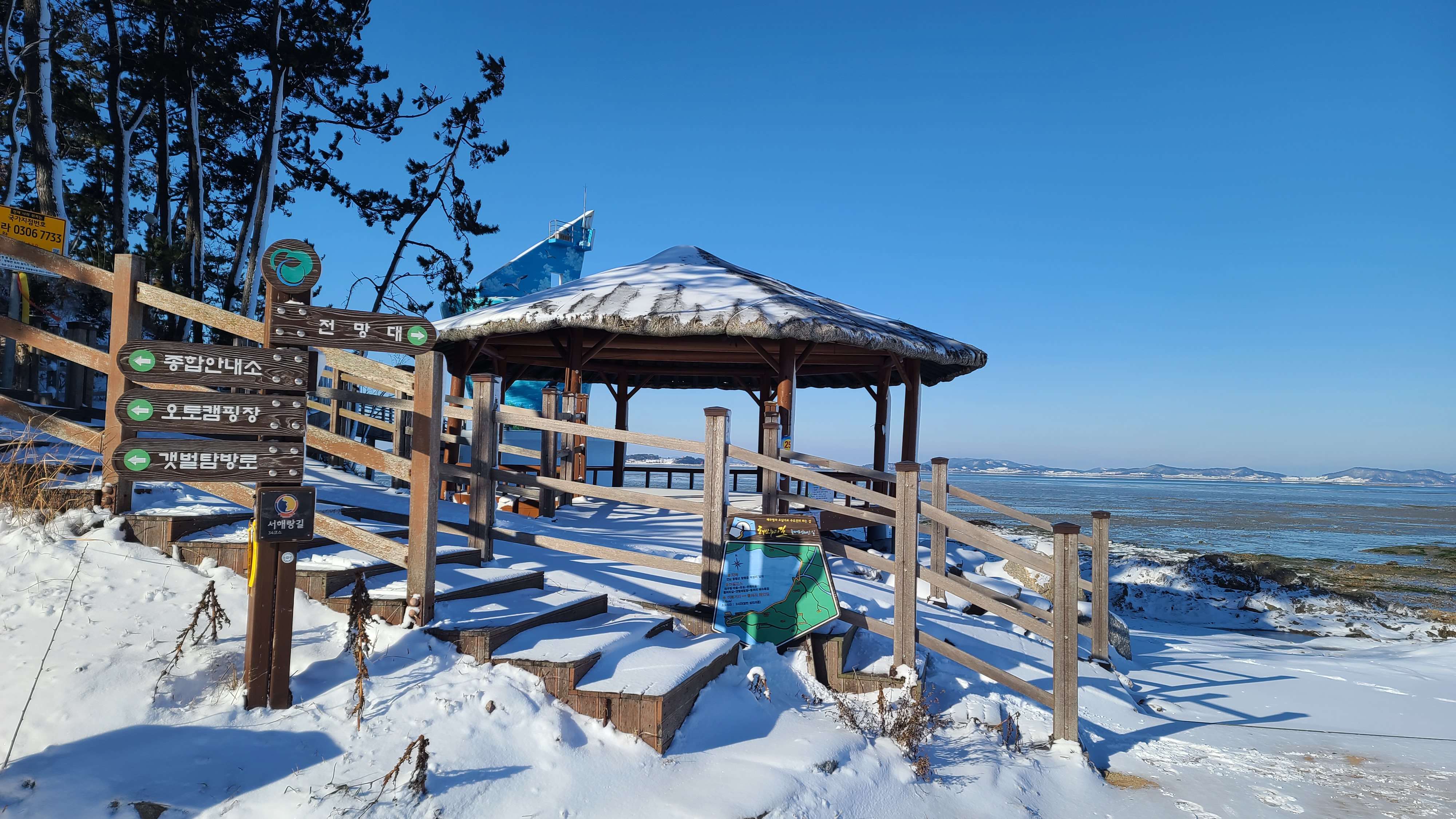 가로등 뒤 맞은편 해안은 현경면 수양리 석북마을, 중앙에 오류리의 검무산, 그 왼쪽에 용정리의 작은봉대산과 봉대산, 그 왼쪽으로 송정리와 평산리 해안이 이어지고 있다.