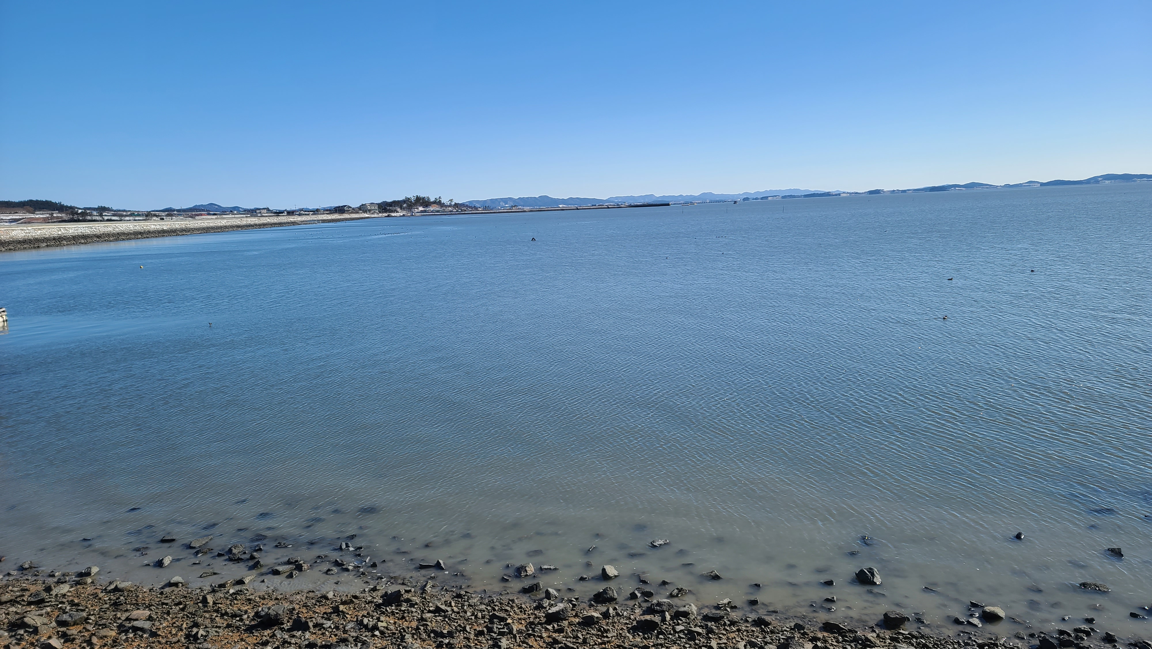 함해만의 남쪽이 조망된다. 석창리 돌꼬리에서 산남리 산남방조제를 거쳐 월천리 1공구로 건너왔다.
