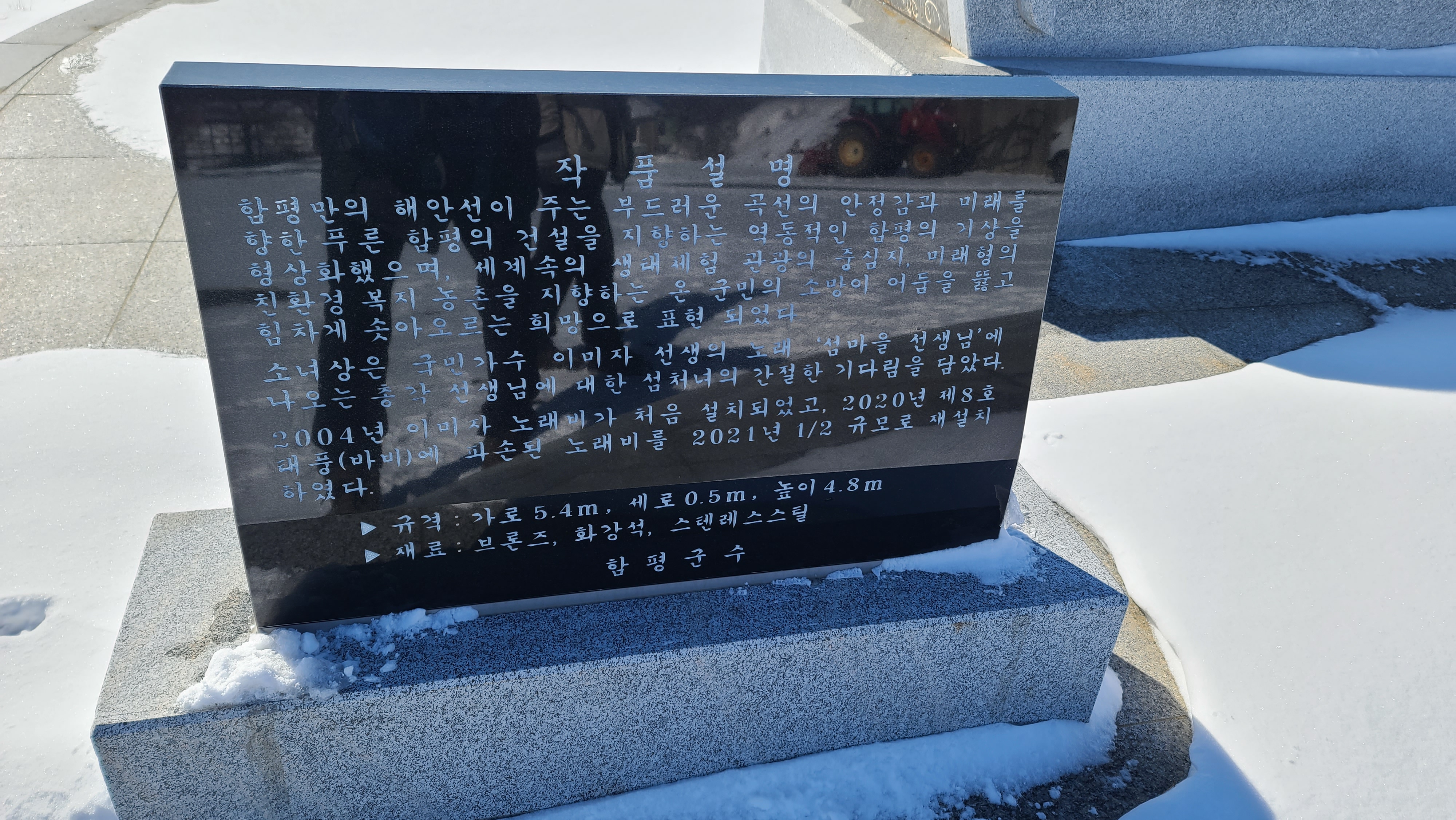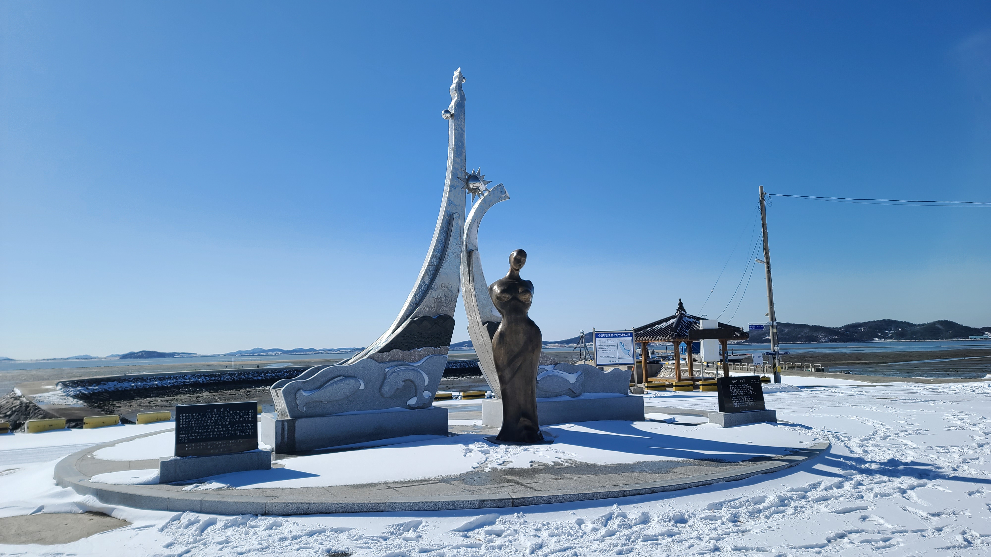 월천리 안악마을 입구에 '섬마을 선생님' 노래비와 '소녀상' 조형물이 세워져 있다. "해당화 피고지는 섬마을에/ 철새따라 찾아온 총각 선생님/ 열아홉살 섬색시가 순정을 바쳐/ 사랑한 그 이름은 총각 선생님/ 서울엘랑 가지를 마오 가지를 마오" 섬마을도 아닌 이곳에 왜 이미자가 부른 '섬마을 선생님' 노래비가 세워져 있을까? 사연이 궁금하지만 알 수 없다. 작품 설명에 "소녀상은 국민가수 이미자 선생의 '섬마을 선생님'에 나오는 총각 선생님에 대한 섬처녀의 간절한 기다림을 담았다."고 한다. 노래를 살짝 읊으며 길을 떠난다. 총각 선생님과 섬색시가 뜻하는 것은 무엇일까? 소녀는 미지의 사랑과 꿈을 소망하며, 그것을 총각 선생님으로 표현한 것이라 생각한다. 소녀의 가슴은 미래의 꿈과 사랑의 간절한 기다림으로 가득차 있다. 미래의 삶에 대한 부푼 꿈, 꿈을 이루기 위한 욕망과 의지, 섬색시의 소망이 간절하다. 길손 또한 총각 선생님의 그리움으로 가득하여, 사랑과 꿈으로 서해랑길을 걷는다. 칠산바다를 건너오는 바람은 더 큰 세상, 더 넓은 세계의 꿈으로 출렁거린다.