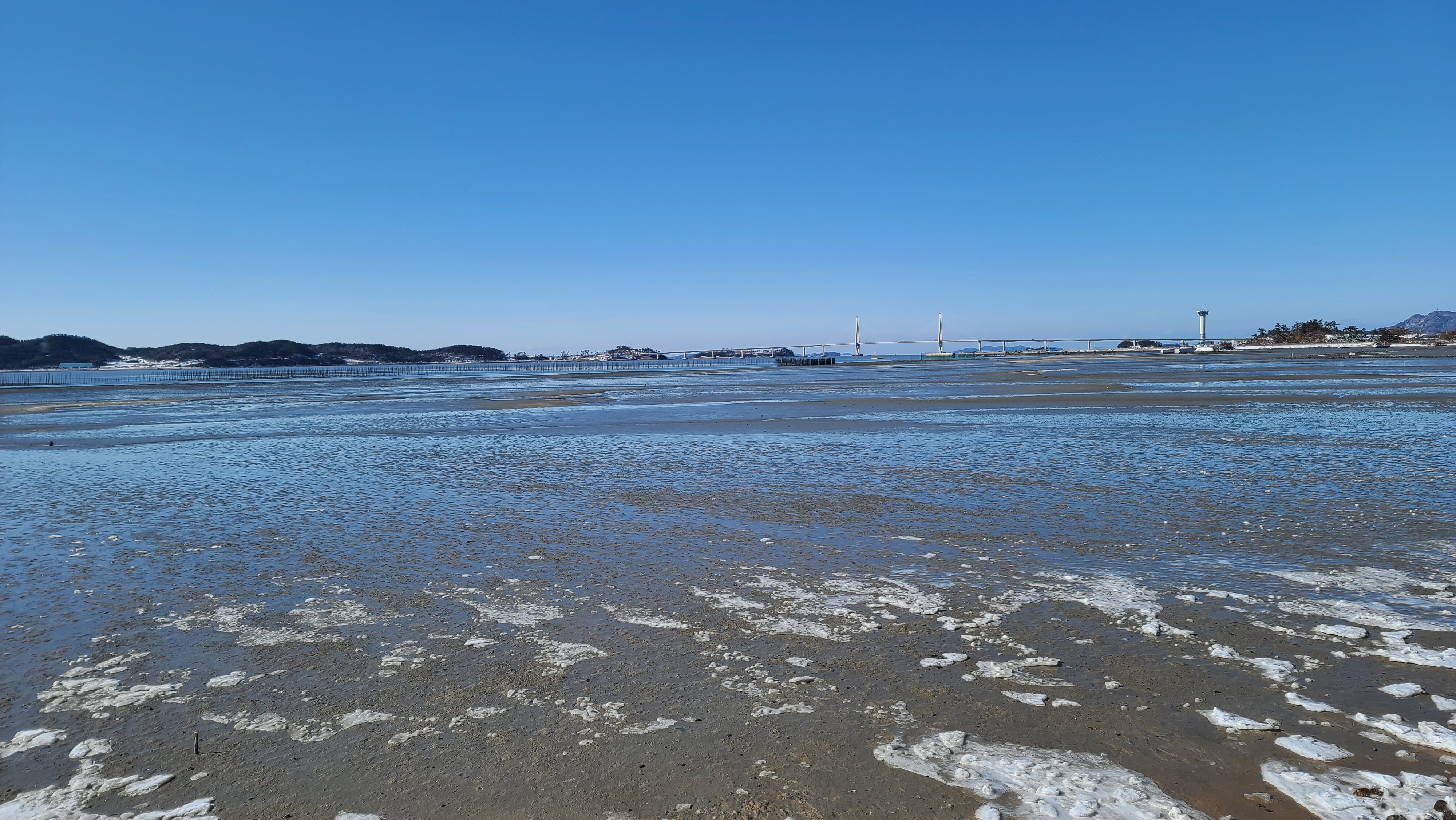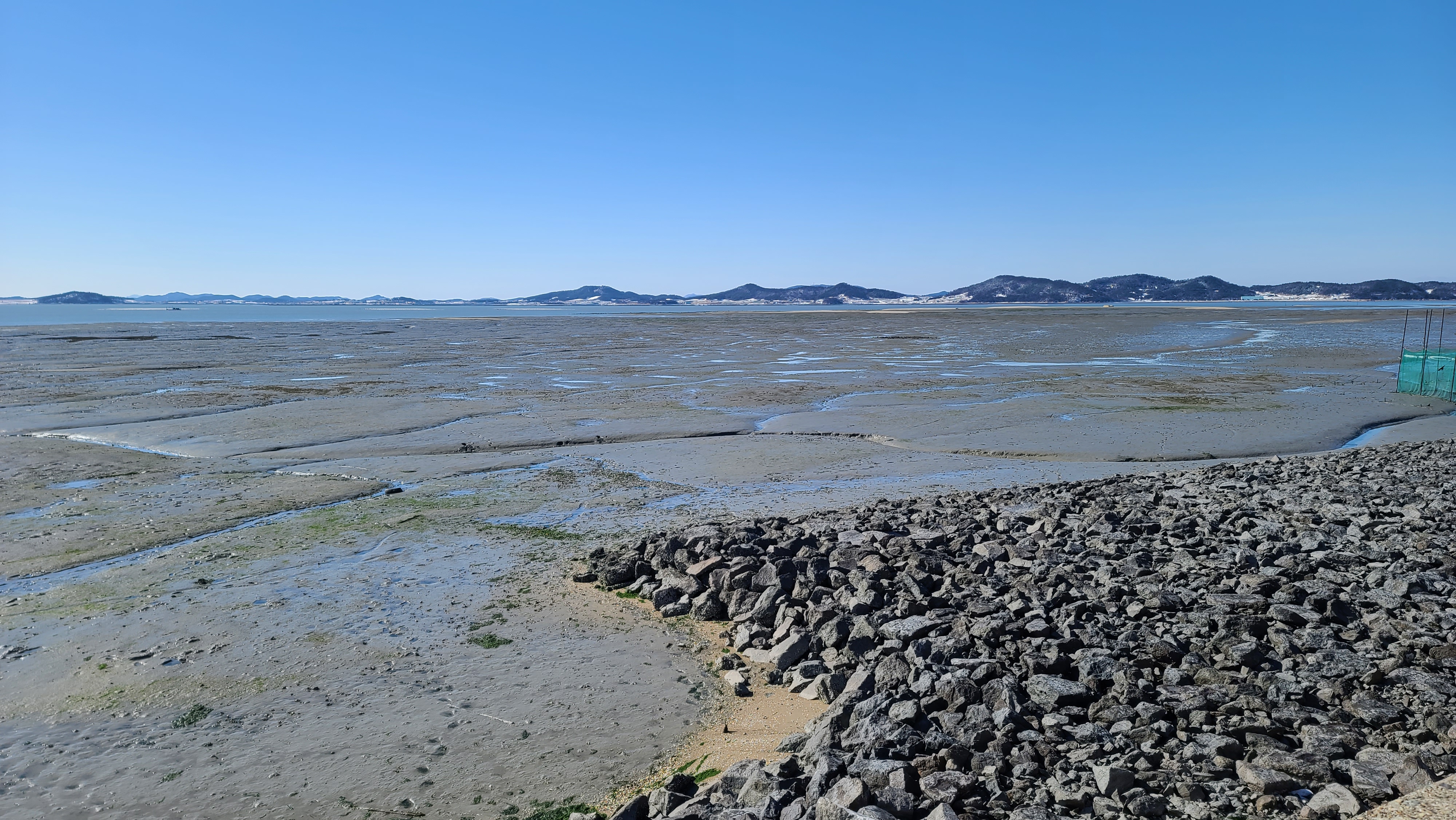맞은편은 무안군 해제면 만풍리와 유월리 해안이다. 중앙에 솟은 산이 이성산, 그 왼쪽에 해제면 유월리 용산방조제와 무안황토갯벌랜드, 그 왼쪽으로 현경면 가입리 해안이 이어진다. 왼쪽의 섬은 엄도인 듯.