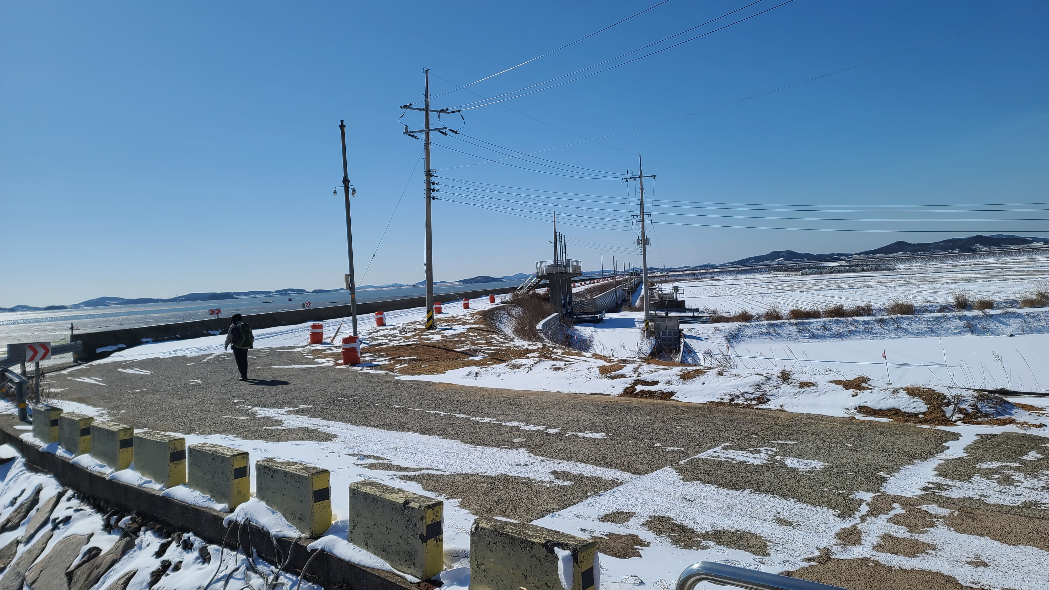 오른쪽 뒤 석창리 돌꼬리 앞에서 산남방조제, 일공구, 월천방조제를 거쳐 월천리 안악마을 앞으로 왔다.