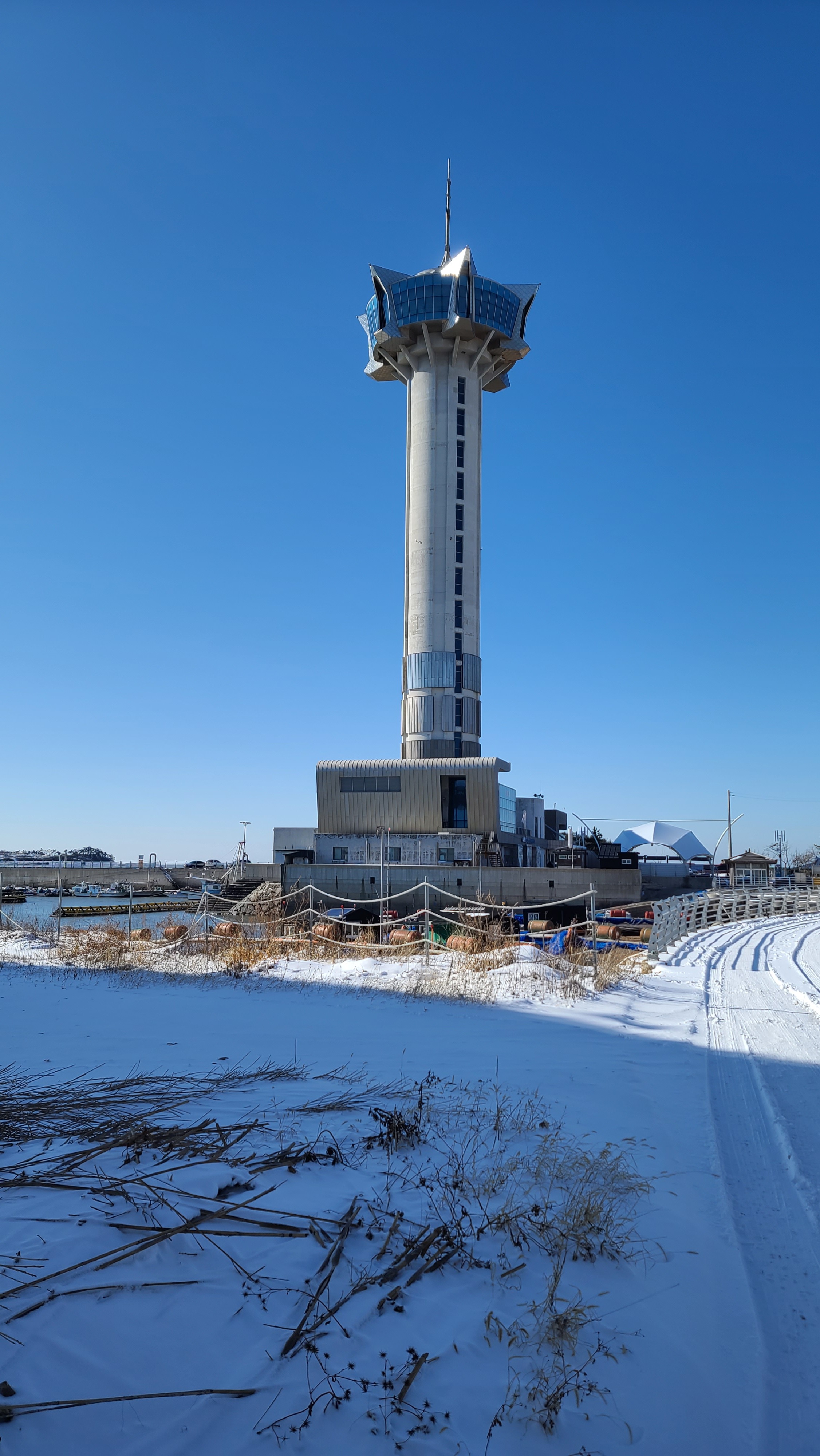 손불면 월천리에서 학산리로 넘어왔다. 함평만해안도로는 꼬불꼬불 돌아서 중앙의 함평항으로 이어진다. 왼쪽에 향화도항의 칠산타워가 솟아 있다.