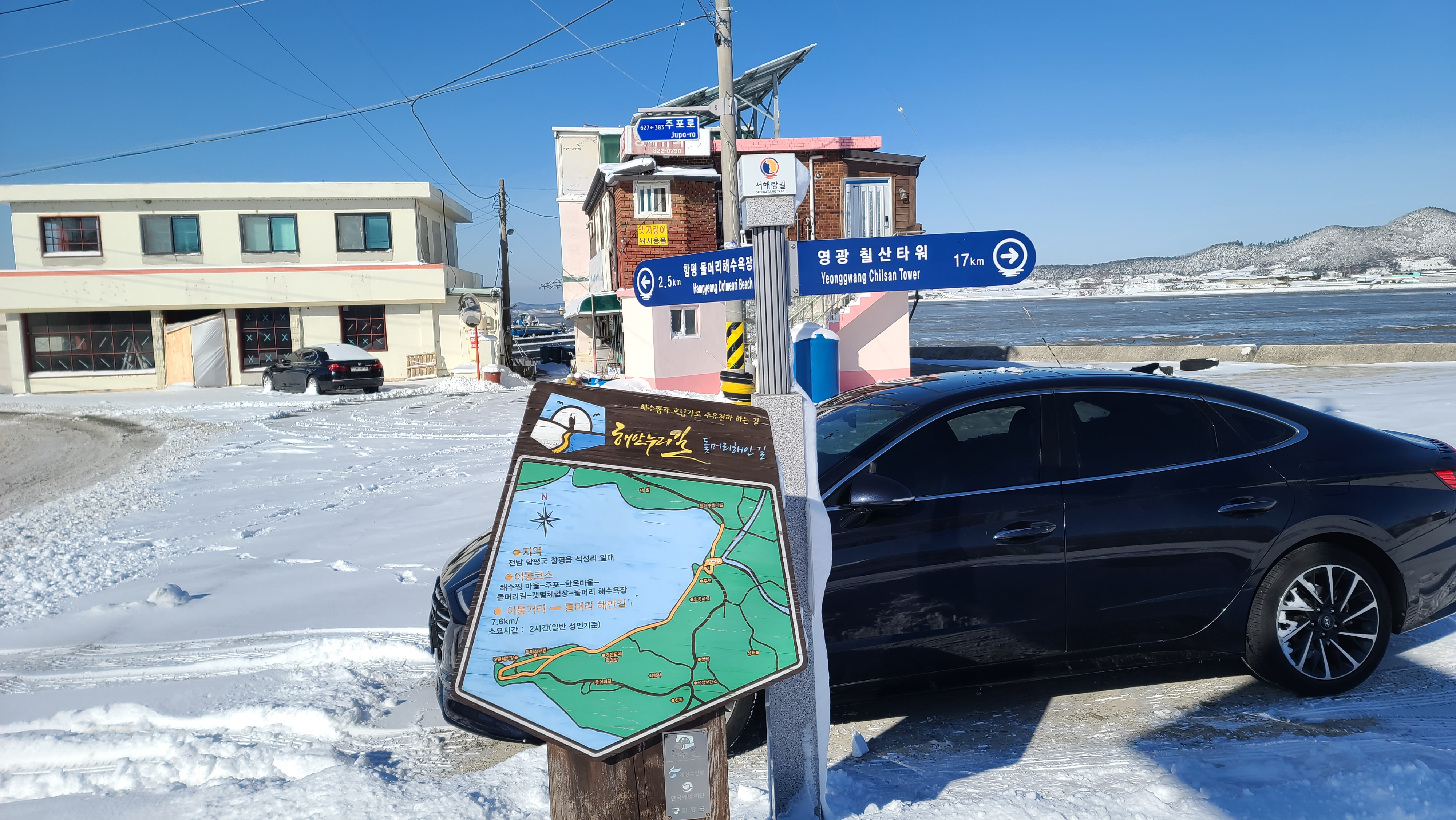 35코스 종점인 영광 칠산타워까지 17km 거리이며, 이정목 뒤 건물은 형제슈퍼이다.