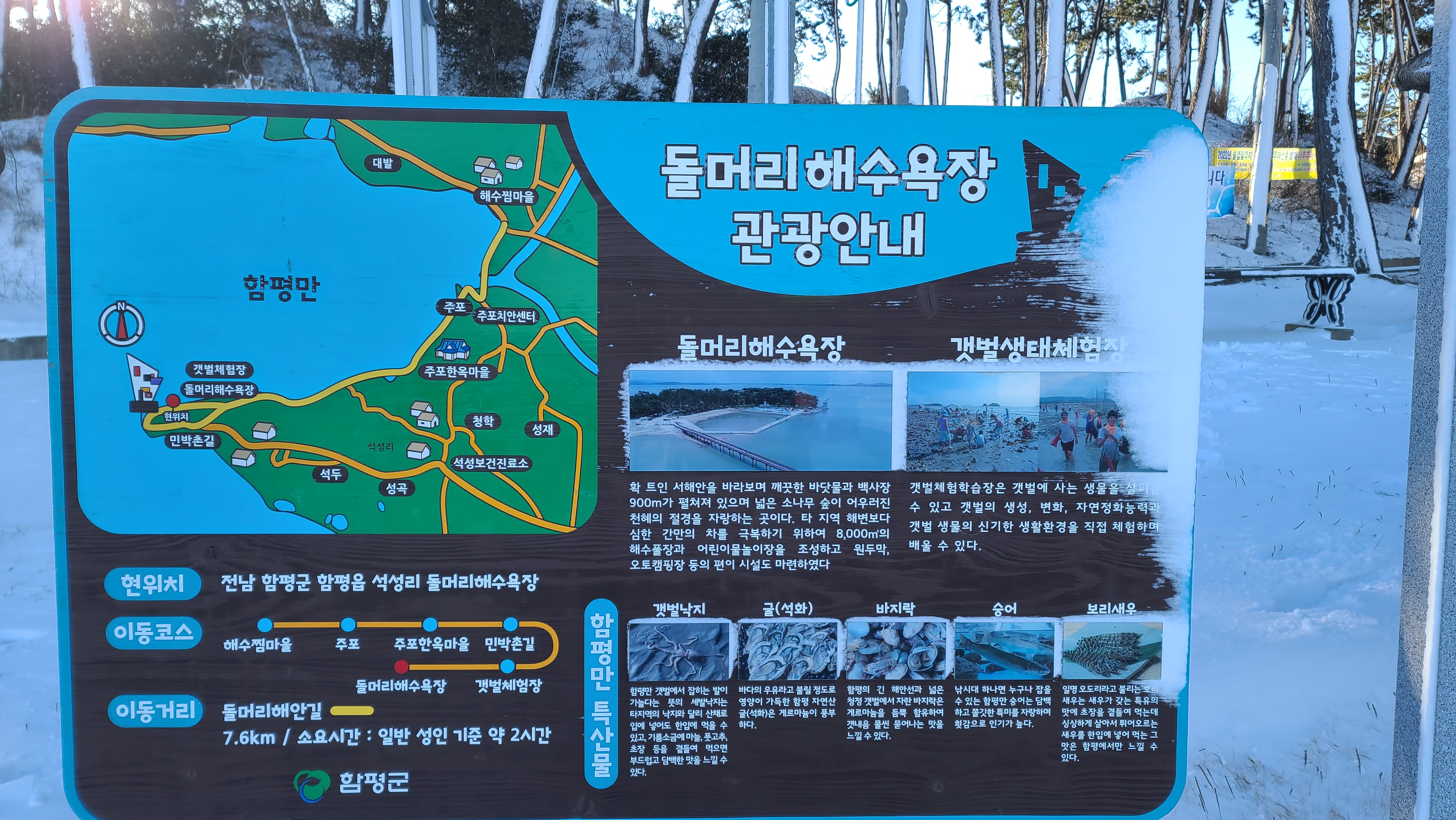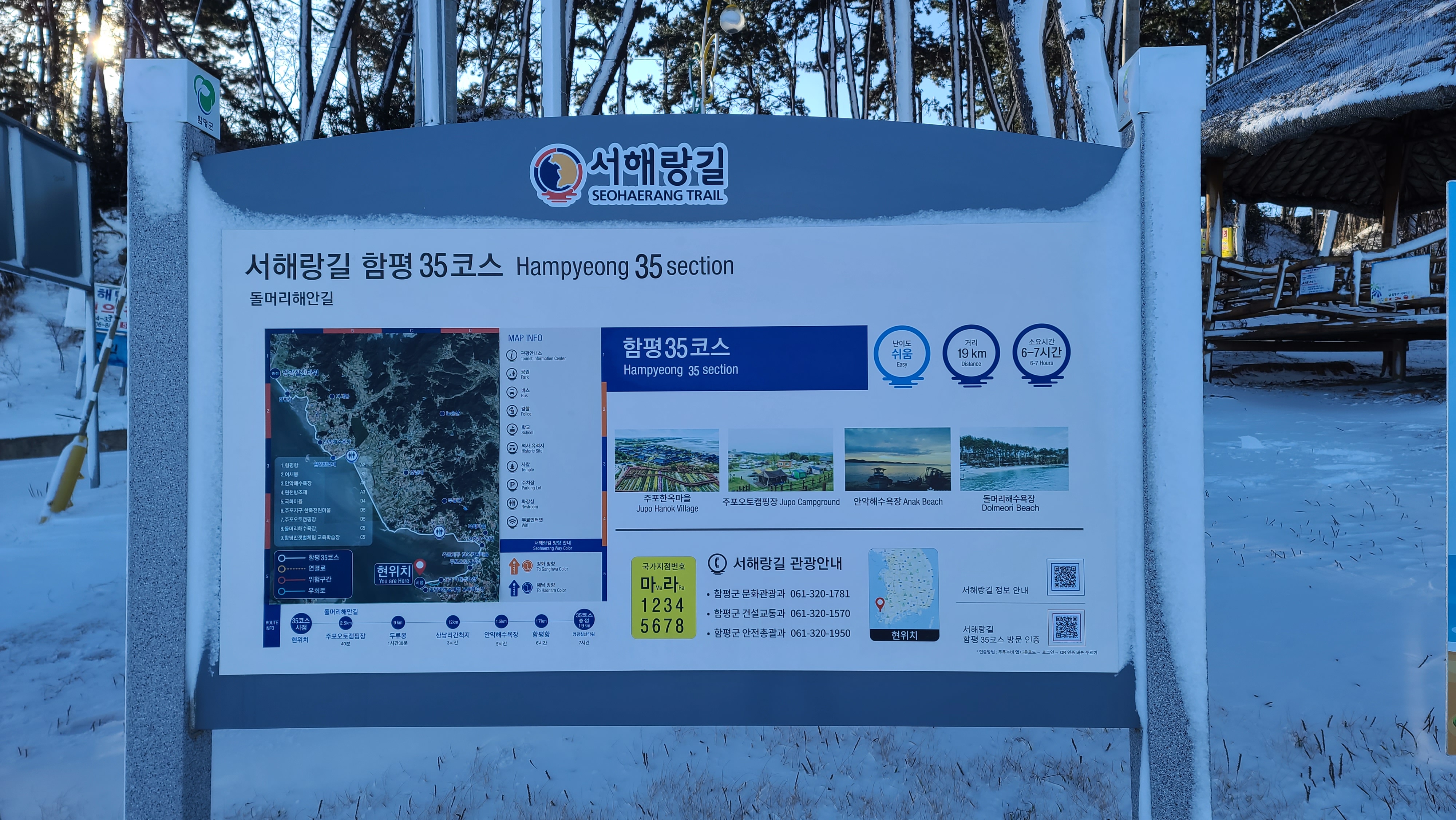 서해랑길 35코스의 함해만 해안을 걷는다. 35코스는 함해만 함평 지역의 해안을 따라가서 함해만의 끝 지점 영광군 염산면 옥실리 향화도항에서 끝난다. 서해랑길은 해안길이 해안으로 이어지지 않는 곳이 있어, 도로와 언덕을 넘는 경우가 있다. 그러나 전체적으로는 함해만 해안을 따라가는 길이며 주로 방조제 제방길을 걷는다. 함평읍 석성리-손불면 궁산리를 잇는 주포방조제를 필두로, 손불면 석창리-산남리-월천리를 잇는 산남방조제, 월천리 일공구-안악마을을 잇는 월천방조제, 손불면 학산리-영광군 염산면 옥실리를 잇는 옥실방조제, 긴 제방길과 함평만해안도로를 걸었다. 무엇을 보았는가?