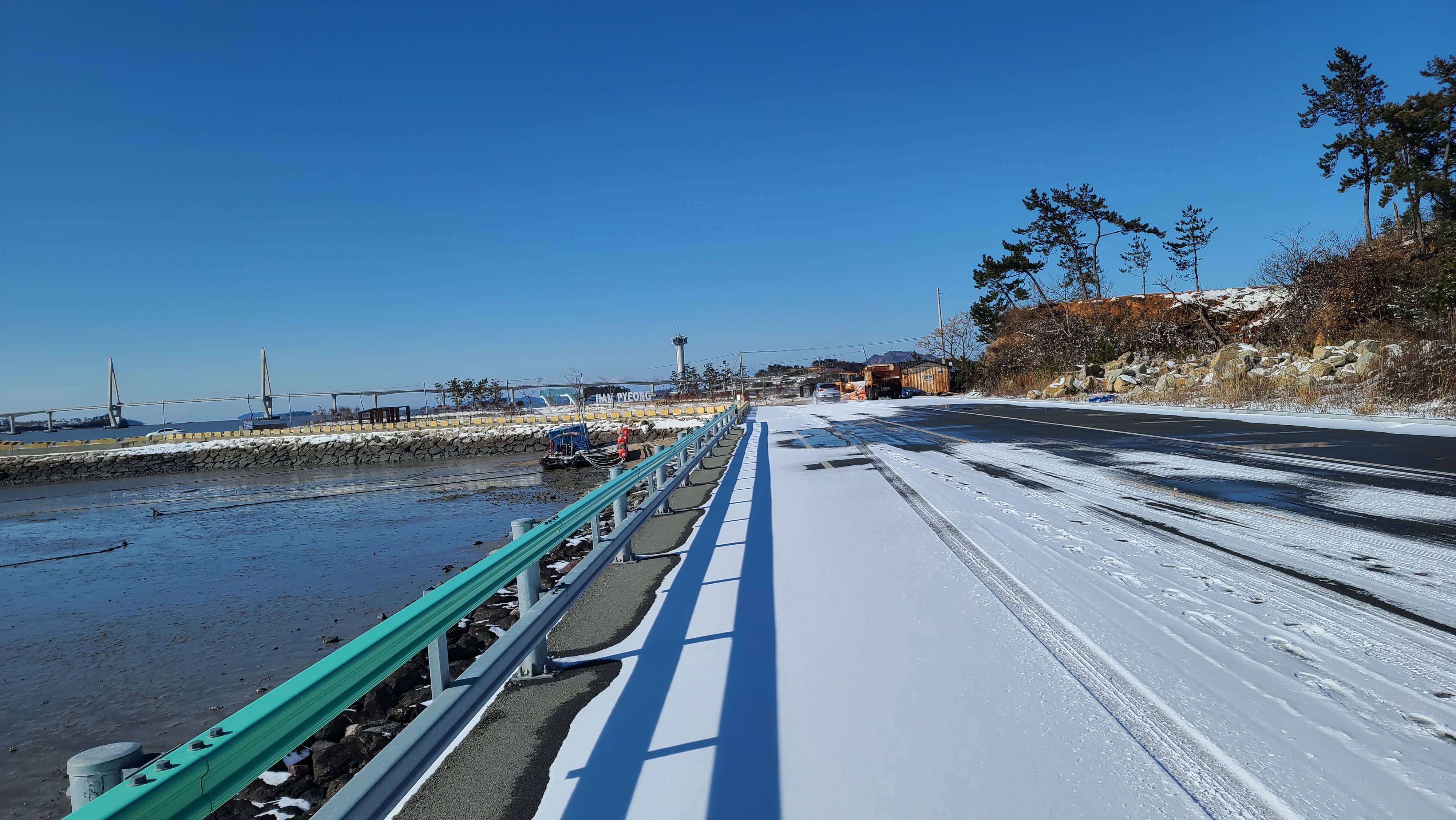 손불면 학산리 (주)동성수산과 (주)손불수산 앞 해안도로를 꼬불꼬불 돌아간다.