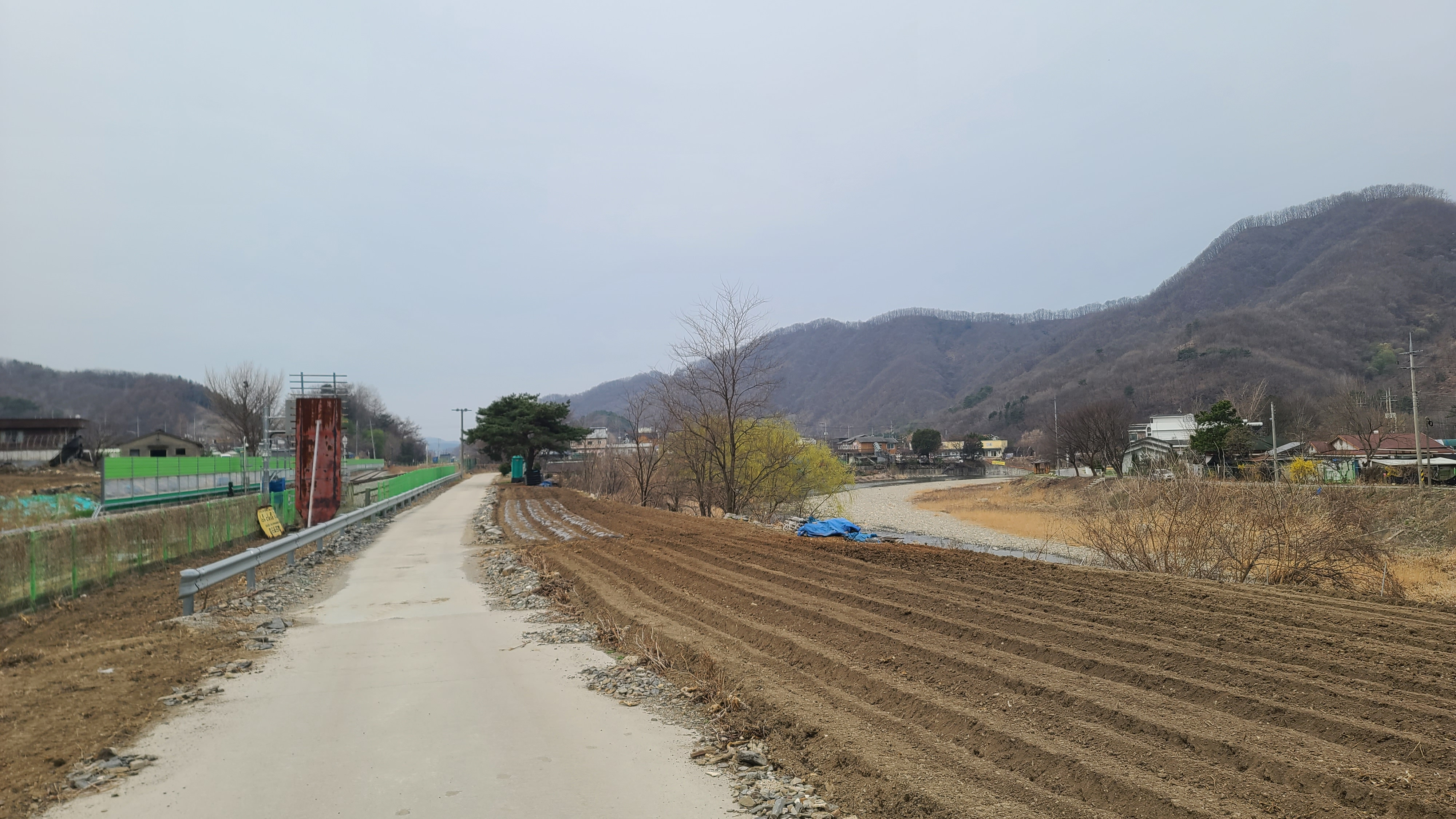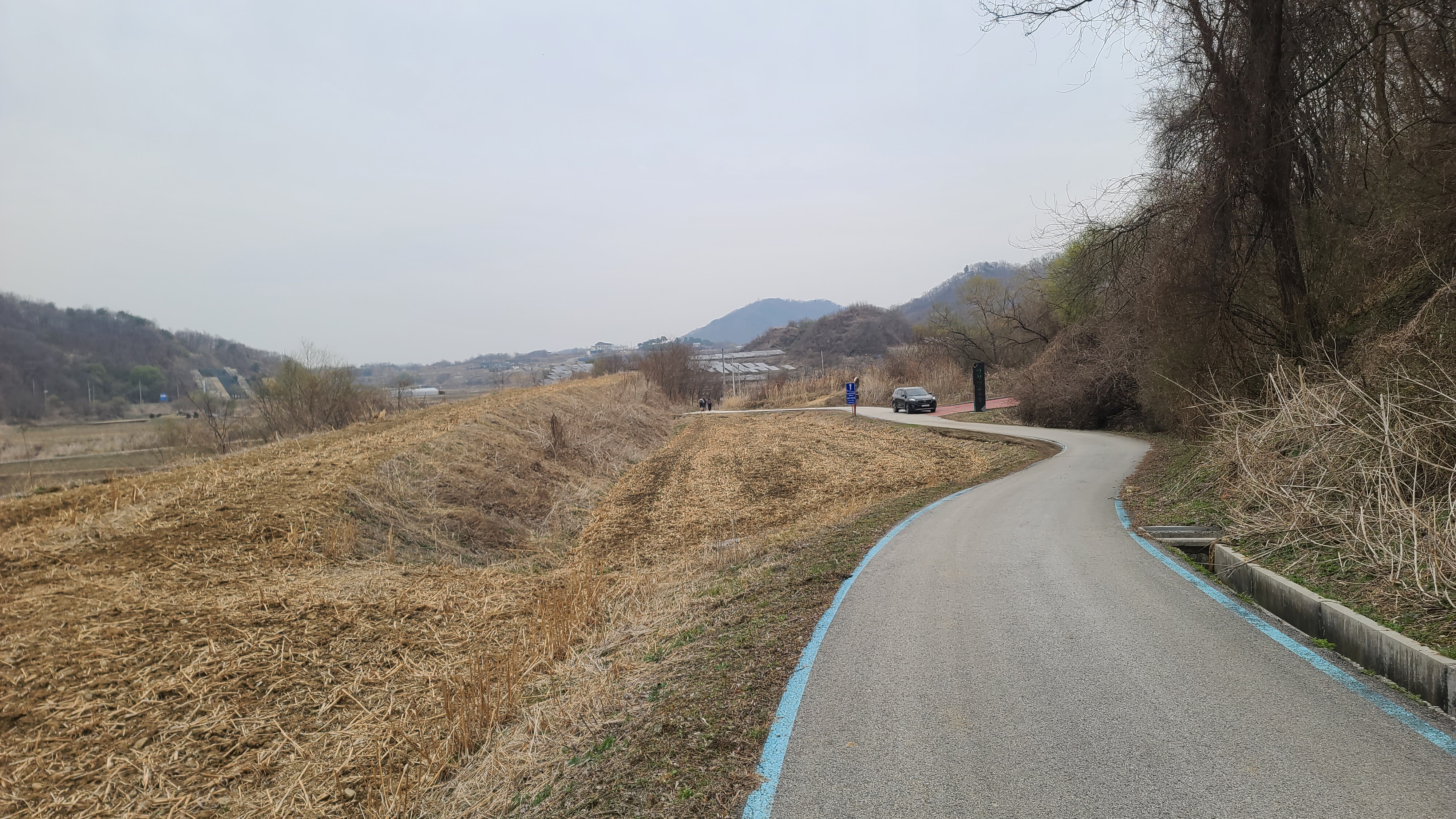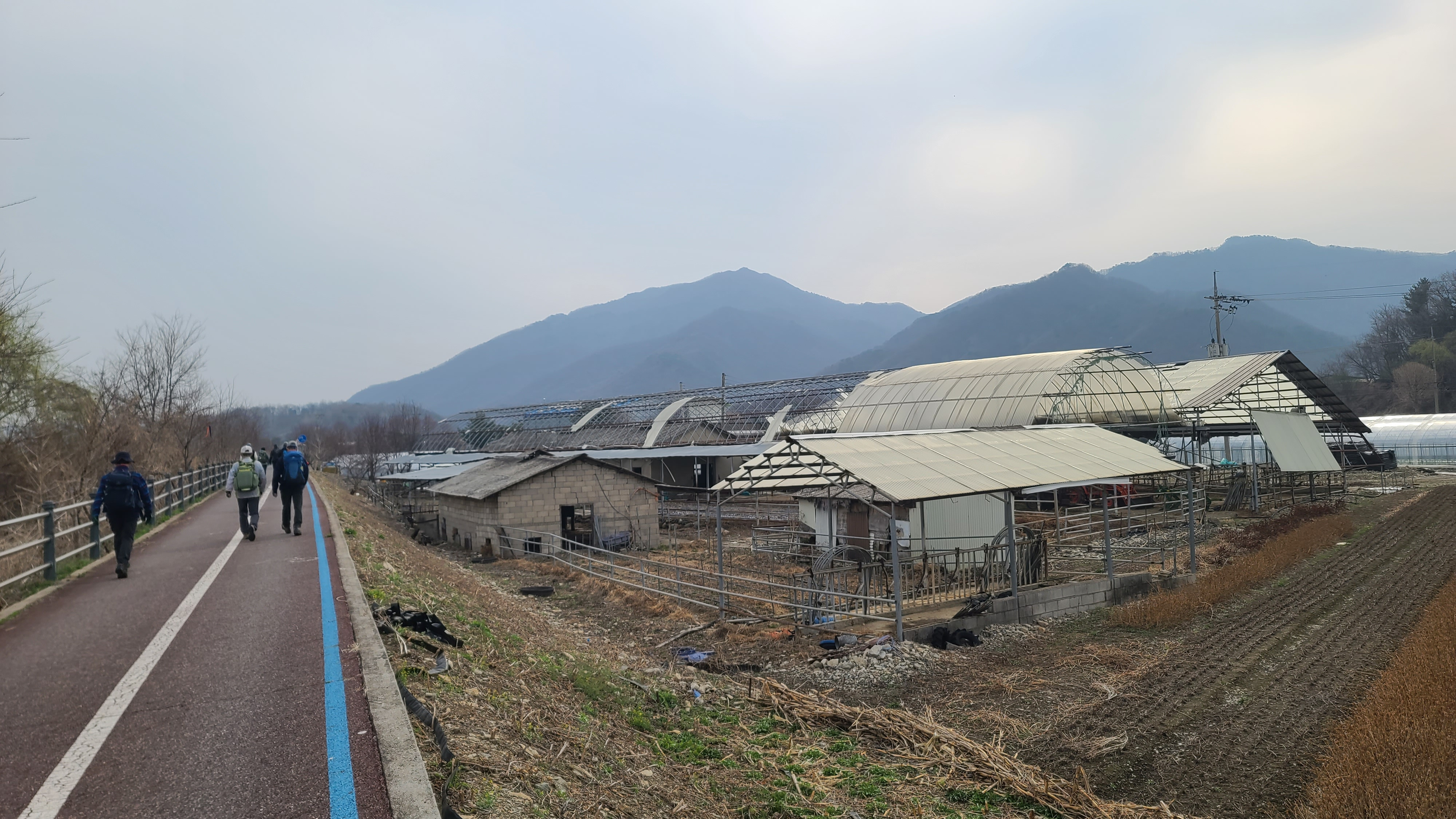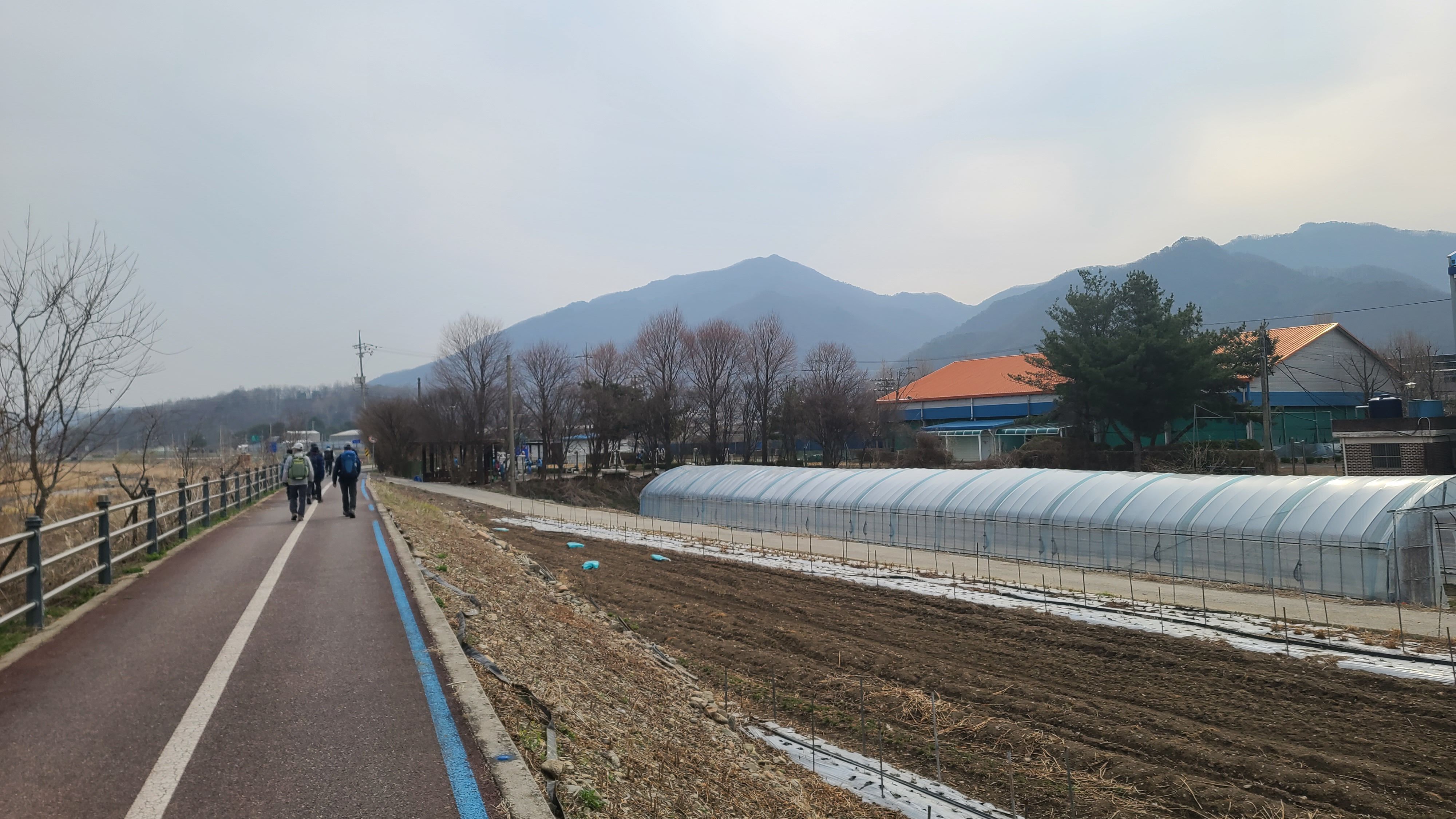 차탄천 제방 '희망온길'을 따라 대광잠수교 방향으로 올라간다. 오른쪽에 비닐하우스 농장이 있고 오른쪽 뒤에 고대산이 솟아 있다.