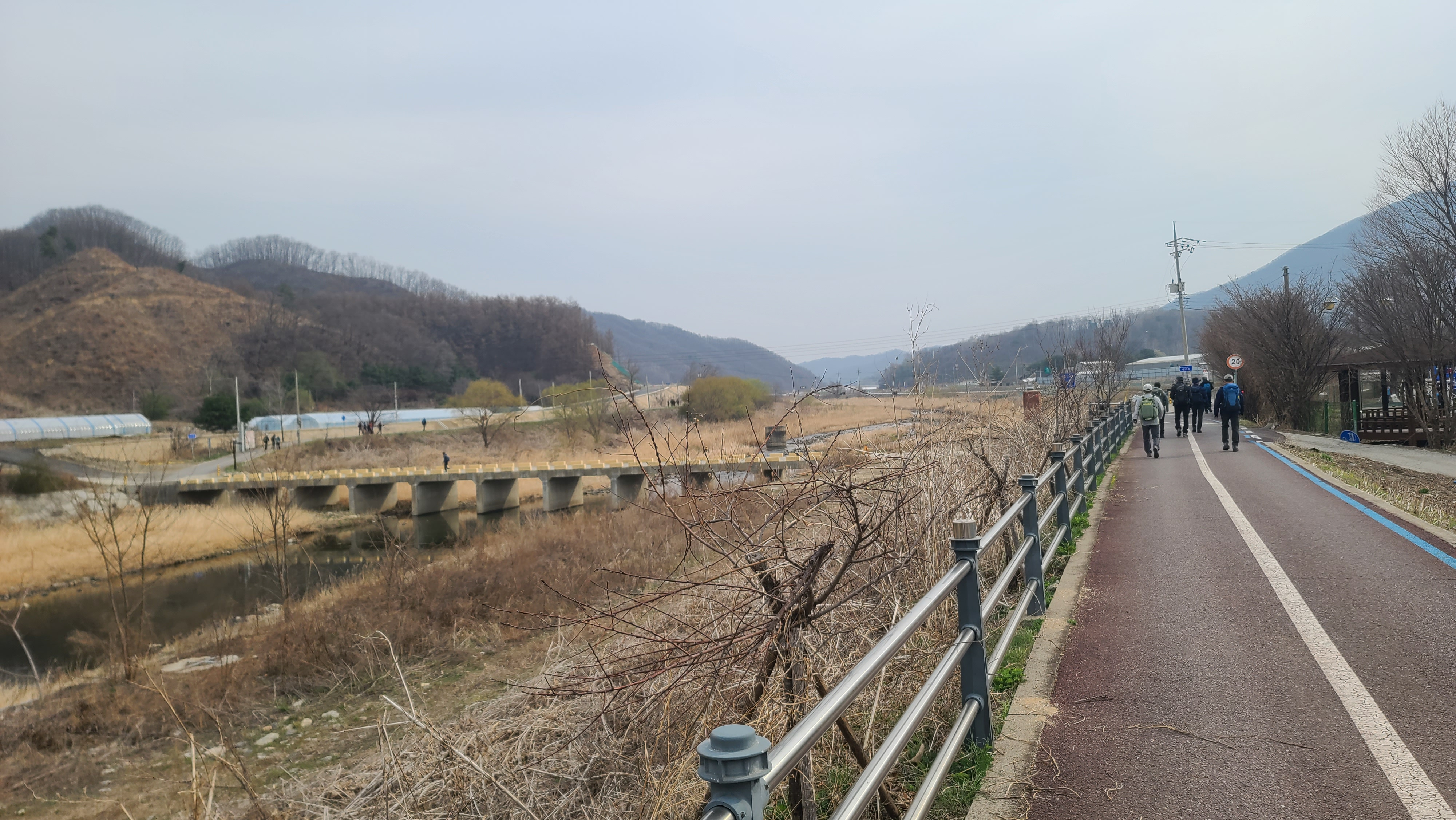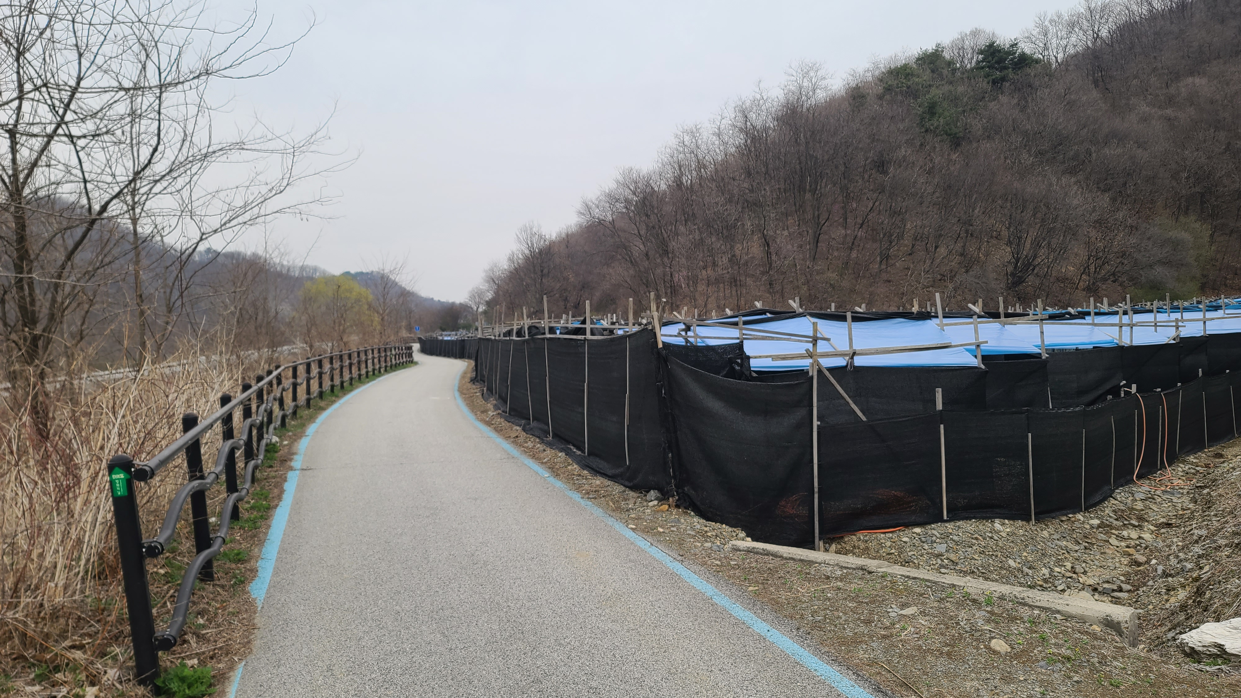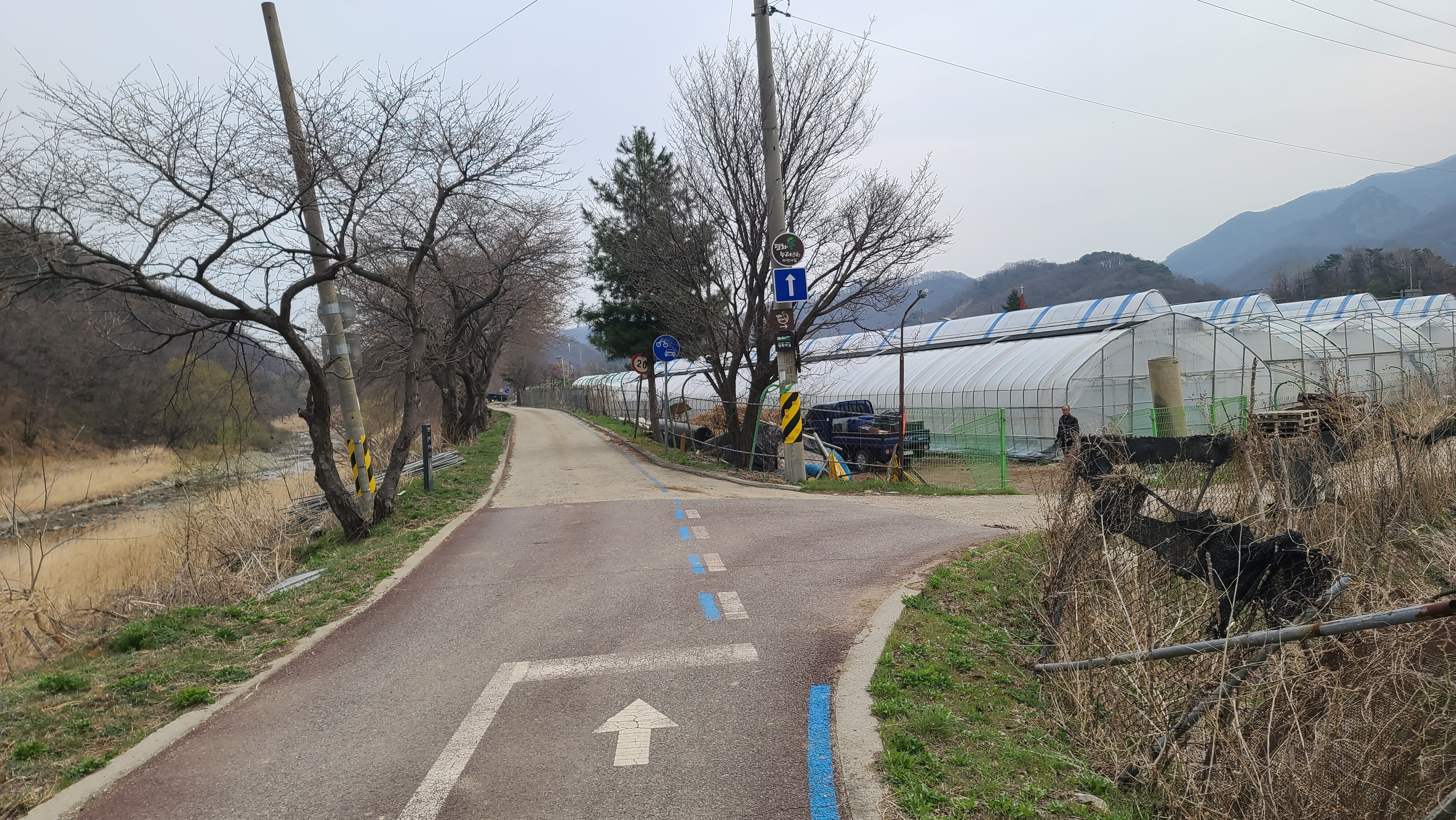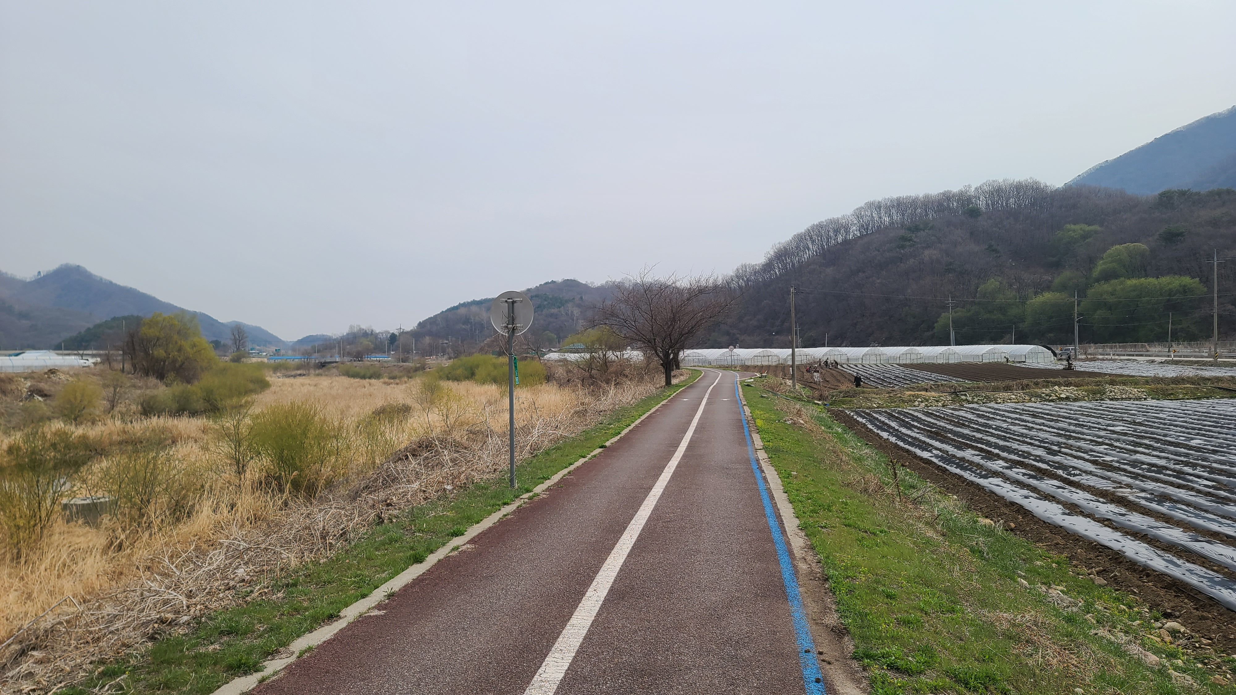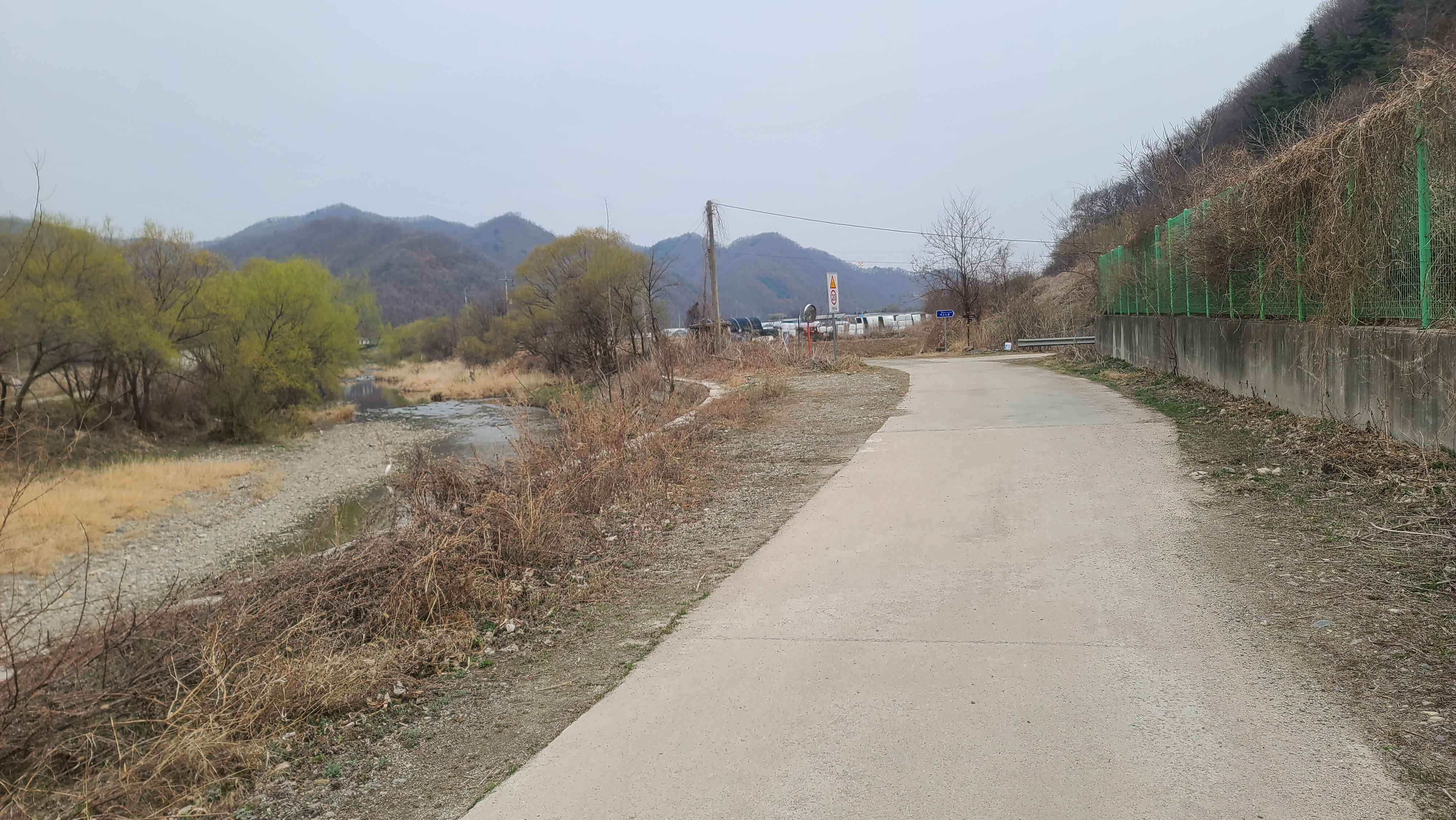 차탄천 제방 '희망온길'을 따라 대광잠수교 방향으로 올라간다. 오른쪽에 비닐하우스 농장이 있고 오른쪽 뒤에 고대산이 솟아 있다.