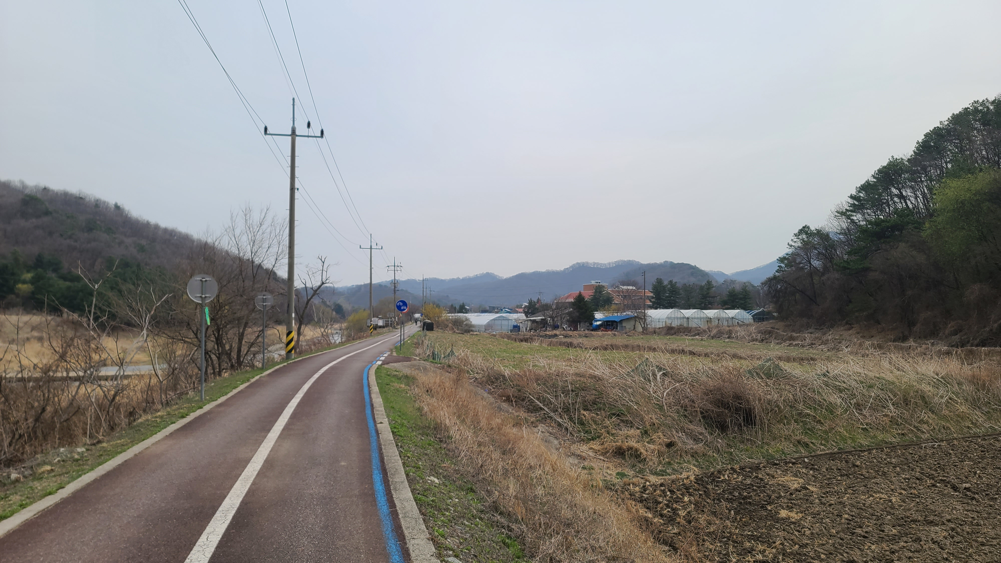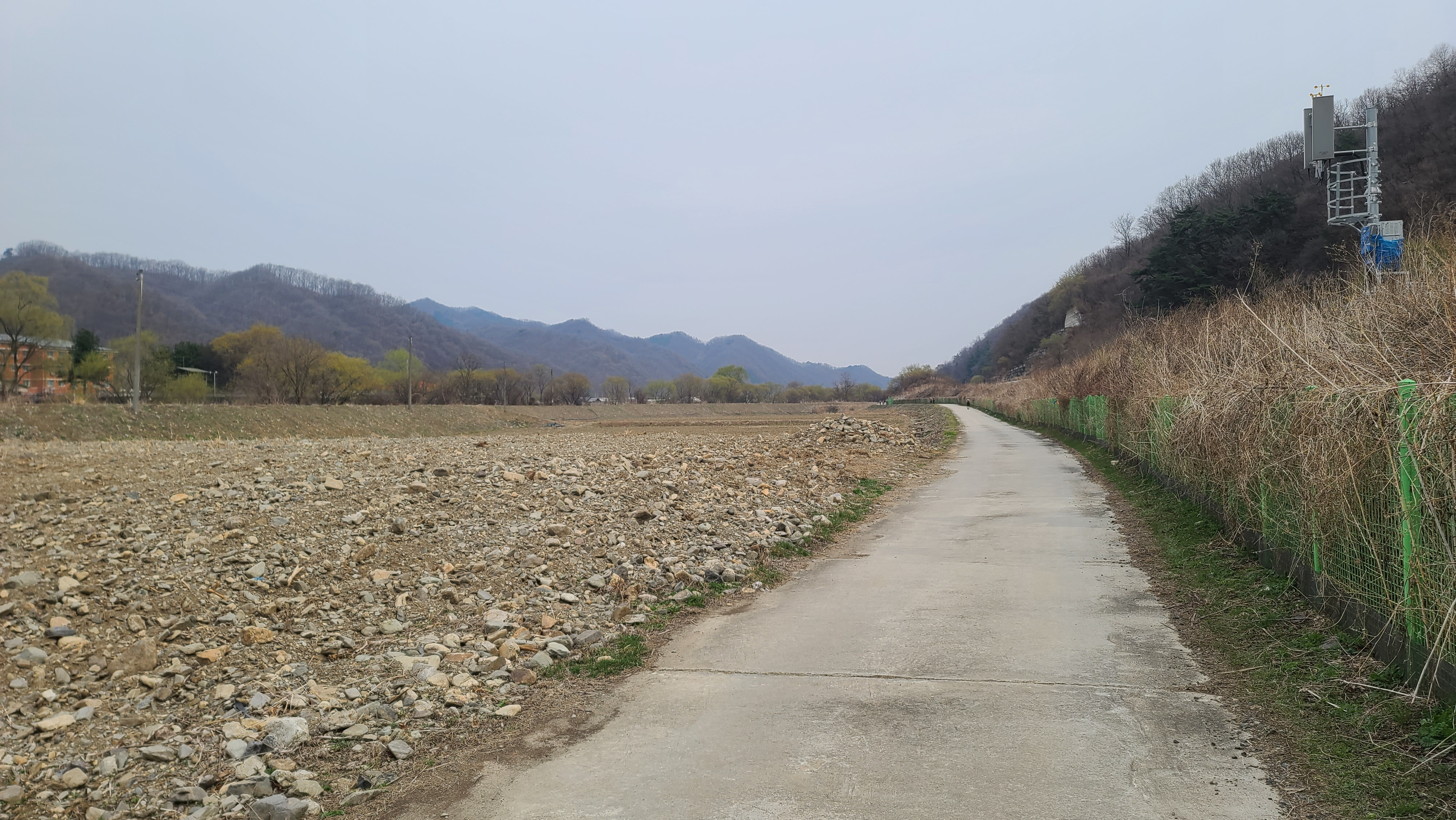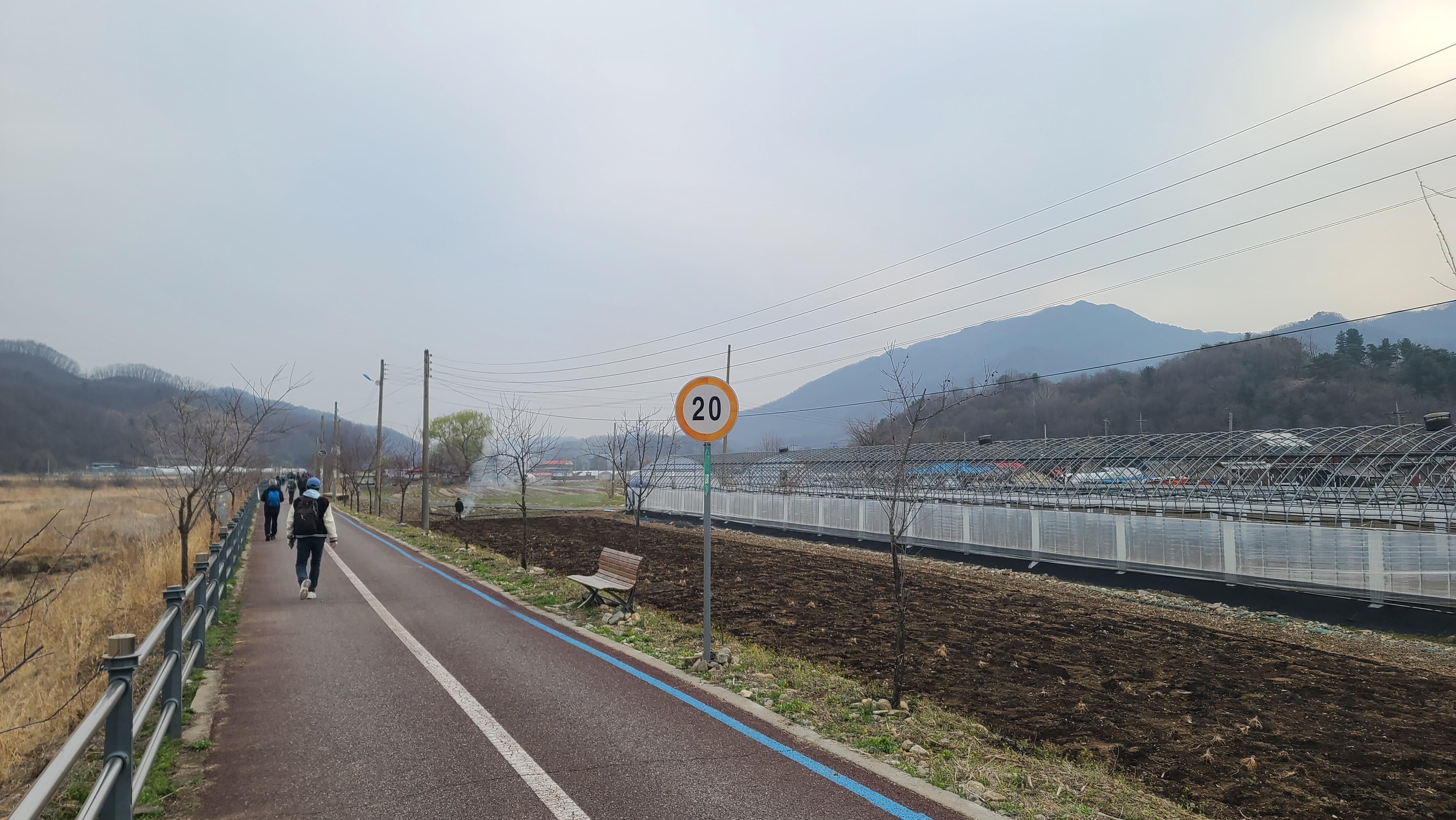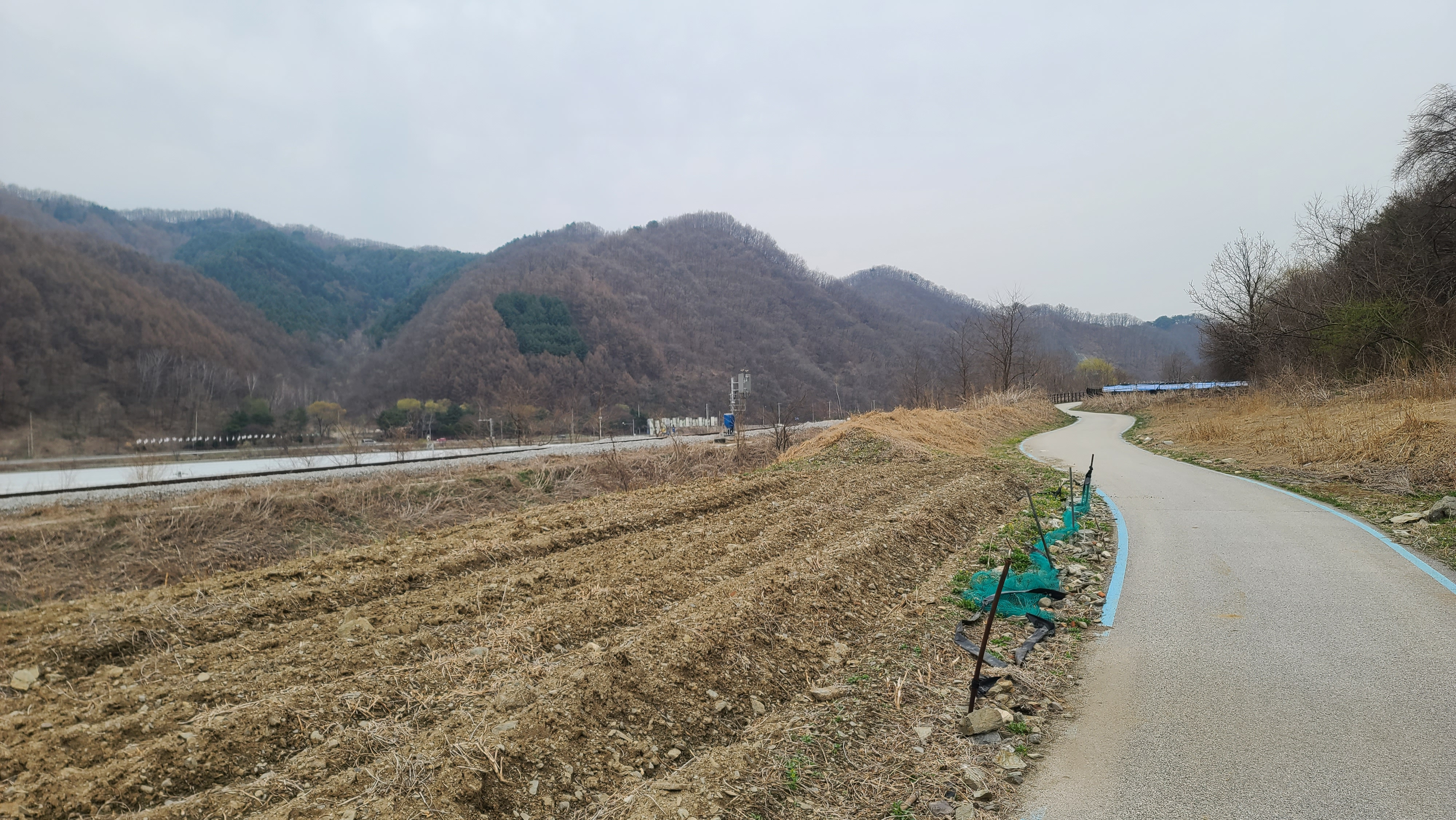차탄천 제방 '희망온길'을 따라 대광잠수교 방향으로 올라간다. 오른쪽에 비닐하우스 농장이 있고 오른쪽 뒤에 고대산이 솟아 있다.