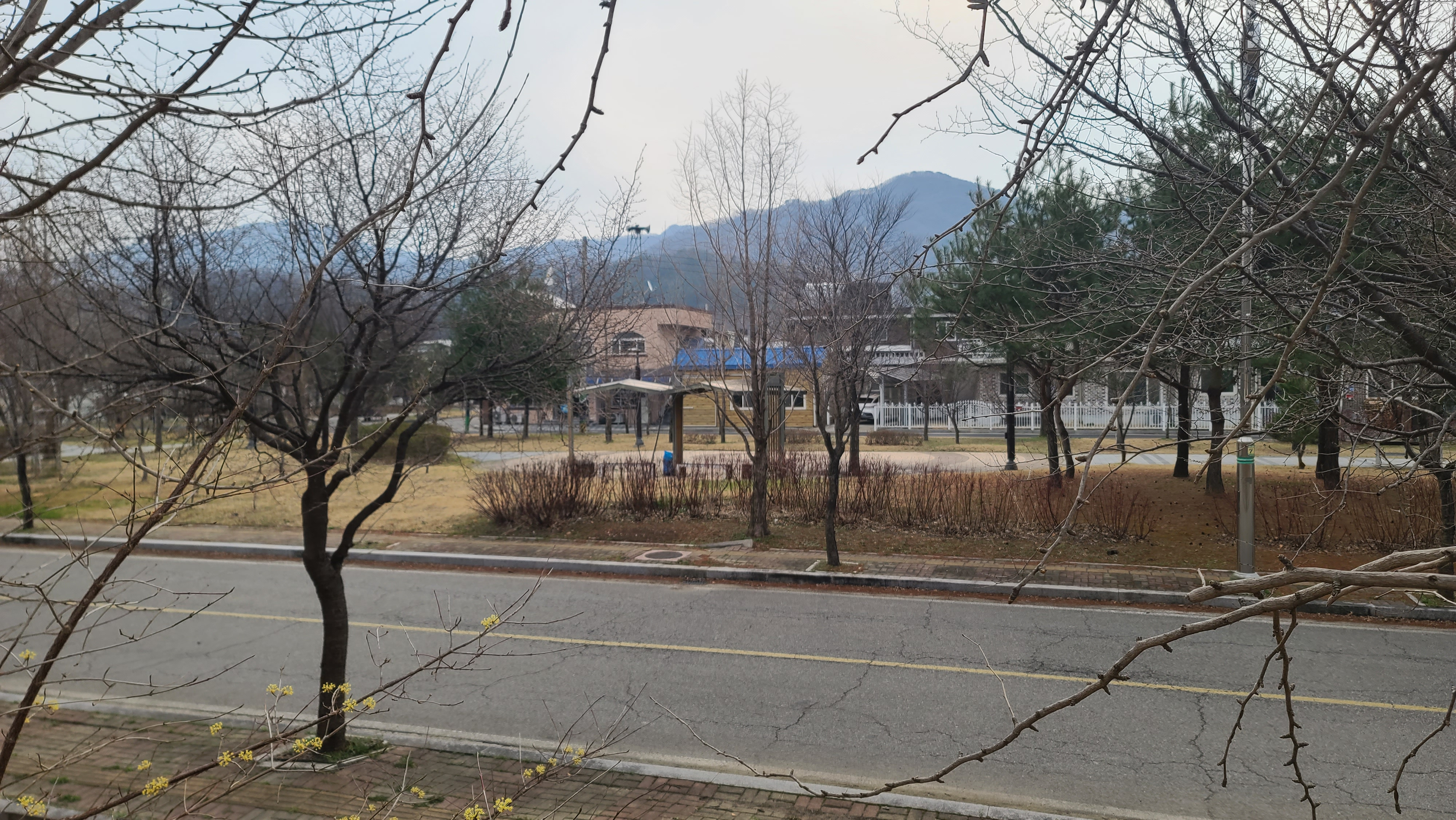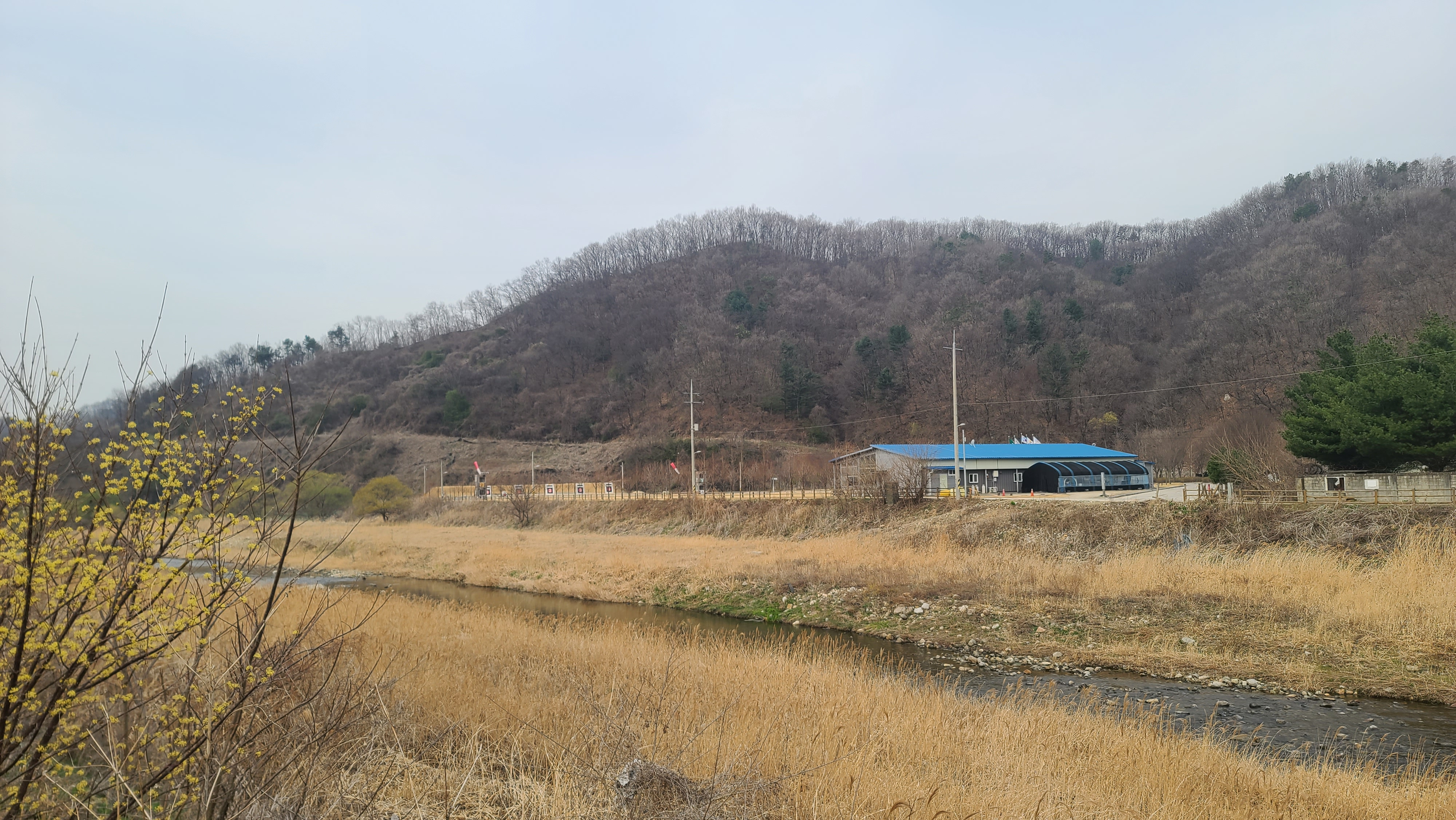 제1부(대광리역~고대산역고드름 입구) : 연천군 신서면 도신1리 대광리수변공원에서 차탄천 동쪽 제방 강변길로 올라갔다. 차탄천 건너편에는 2018년 11월 개정(開亭)한 전통활터 고대정((高臺亭)이 있다. 이른 시각이어서 고대정에는 궁사들이 아직 보이지 않는다. 날씨가 쾌청하지 않고 흐릿하다. 흐린 날씨 때문에 우울해지는 마음을 바로잡고, 평화의 길 탐방의 부푼 꿈으로 차탄천 제방 강변길을 걷는다. 강변길은 개나리지구 '행복큰빛길'로 명명되어 있는 구간이다. 선봉교~ 대광2교 구간은 행복큰빛길, 대광2교~대광잠수교 구간은 희망온길이다. 강변길의 개나리꽃은 이미 흔적도 없이 사라졌고, 산수유 노란 꽃은 시들고 빛이 바래져 맑지 않다.