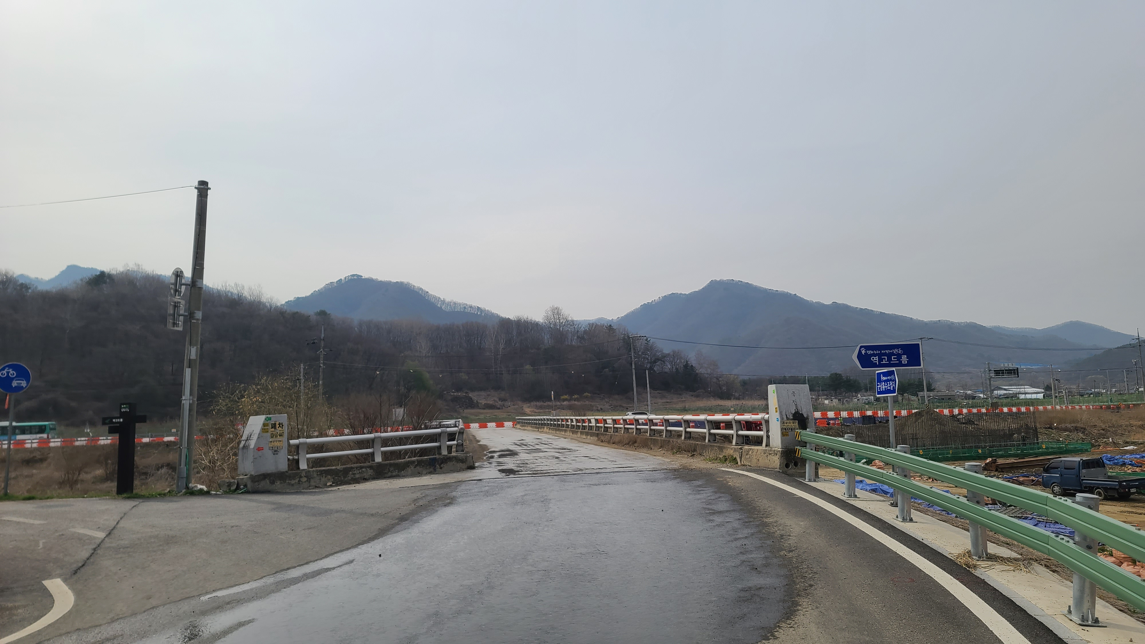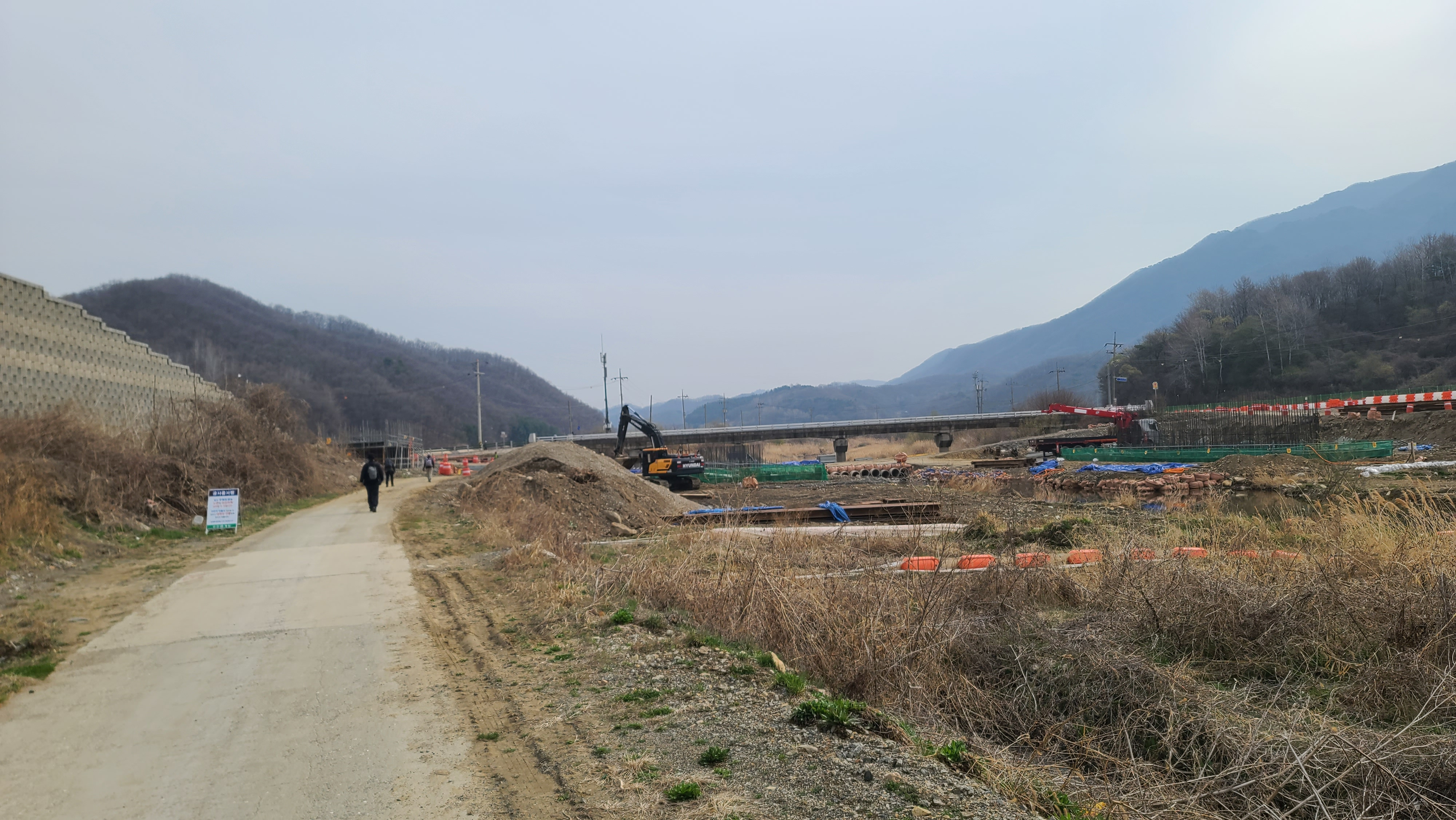 용천교 서단에서 차탄천 서쪽 제방길을 따라왔다. 건설 중인 대광리 우회도로가 오른쪽으로 돌아가고 중앙 뒤의 산봉은 수리봉인 듯. "수리봉은 소목개 북쪽에 있는 높은 봉우리. '높음'과 '으뜸'의 뜻으로 쓰였던 고어 '술'이 '수리'로 연철되어 봉(峰)과 합쳐진 이름으로, 높은 봉우리라는 뜻이다." - 연천군청