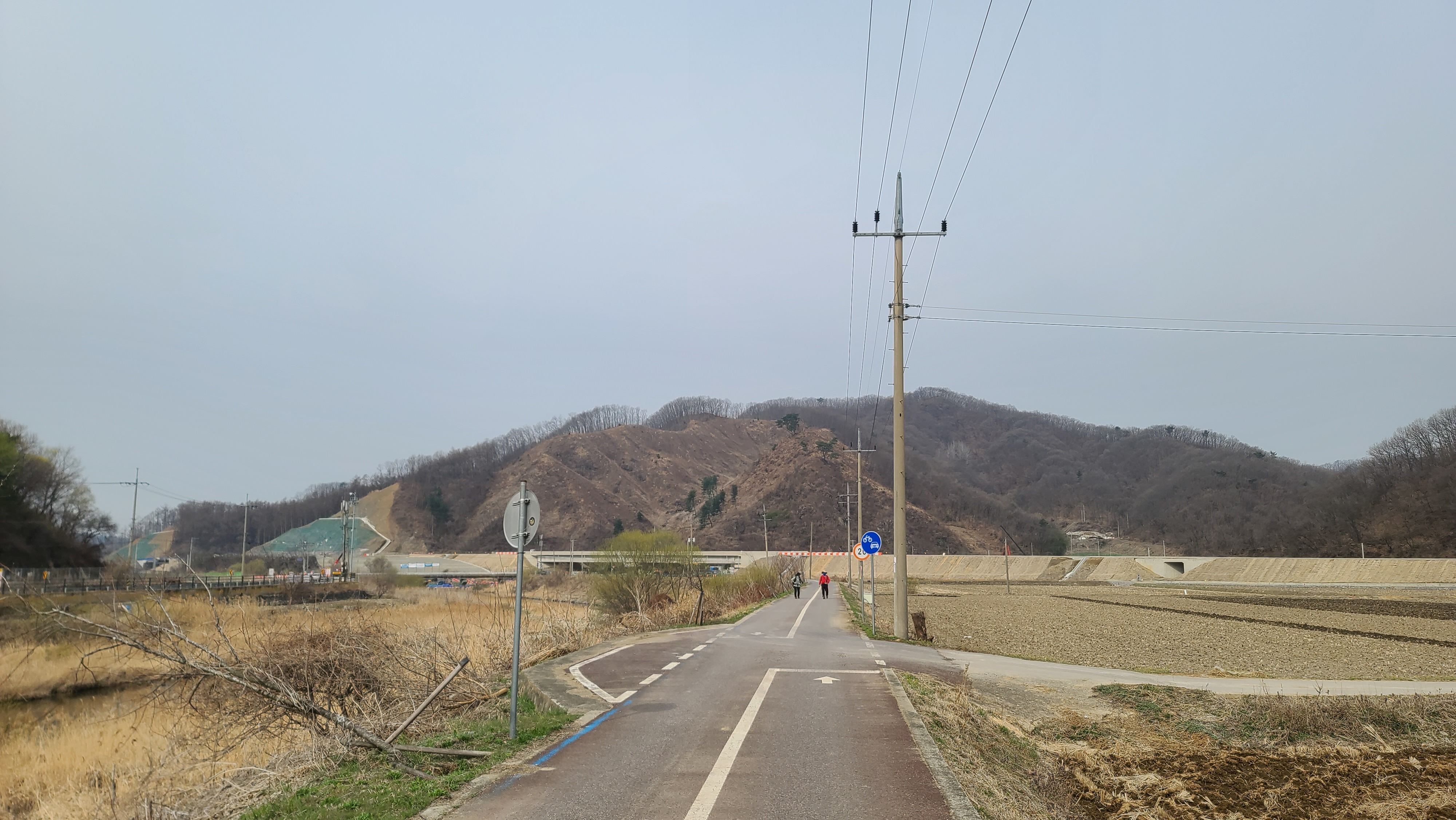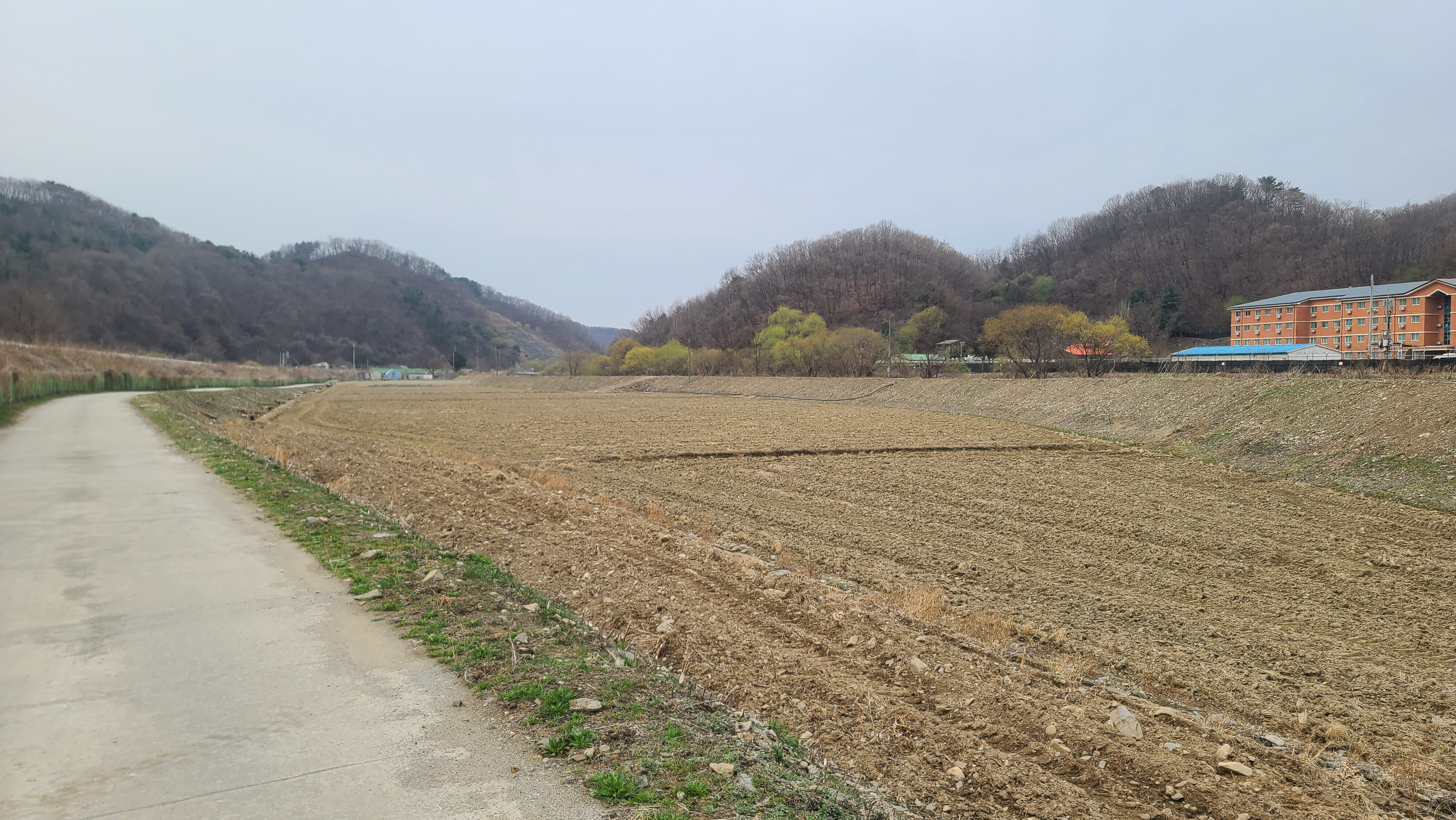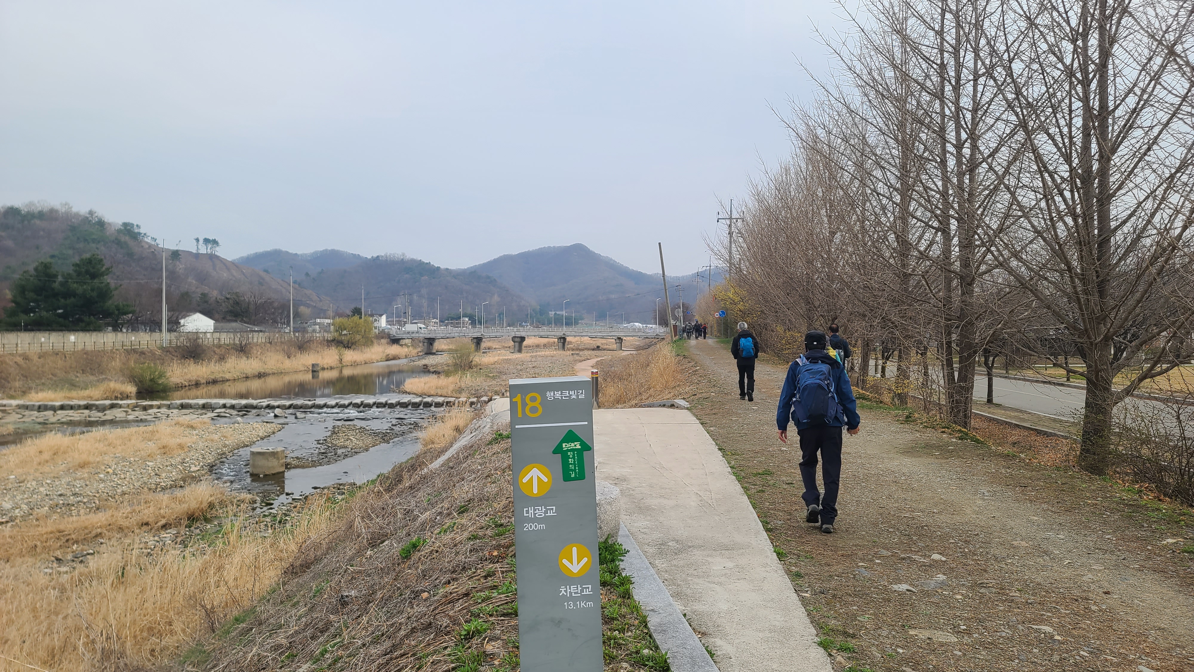 차탄천 동쪽 제방길을 따라 북진한다. 밭에서는 농부들이 봄농사일에 바쁘다.