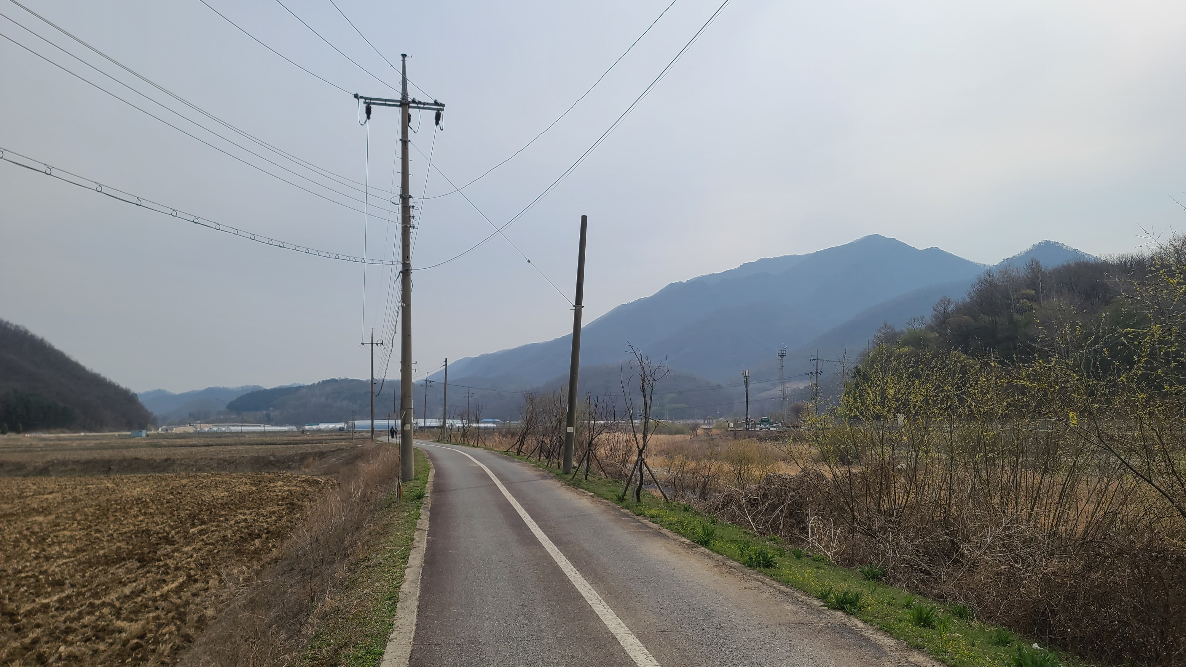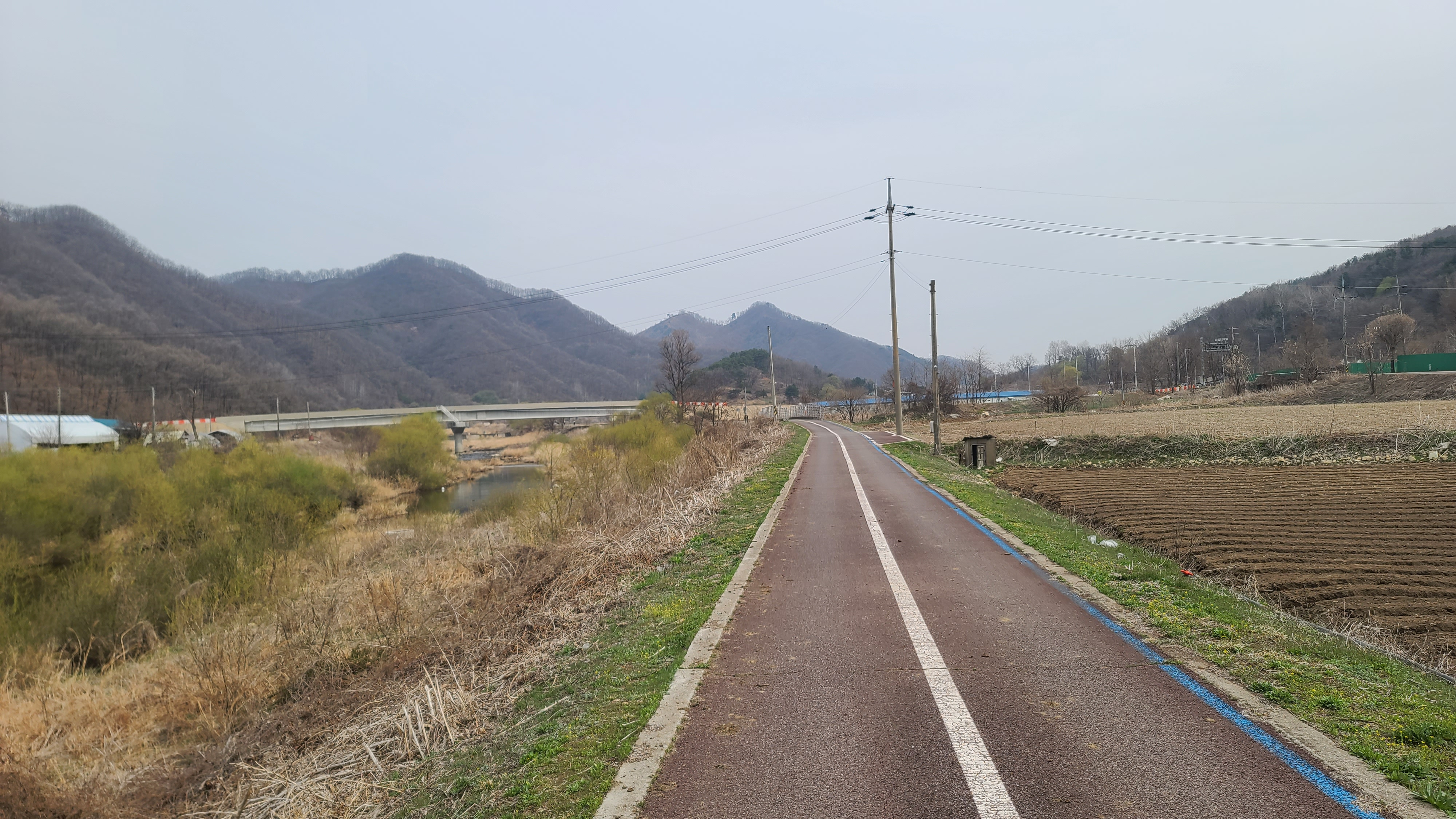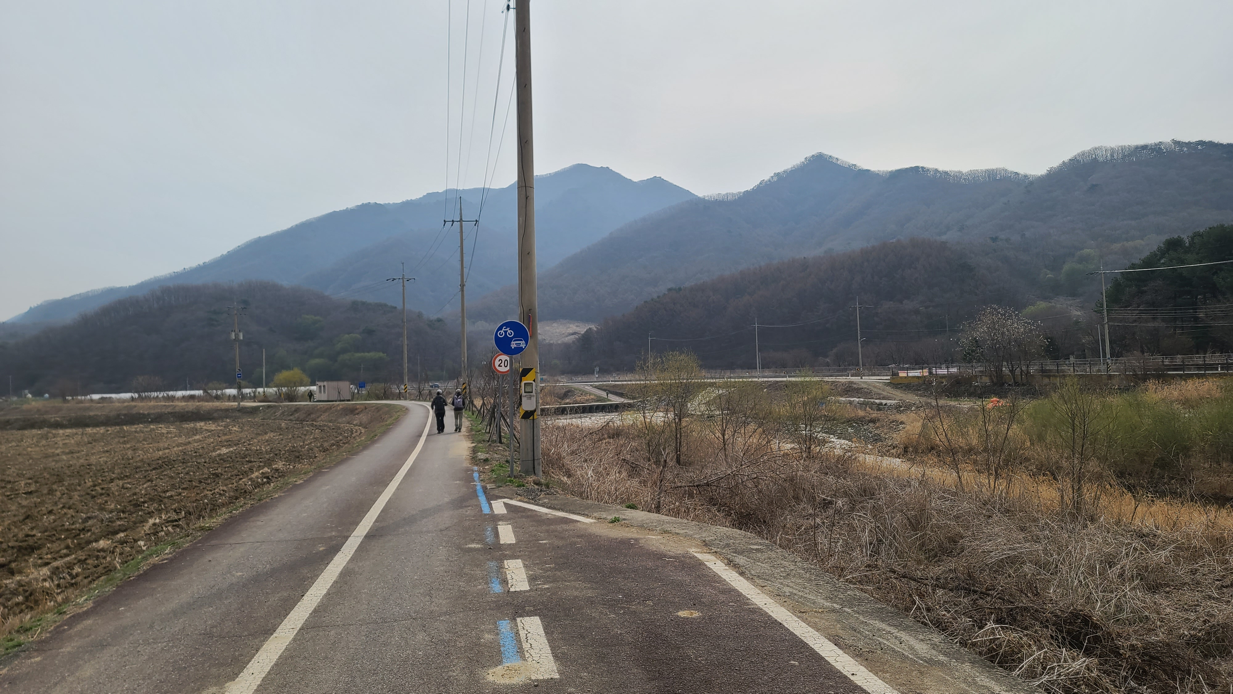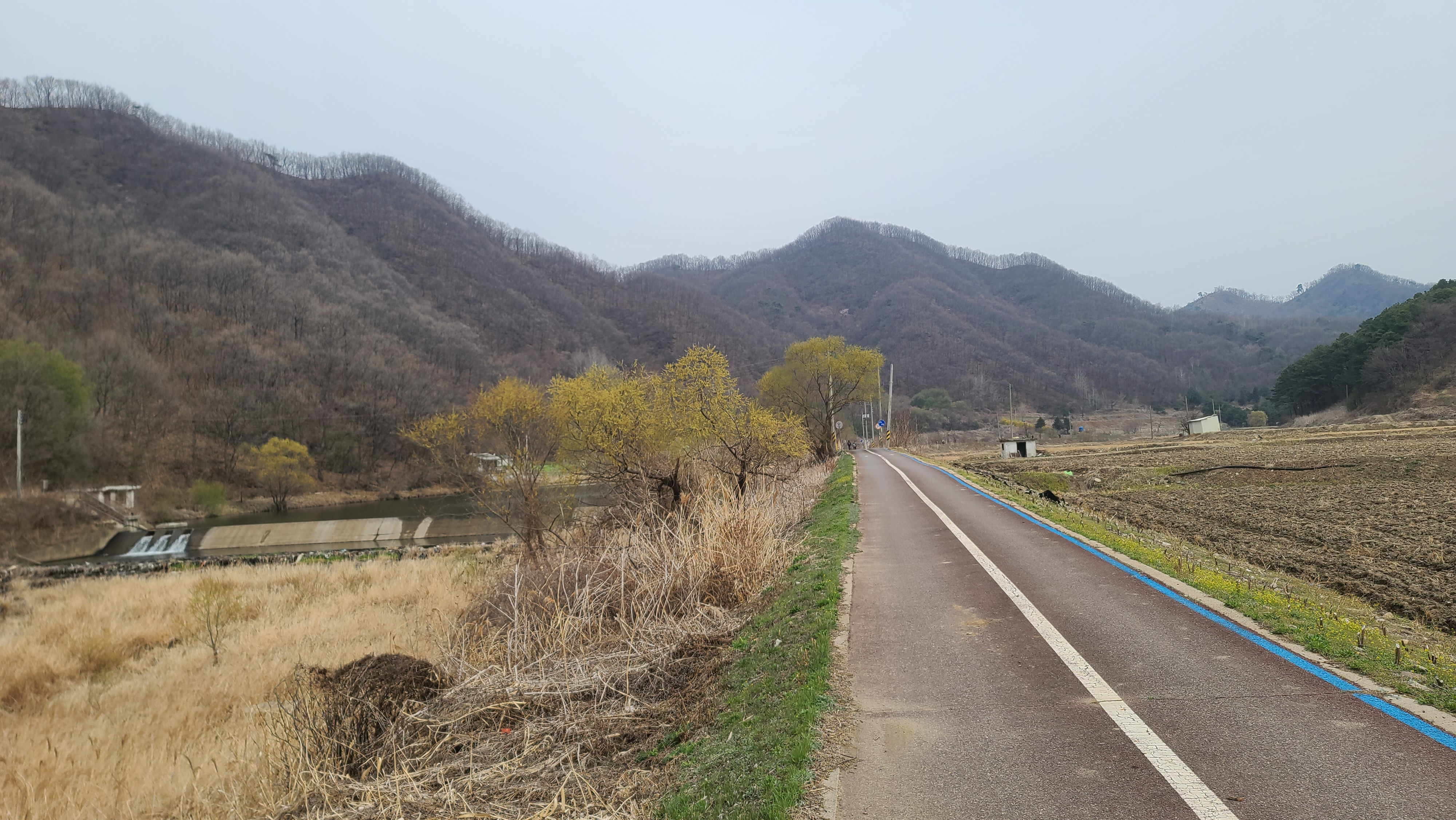 차탄천 동쪽 제방길을 따라 북진한다. 밭에서는 농부들이 봄농사일에 바쁘다.
