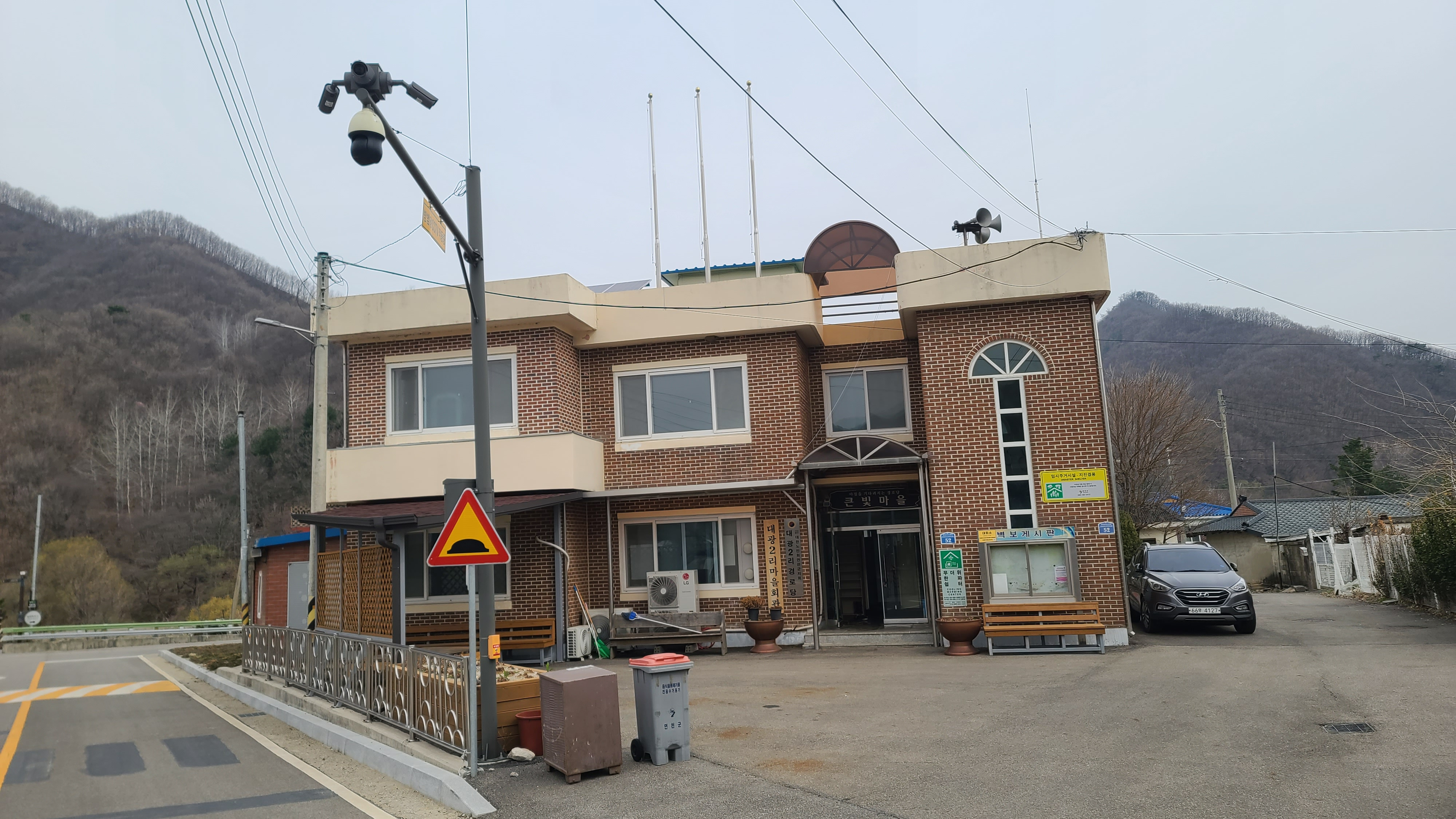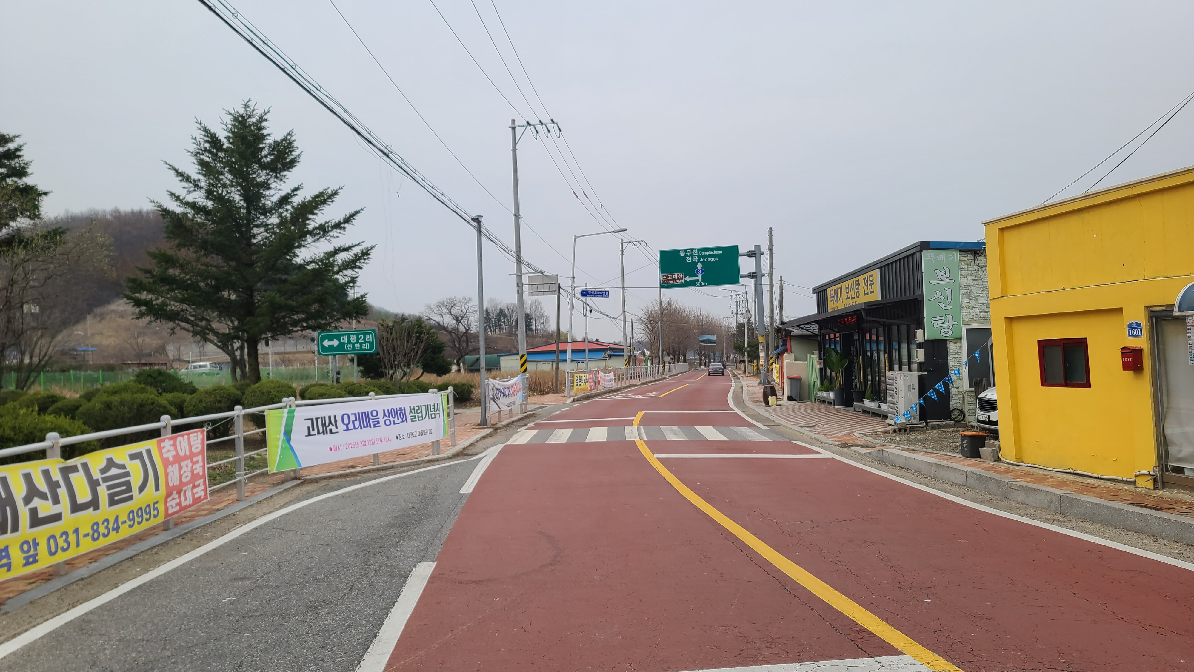 오른쪽에 대광배드민턴체육관이 자리하고, 중앙 뒤에 신탄리(대광2리) 지역에서는 '큰고래'라 부르는 고대산이 솟아 있다.