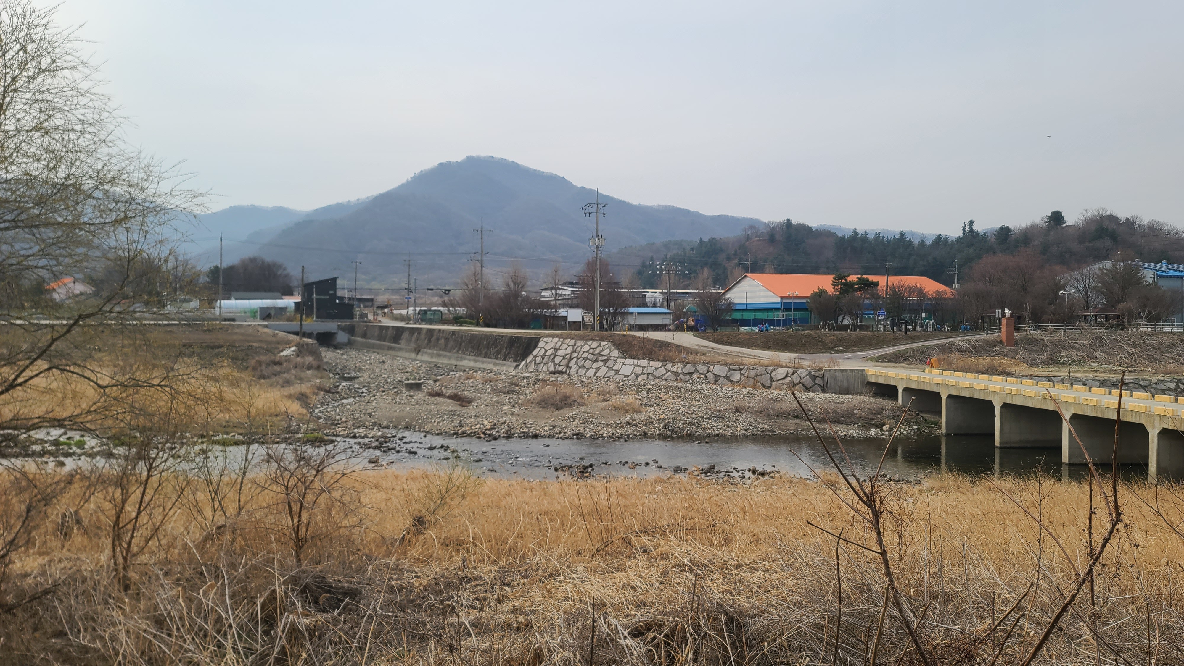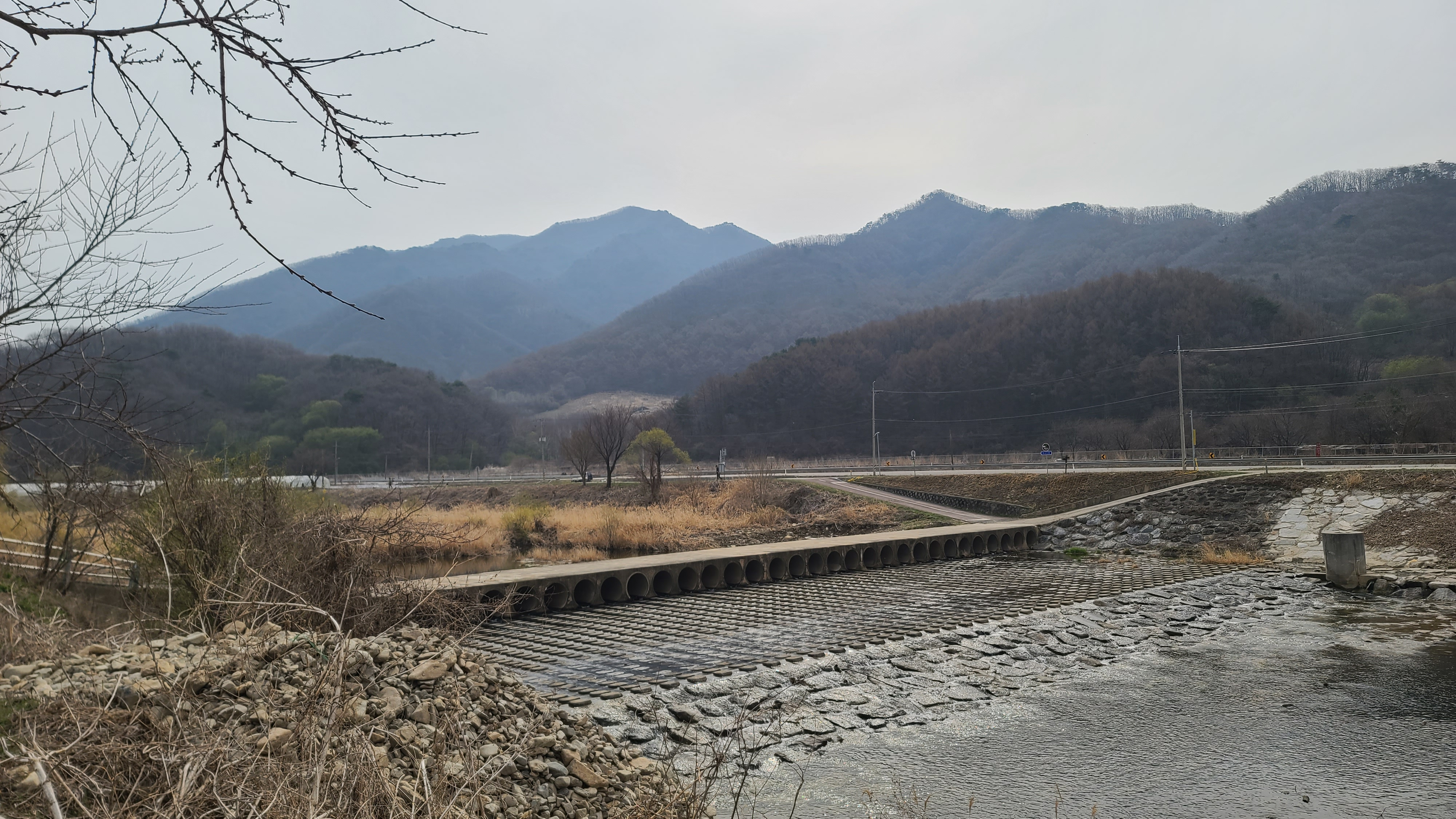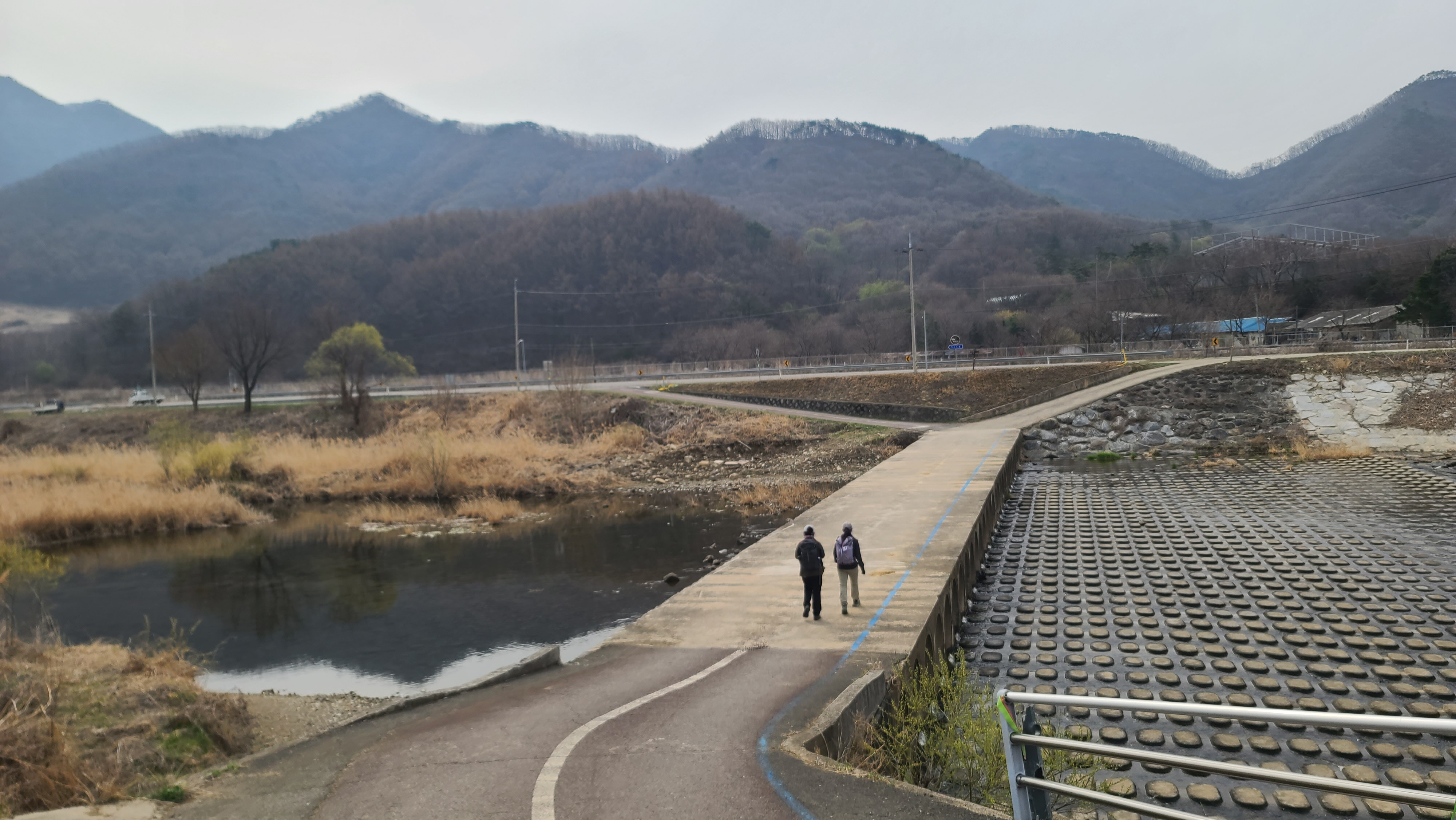 차탄천 서쪽 제방길을 따라오르다 차탄천의 잠수교를 건넌다. 중앙 뒤에 고대산은 평화의 길 상징처럼 솟아 있다.