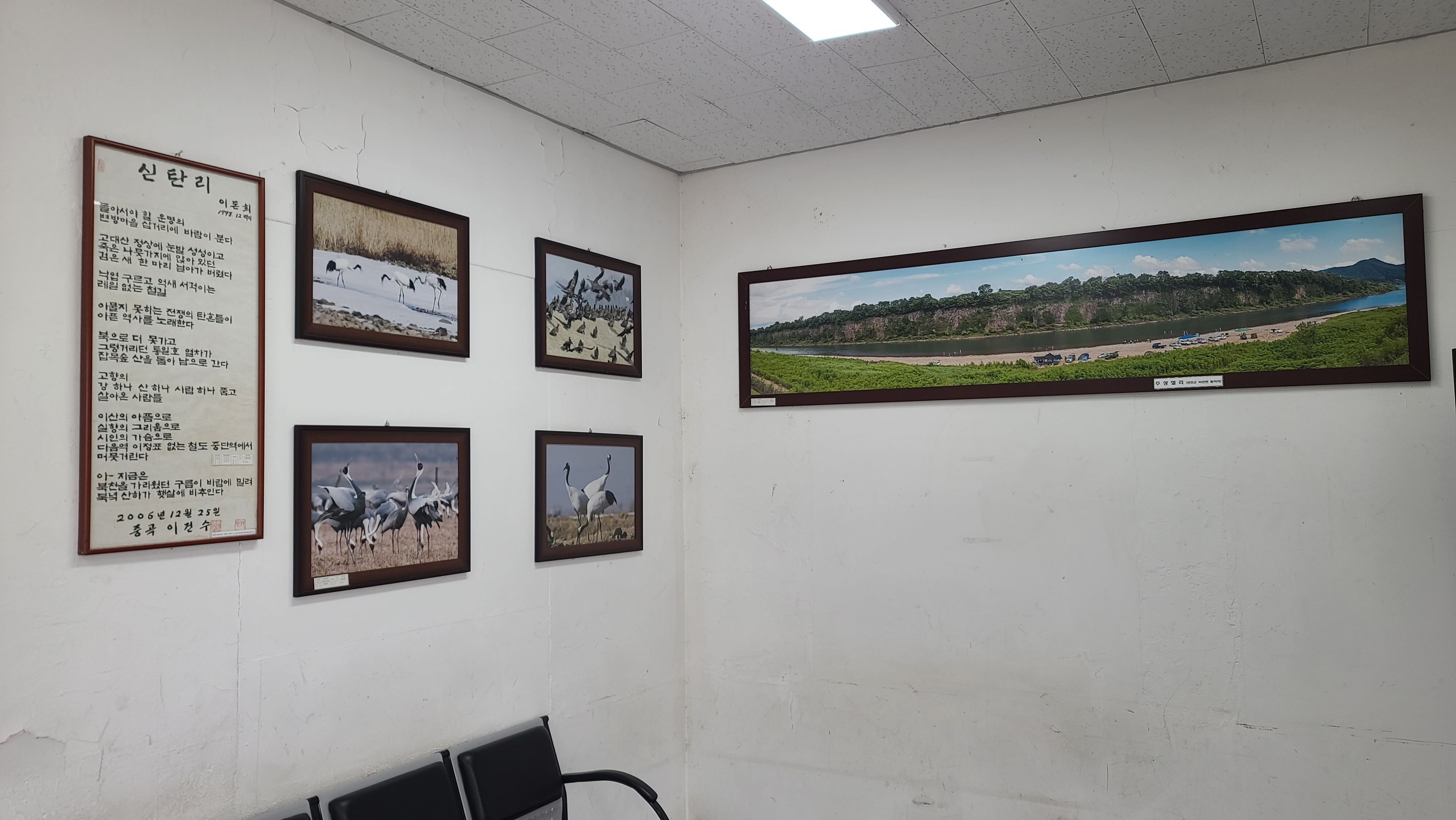 이돈희의 시 '신탄리'를 이건수가 적은 시 게시판과 두루미와 임진강 주상절리를 짝은 사진전시판이 벽면에 붙어 있다.