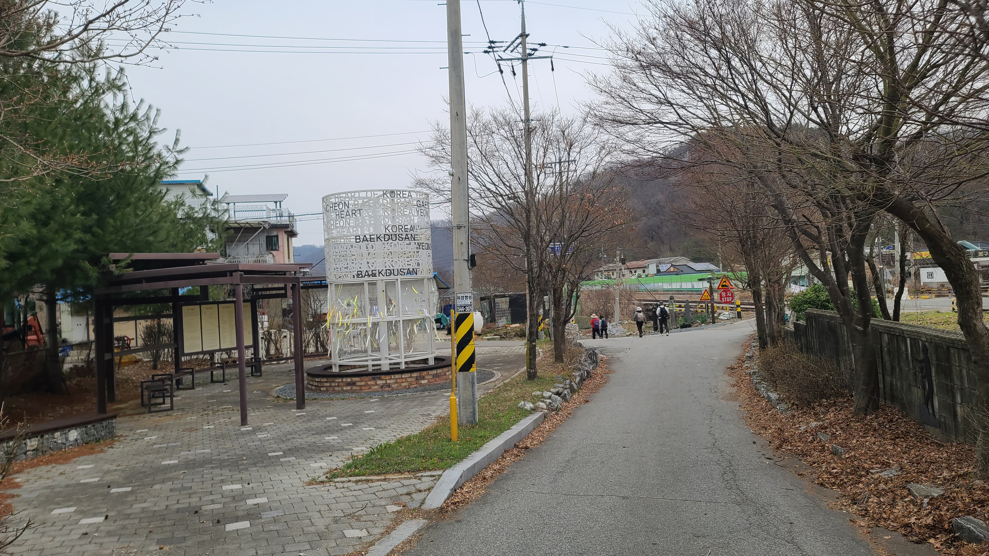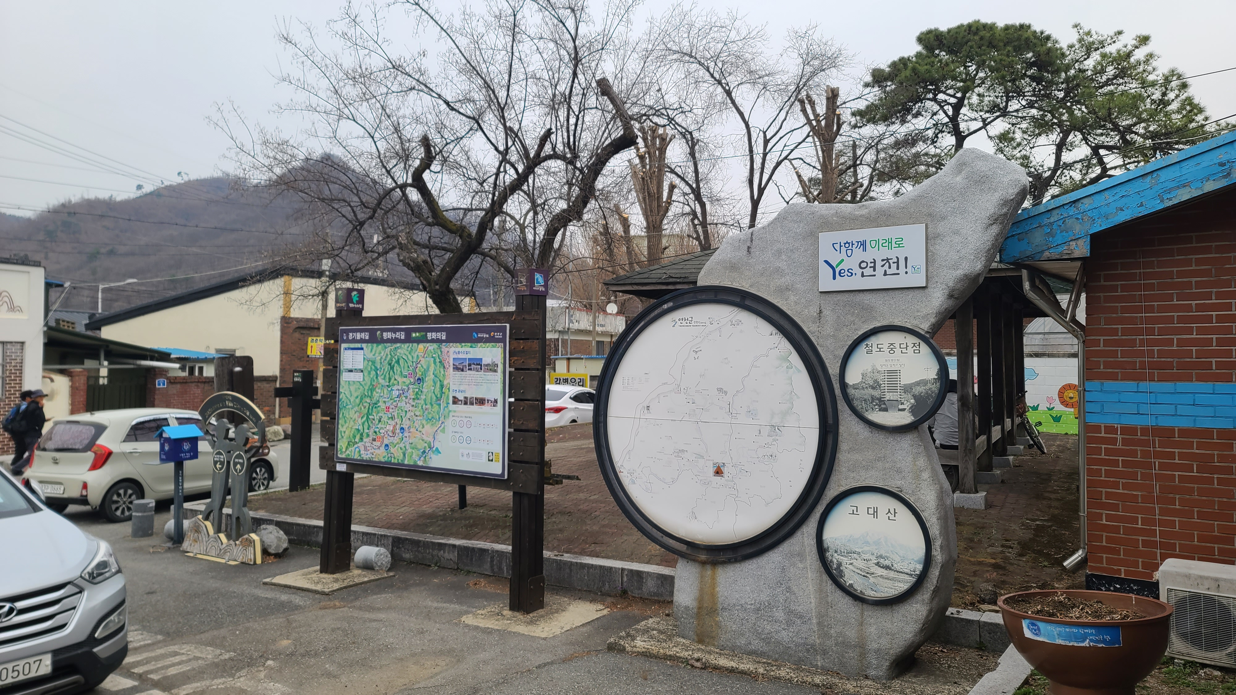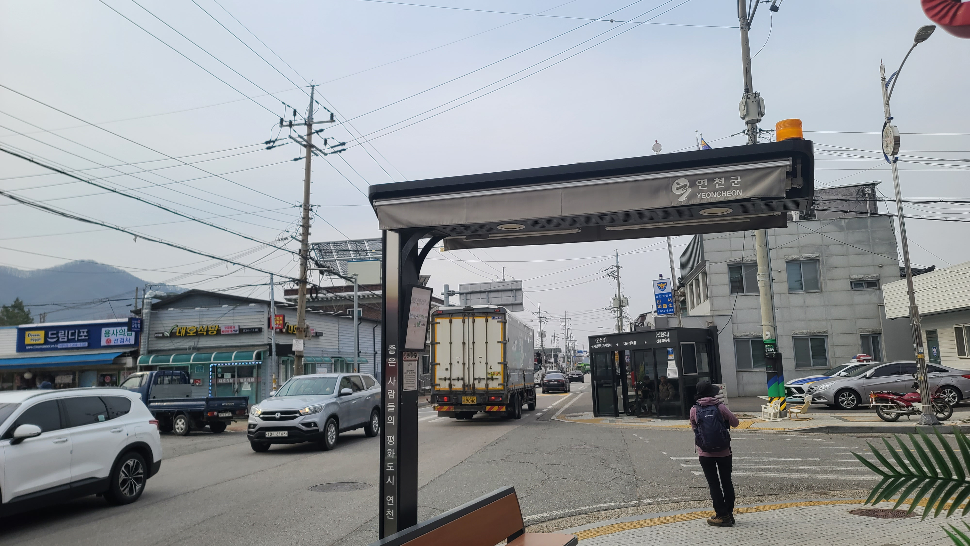연천군의 슬로건 '좋은 사람들의 평화도시 연천'이 그늘막 기둥에 적혀 있다. 건너편에 신서파출소, 왼쪽에 대광리역이 있다. DMZ 평화의 길 14코스 시작지점은 오른쪽 차탄천 방향으로 나간다.