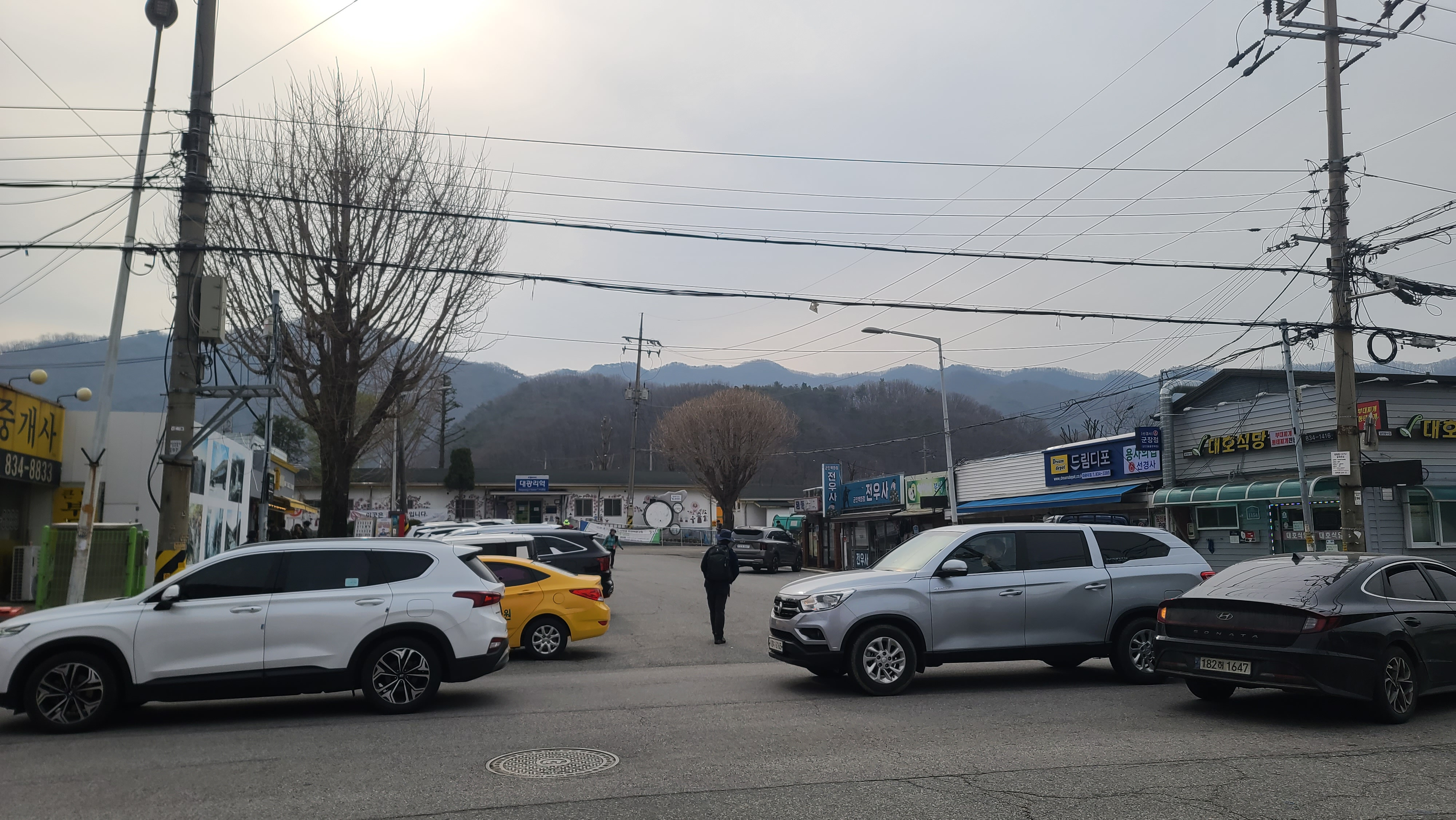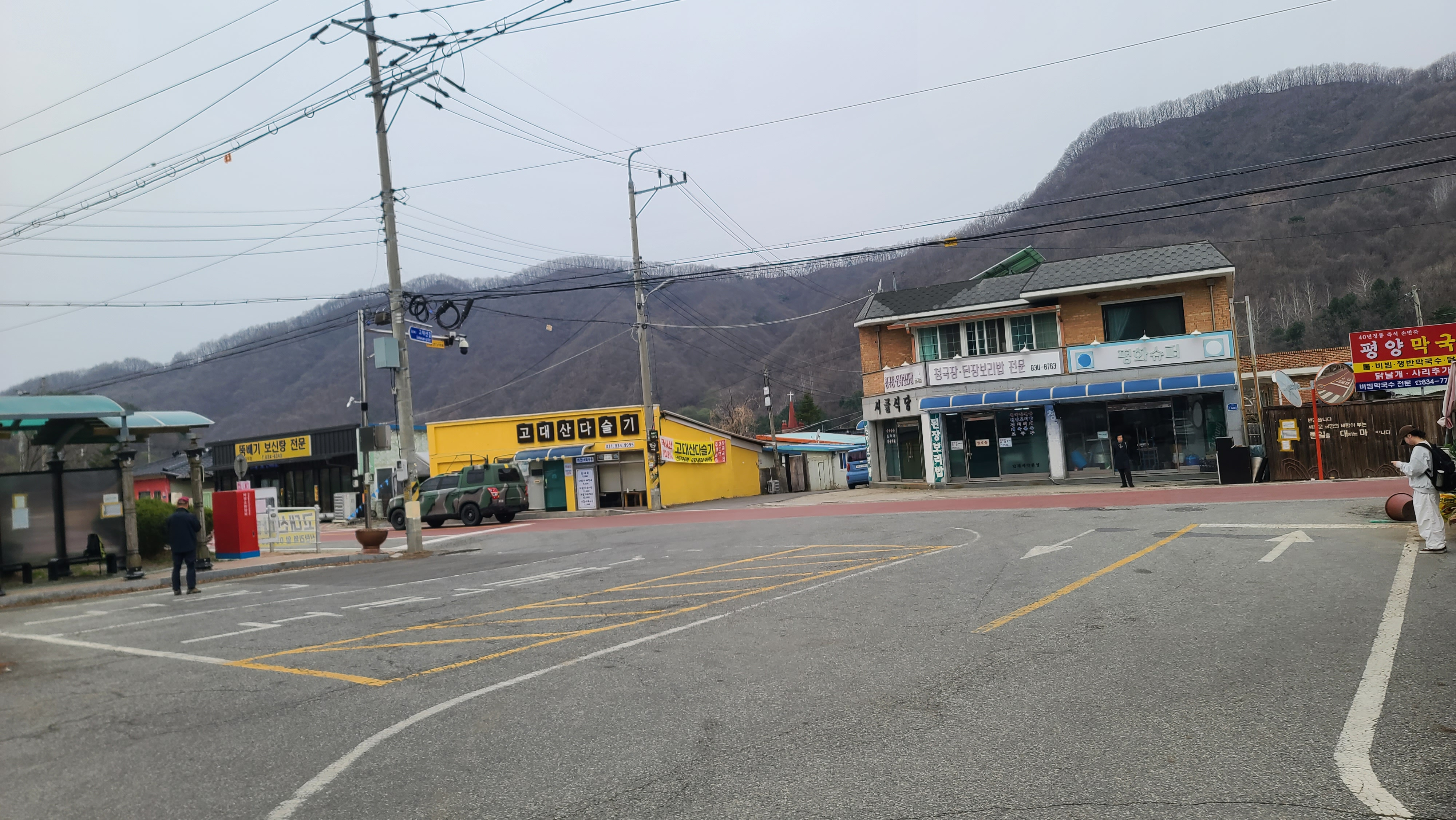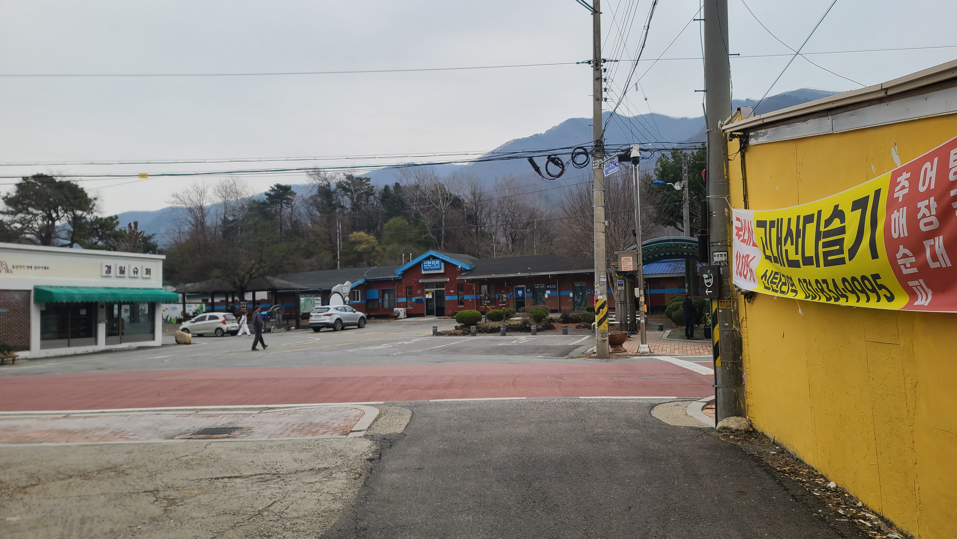 연천군의 슬로건 '좋은 사람들의 평화도시 연천'이 그늘막 기둥에 적혀 있다. 건너편에 신서파출소, 왼쪽에 대광리역이 있다. DMZ 평화의 길 14코스 시작지점은 오른쪽 차탄천 방향으로 나간다.