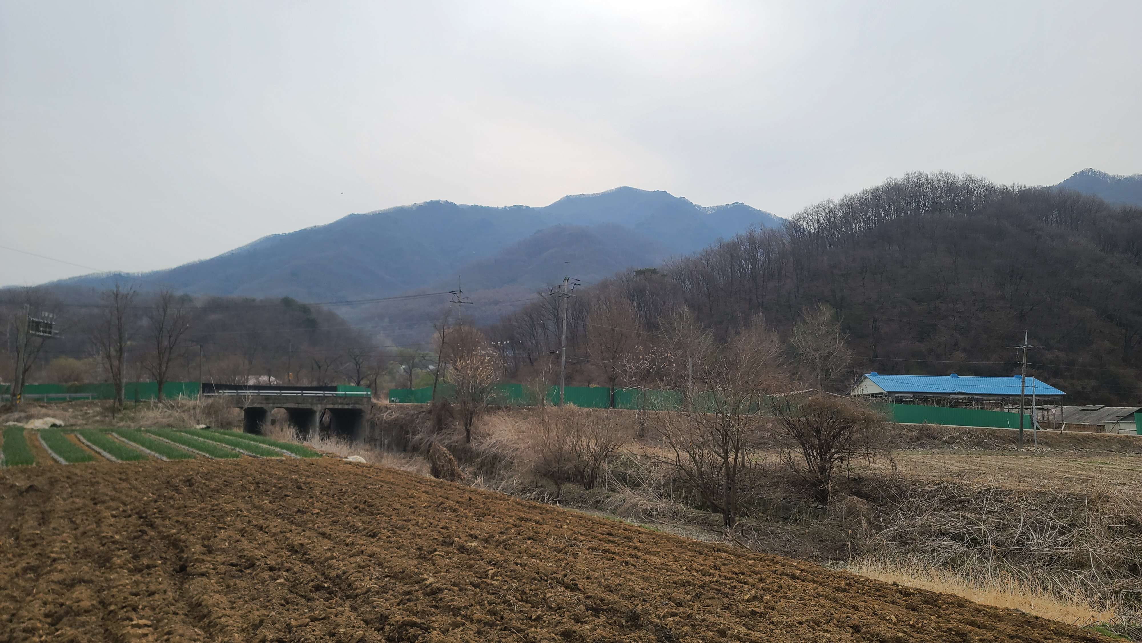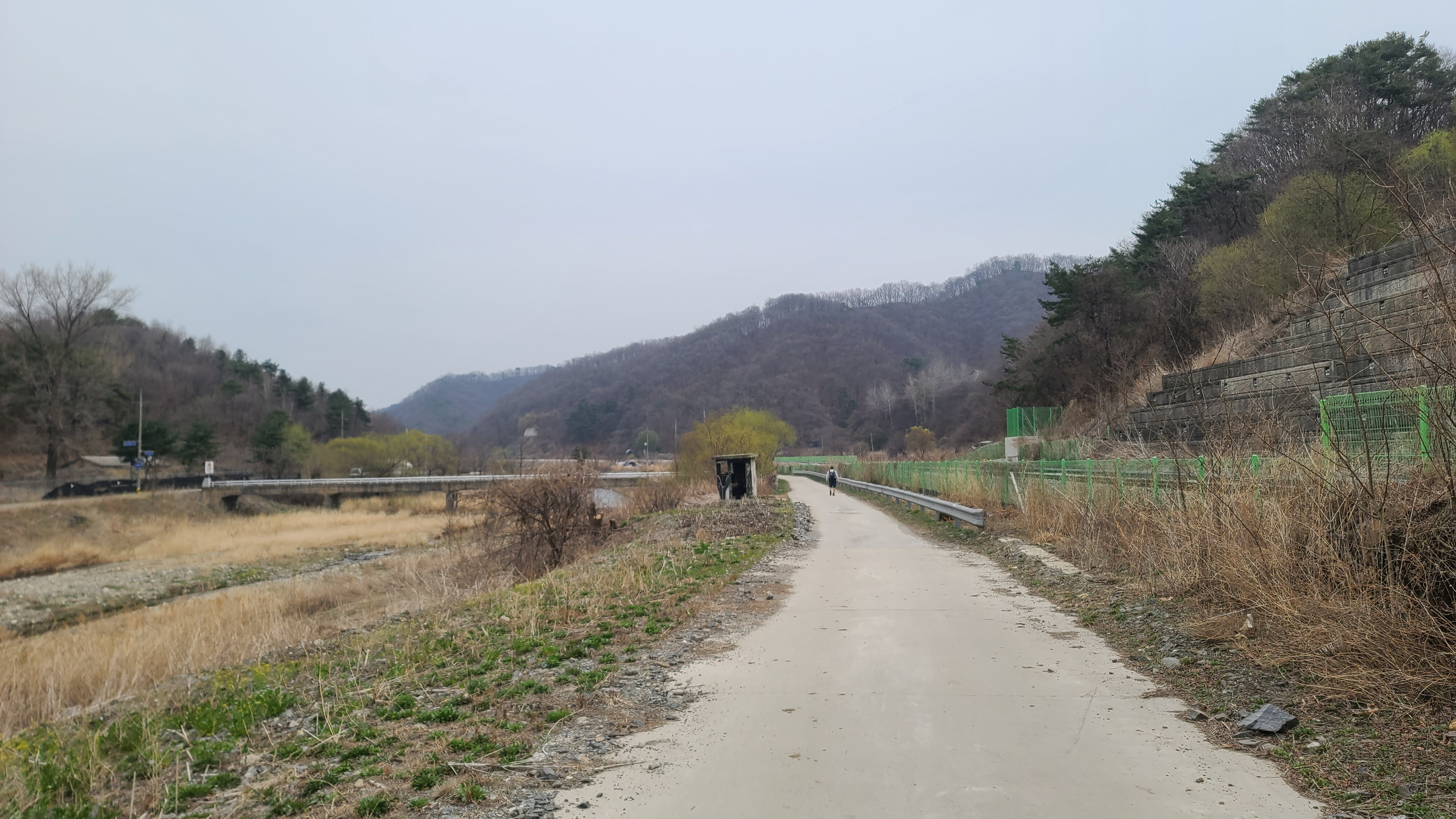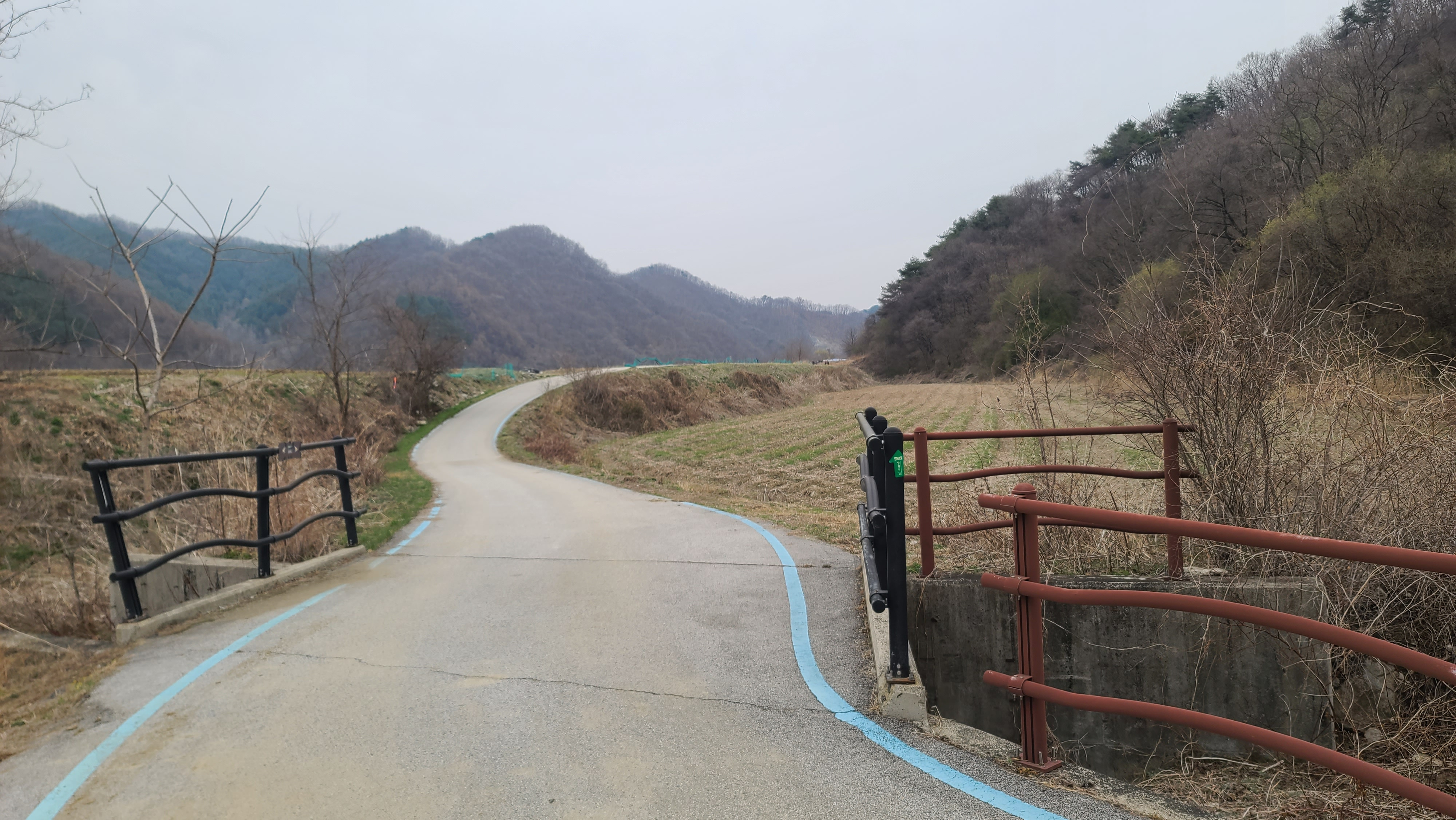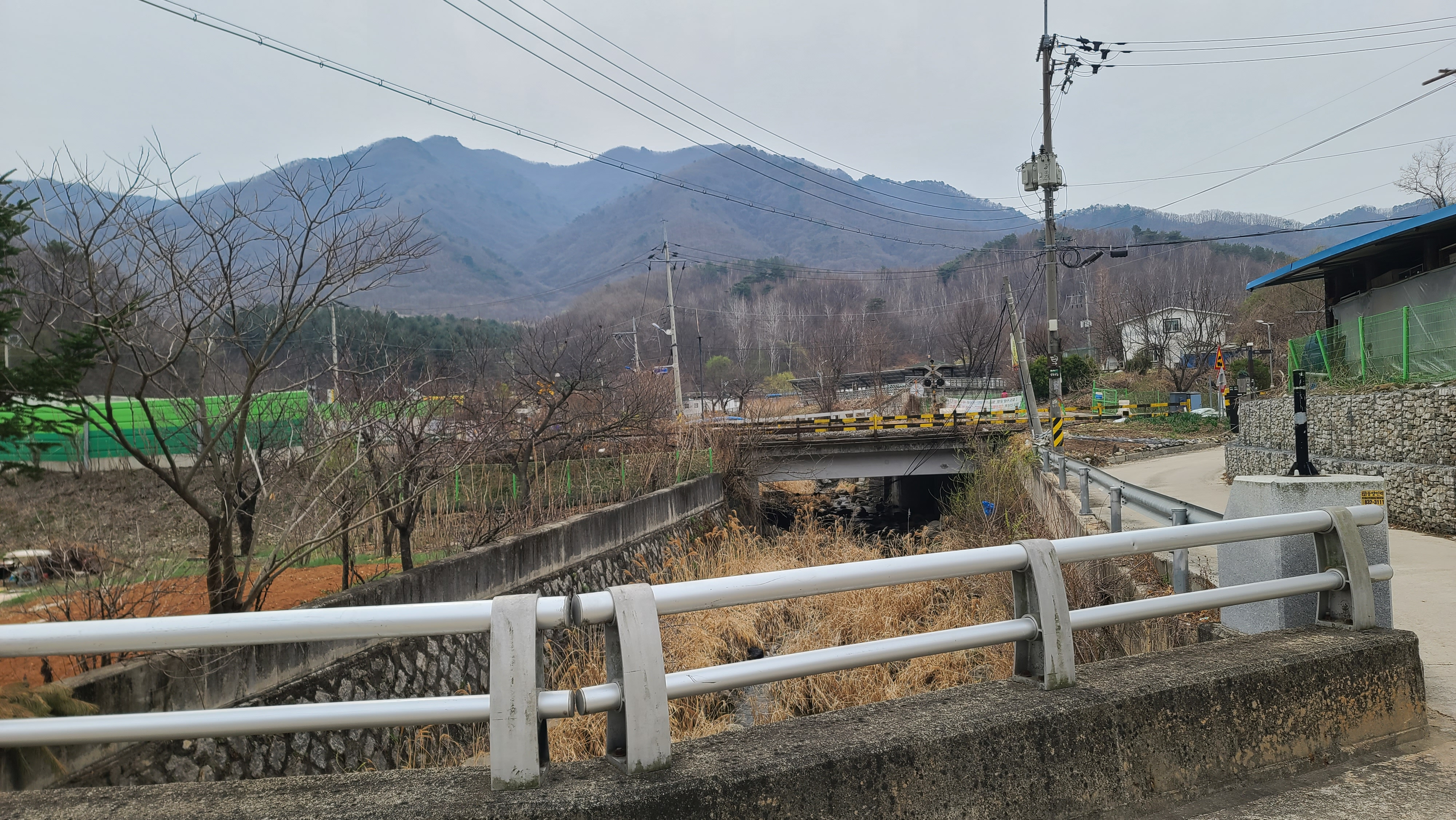고대산1호교를 건너며 오른쪽 뒤의 경원선 철도건널목을 돌아보았다. 왼쪽 뒤에 고대산이 솟아 있다.