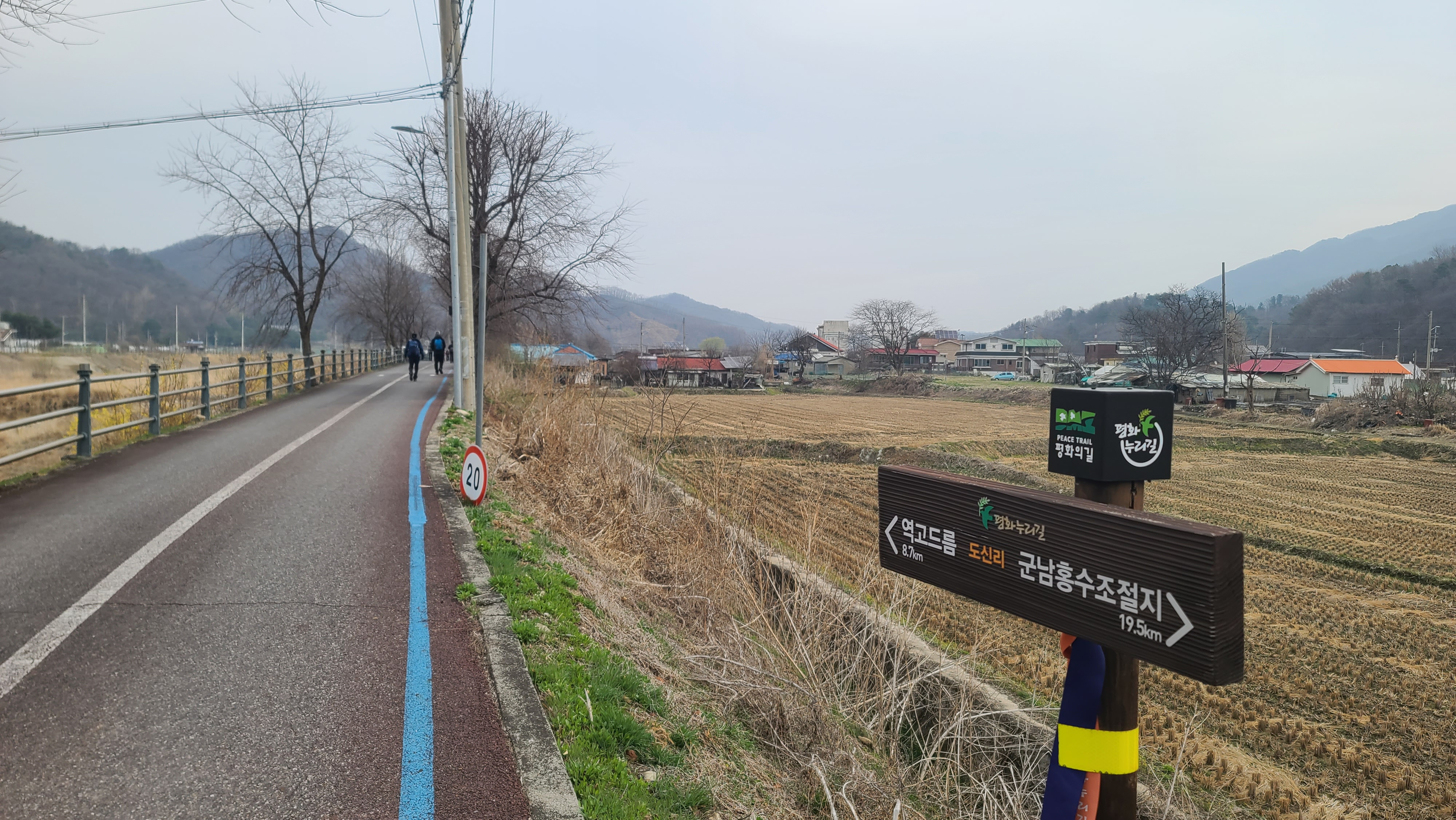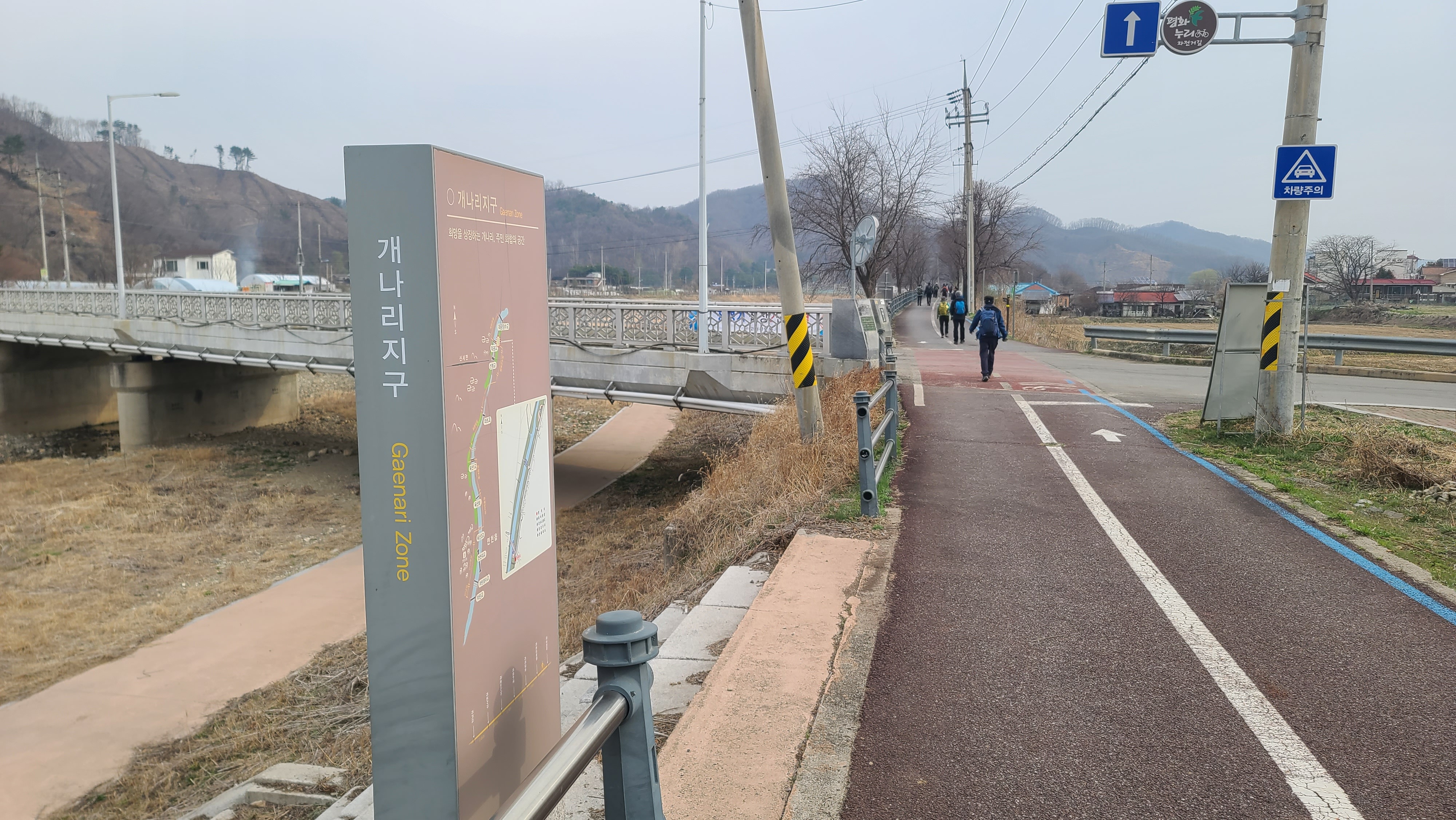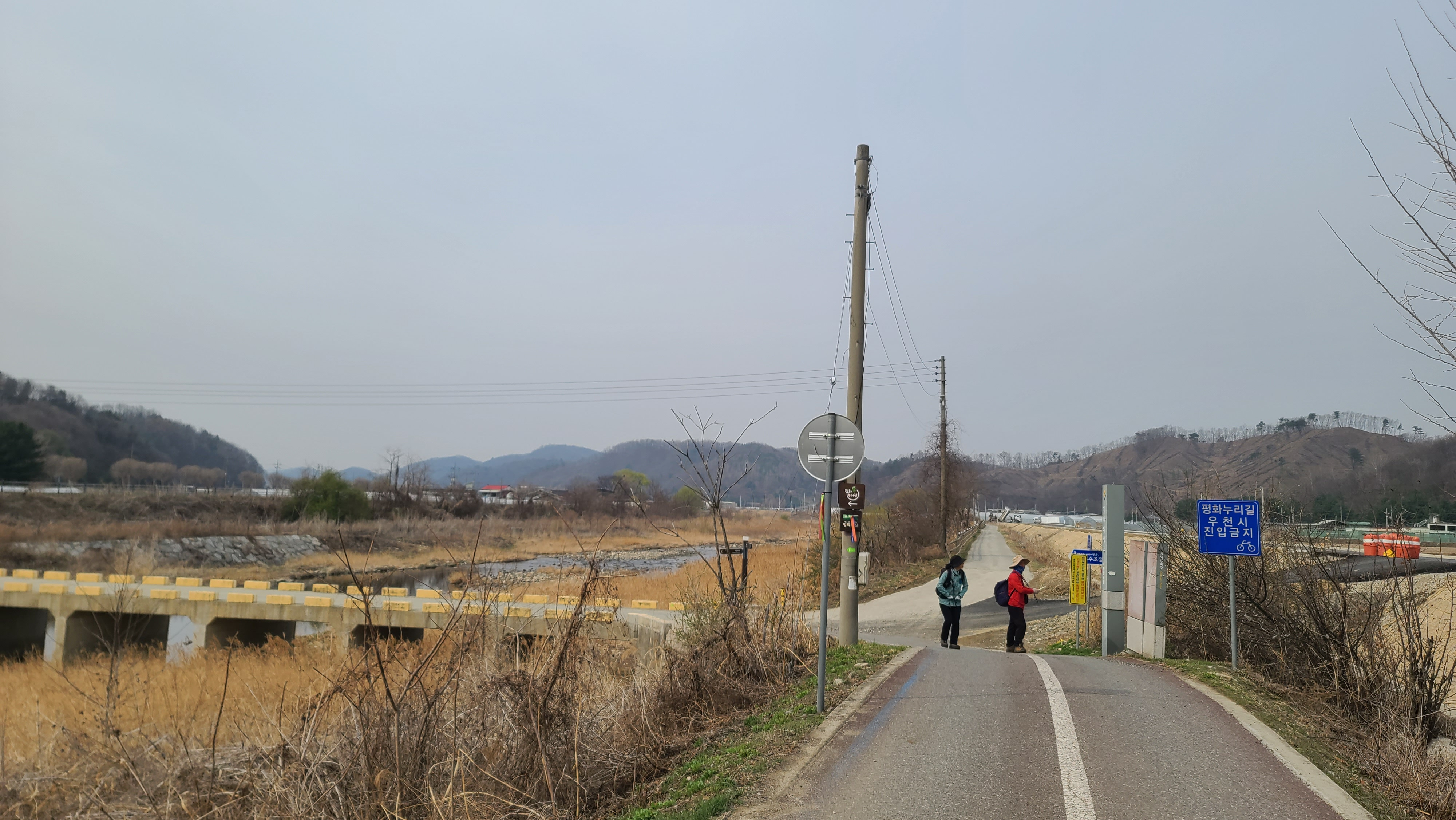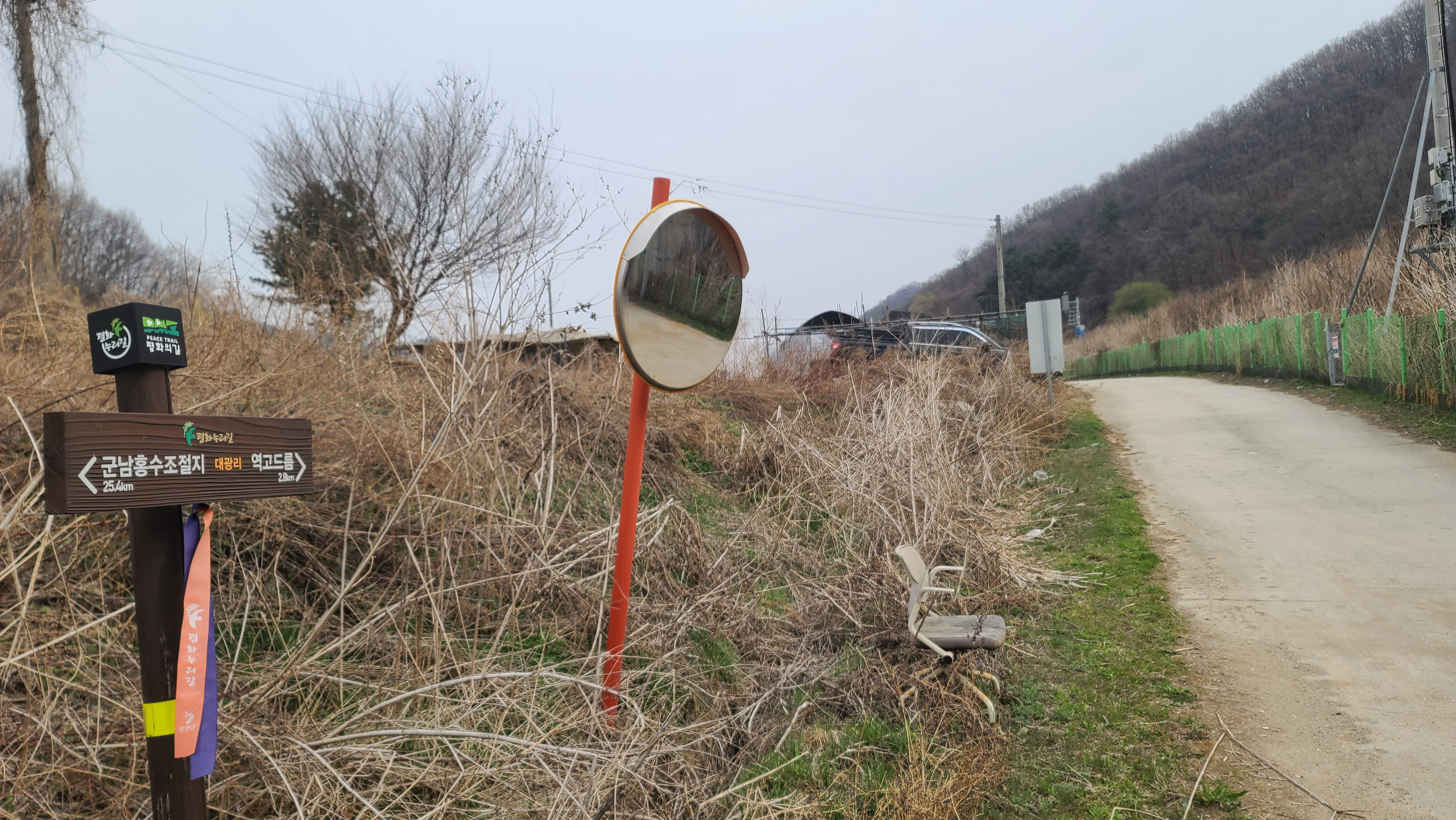 중부전선의 중심 군부대의 하나인 '통일의 문을 여는 열쇠부대'를 대광2교 건너편으로 살피며, '희망온길'로 넘어갔다. 차탄천에 징검다리가 놓여 있어 징검다리를 건너 차탄천 서쪽의 소목개마을로 건너고 싶은 충동이 일어난다. 차탄천 동쪽 제방 안쪽에는 대광1리 마을과 현무암 검은 토질의 들녘이 펼쳐지고, 그 동쪽에 고대산이 솟아 있어 고대산 산행 추억에 살포시 젖는다. 대광잠수교 입구에 자리한 대광배드민턴 체육관 뜰에서는 대광1리 마을 자원봉사자들이 마을을 아름답게 가꾸기 위해 청소를 하고 있다. 체육관 북쪽 뜰에는 열린화장실이 있어 탐방객들이 이용할 수 있다. 이 풍경들이 평화롭고 사랑스럽다. 이 사랑과 평화의 풍경을 더 활짝 열어가야 하는데, 냉전과 분단의 연장, 더 나아가 전쟁을 부추기는 거친 소리들이 우리 내부에서 들려와 가슴이 쓰리다.