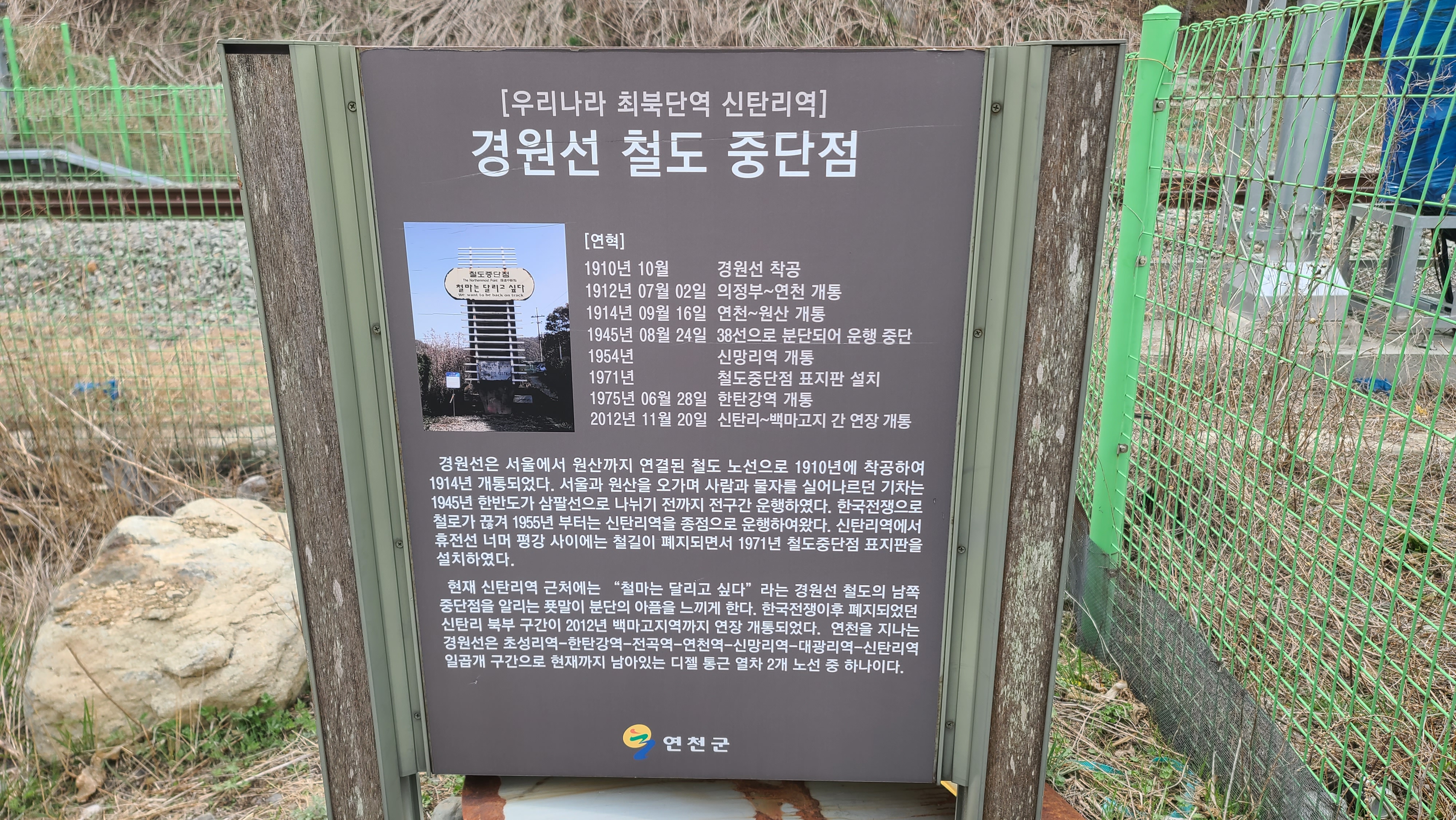 우리나라 최북단역 신탄리역, 경원선 철도 중단점 : [연혁] 1910년 10월, 경원선 착공/ 1912년 07월 02일, 의정부~연천 개통/ 1914년 09월 16일, 연천~원산 개통/ 1945년 08월 24일, 38선으로 분단되어 운행 중단/ 1954년, 신망리역 개통/ 1971년, 철도중단점 표지판 설치/ 1975년 06월 28일, 한탄강역 개통/ 2012년 11월 20일, 신탄리~백마고지 간 연장 개통