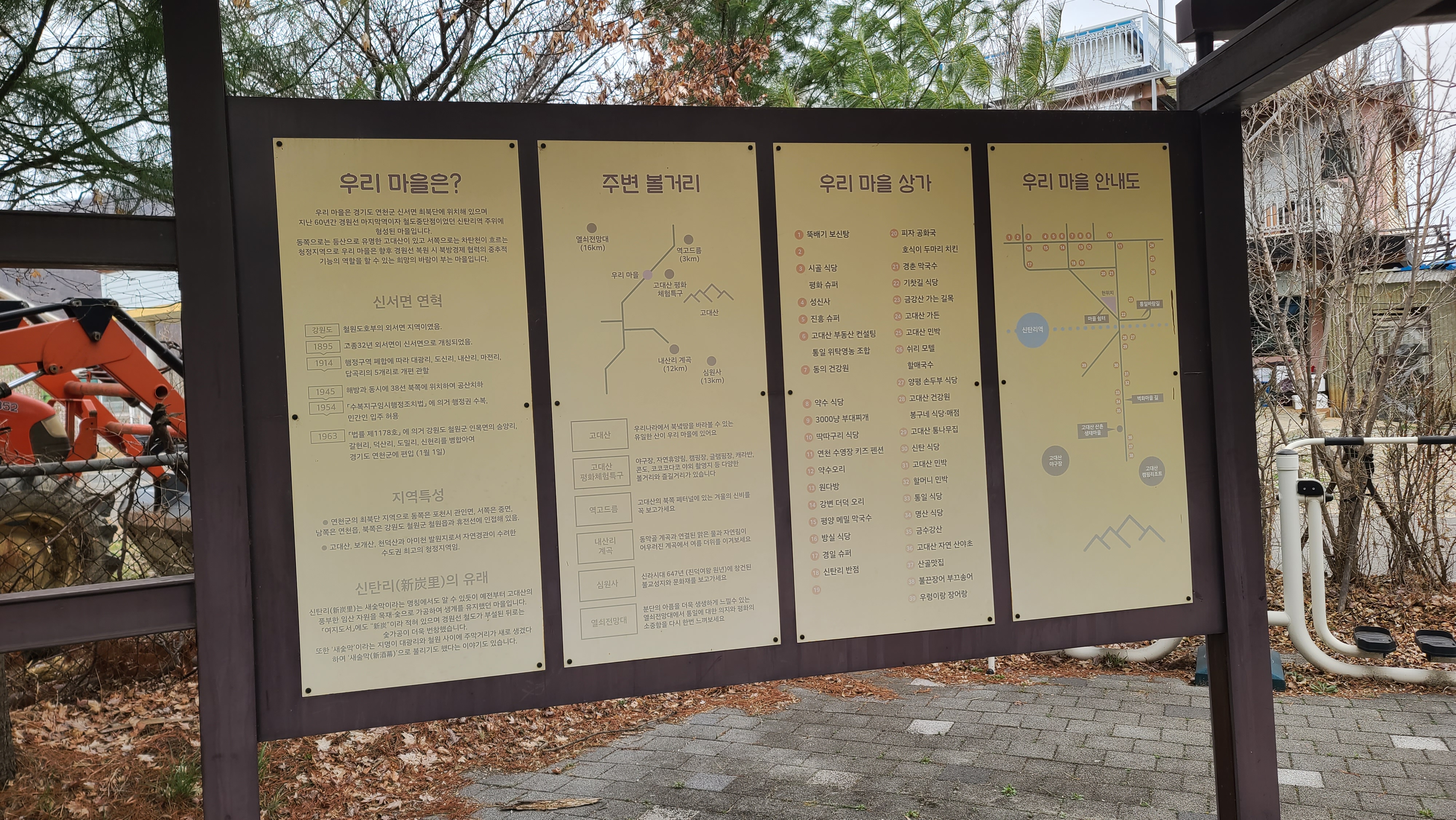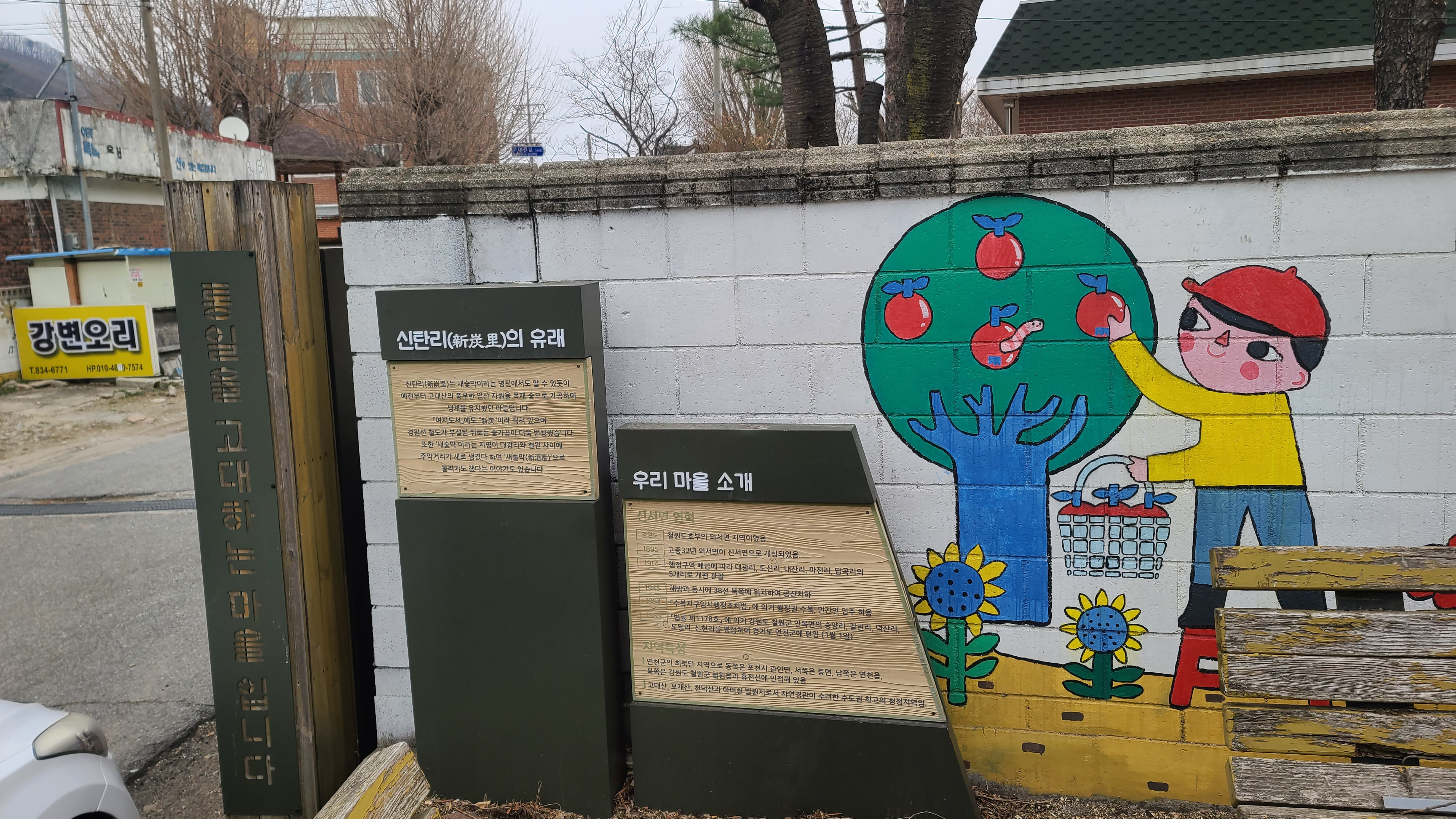 나무 기둥에 '신탄리는 통일을 고대하는 마을입니다.'가 적혀 있고, 신탄리의 유래와 마을 소개 안내판이 세워져 있다.