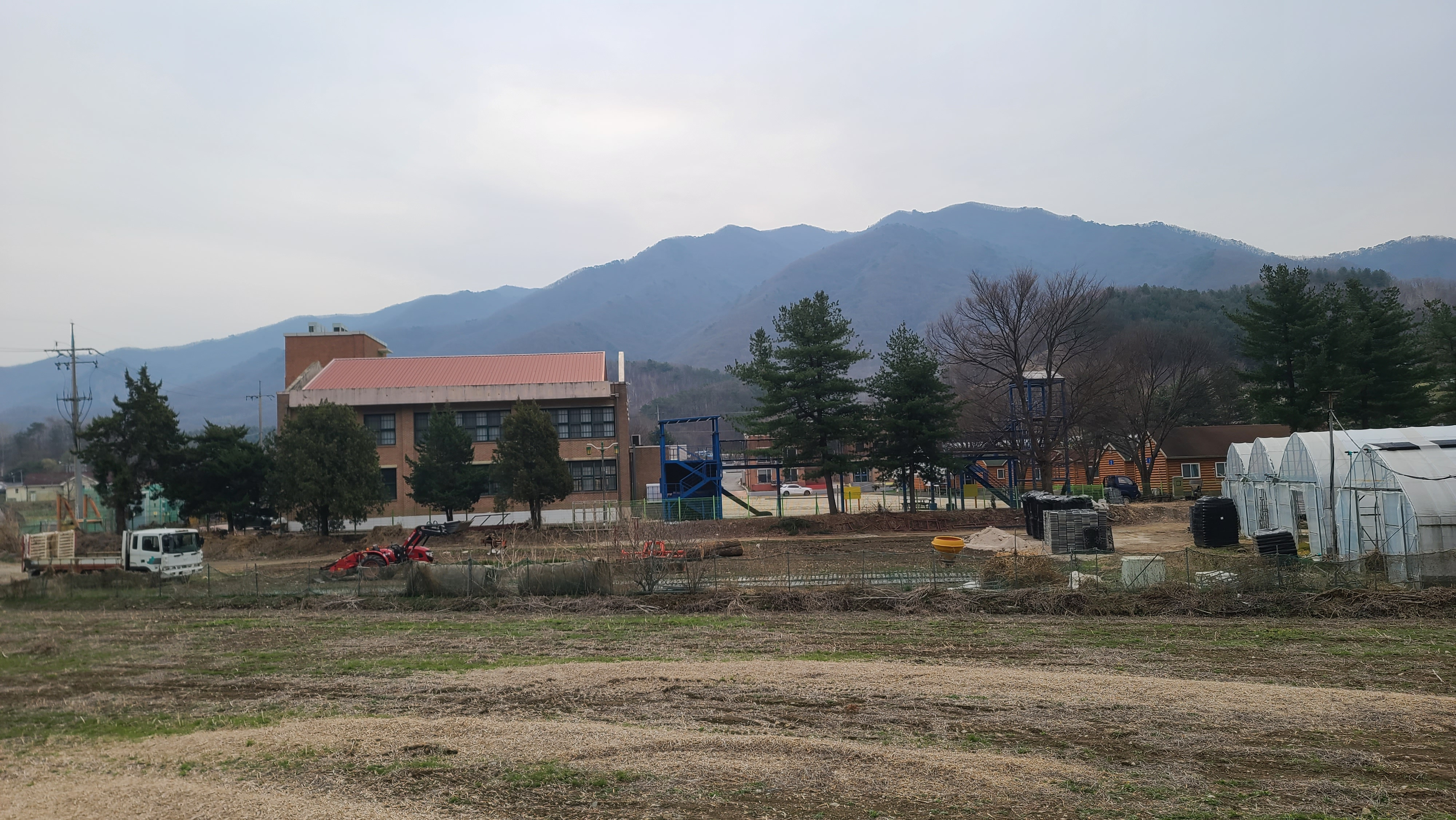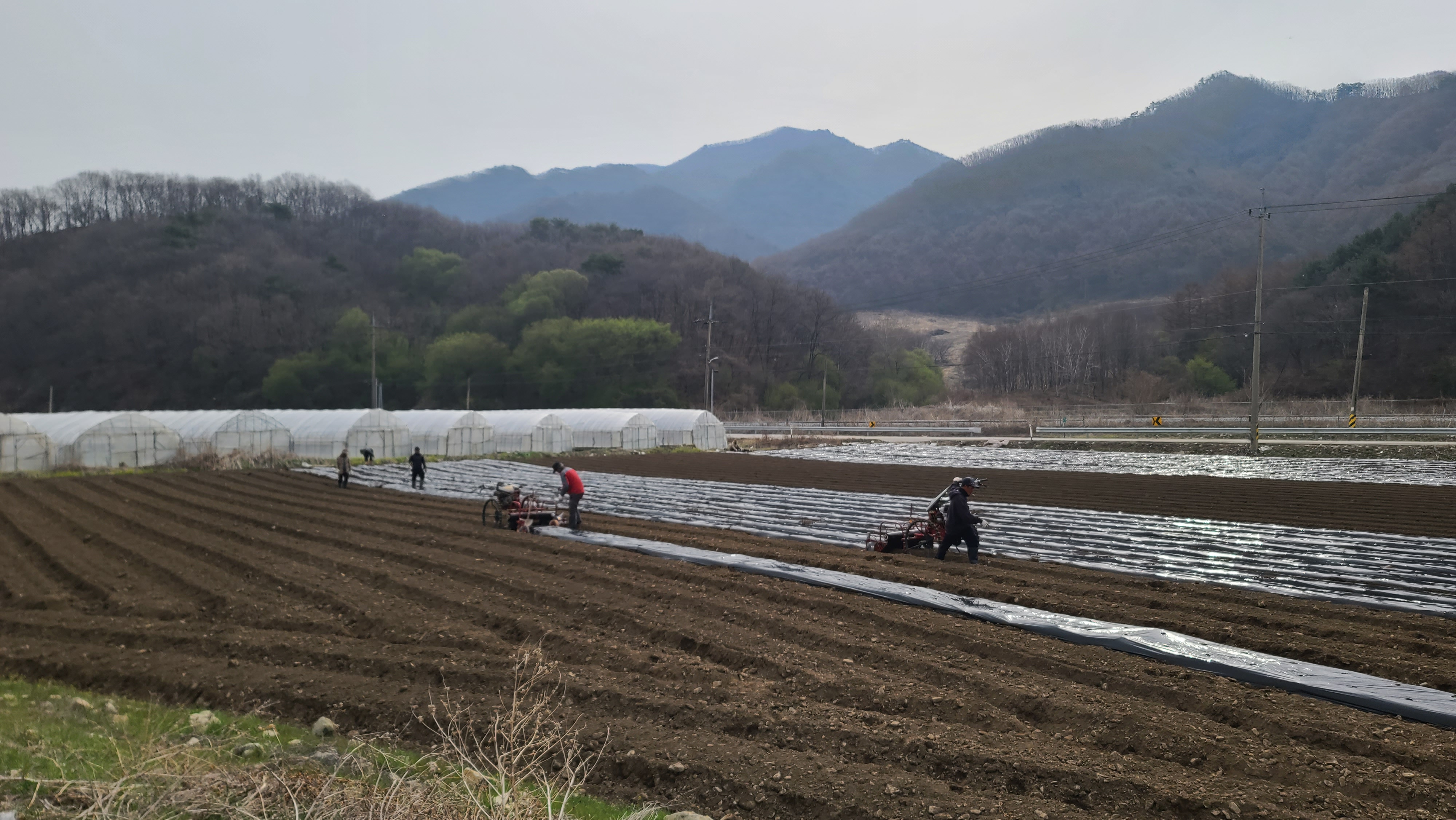 밭에서 농부들이 농사일에 바쁘다. 무슨 농사인지 알아 보니 배추 파종을 한다고 한다. 중앙 뒤에서 고대산이 내려본다.