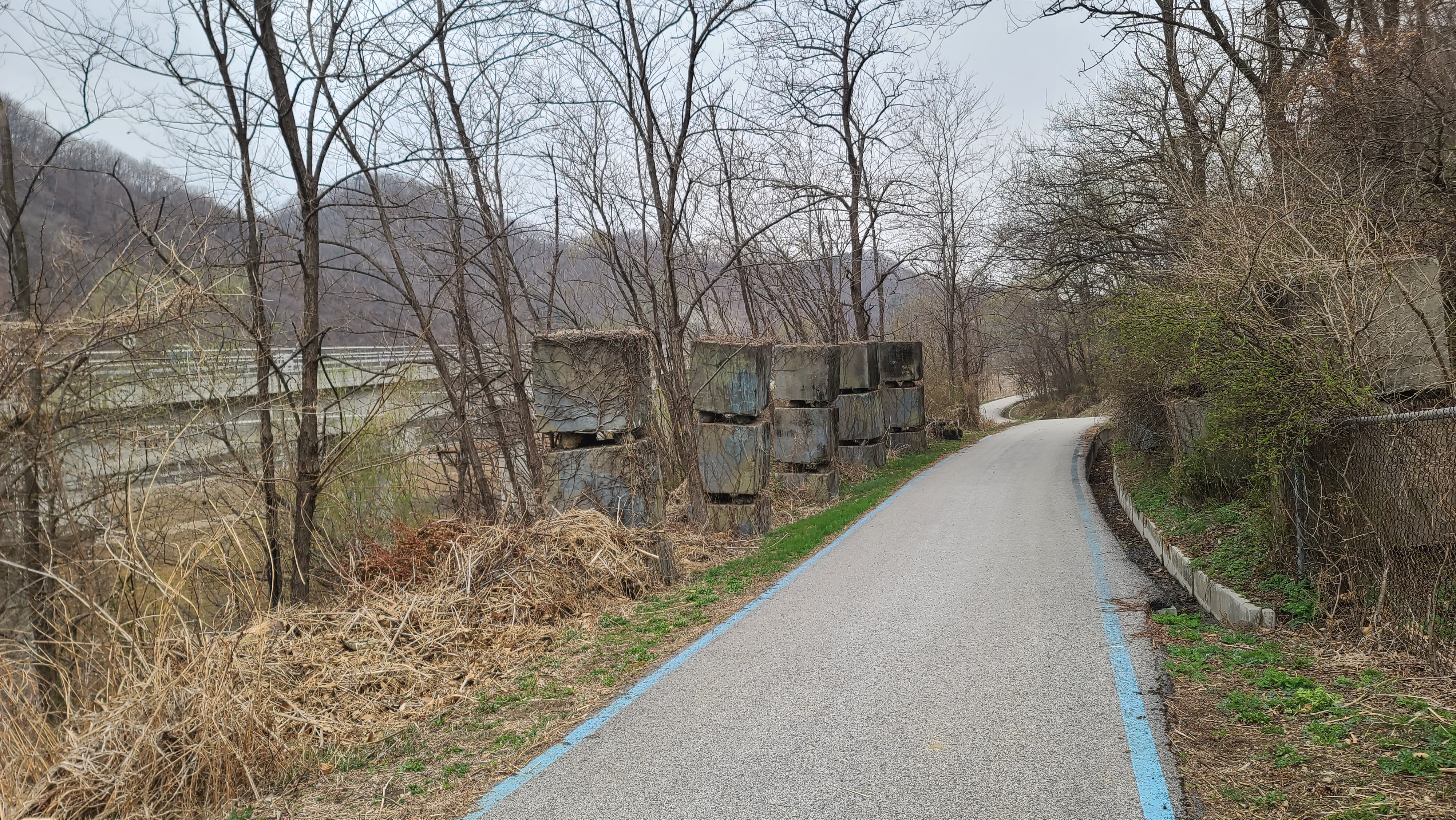 경원선 고가철도는 왼쪽에서 달리고 평화의 길은 오른쪽으로 이어간다. 시멘트 설치물은 무엇일까?