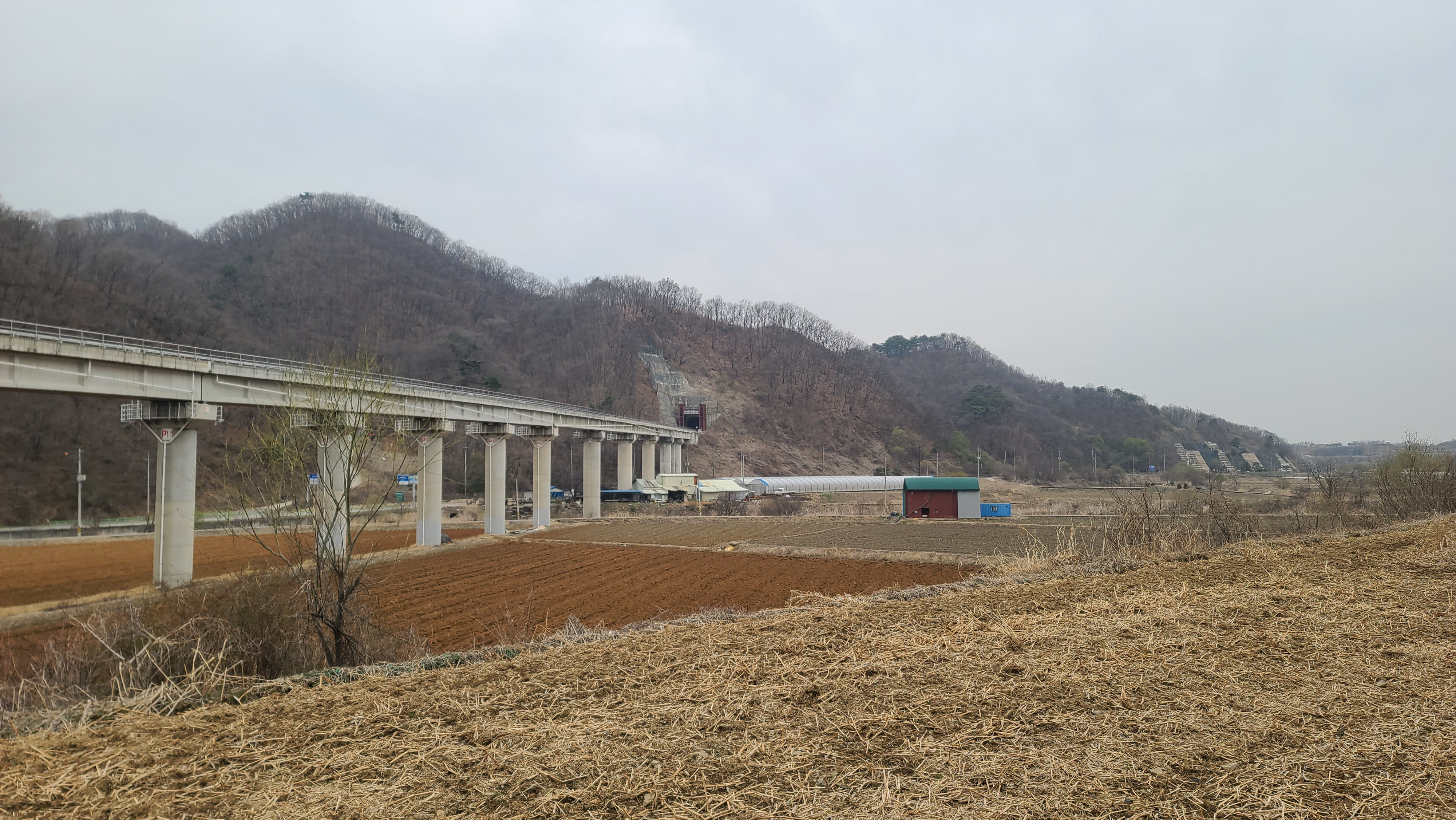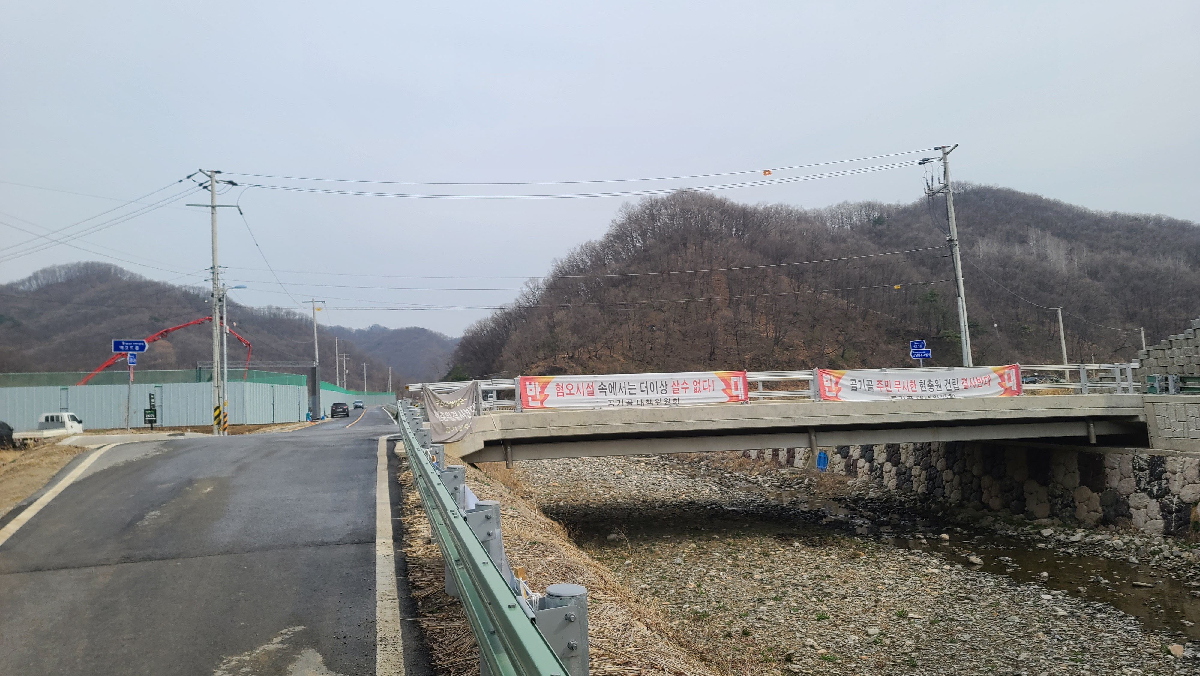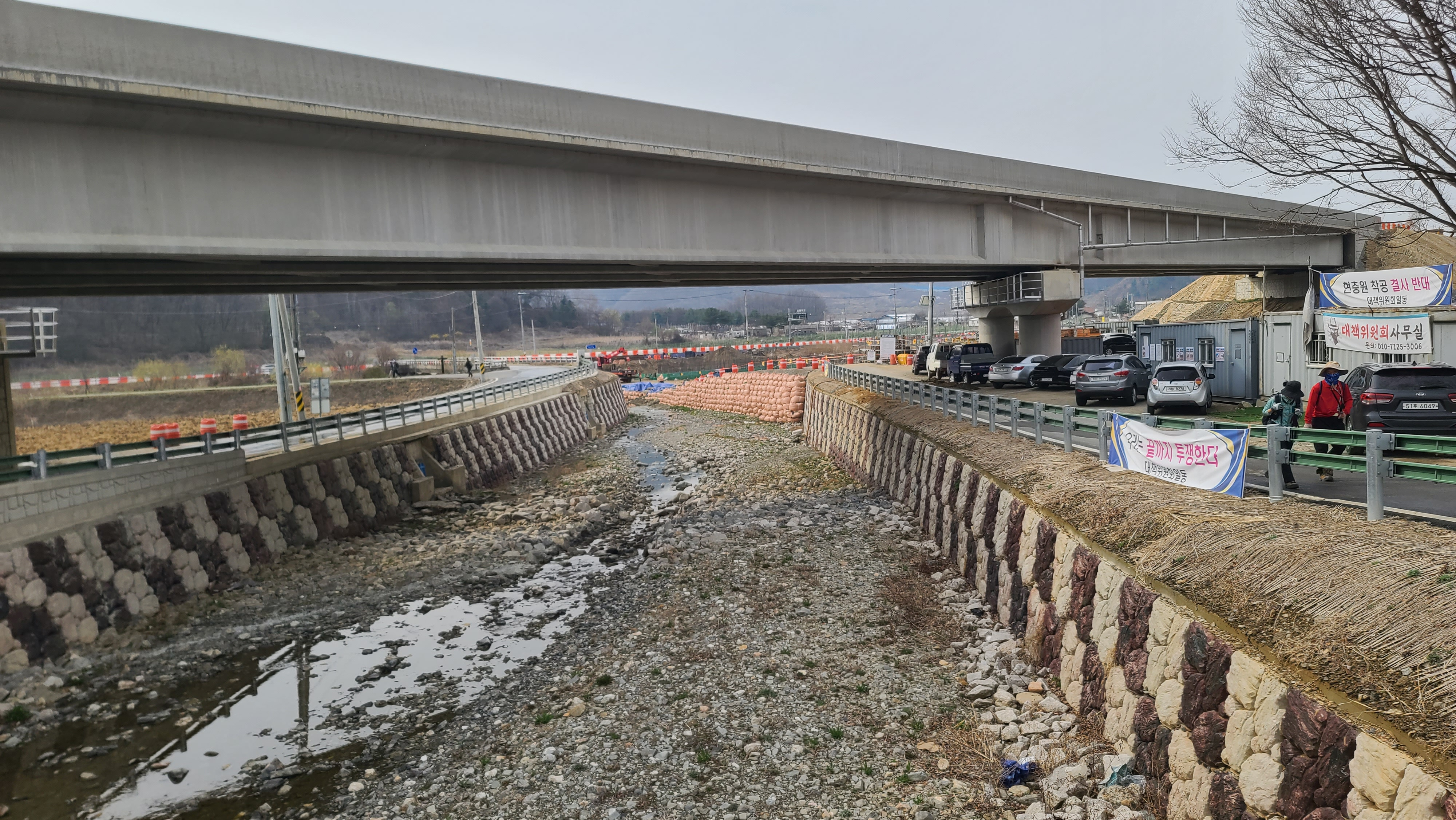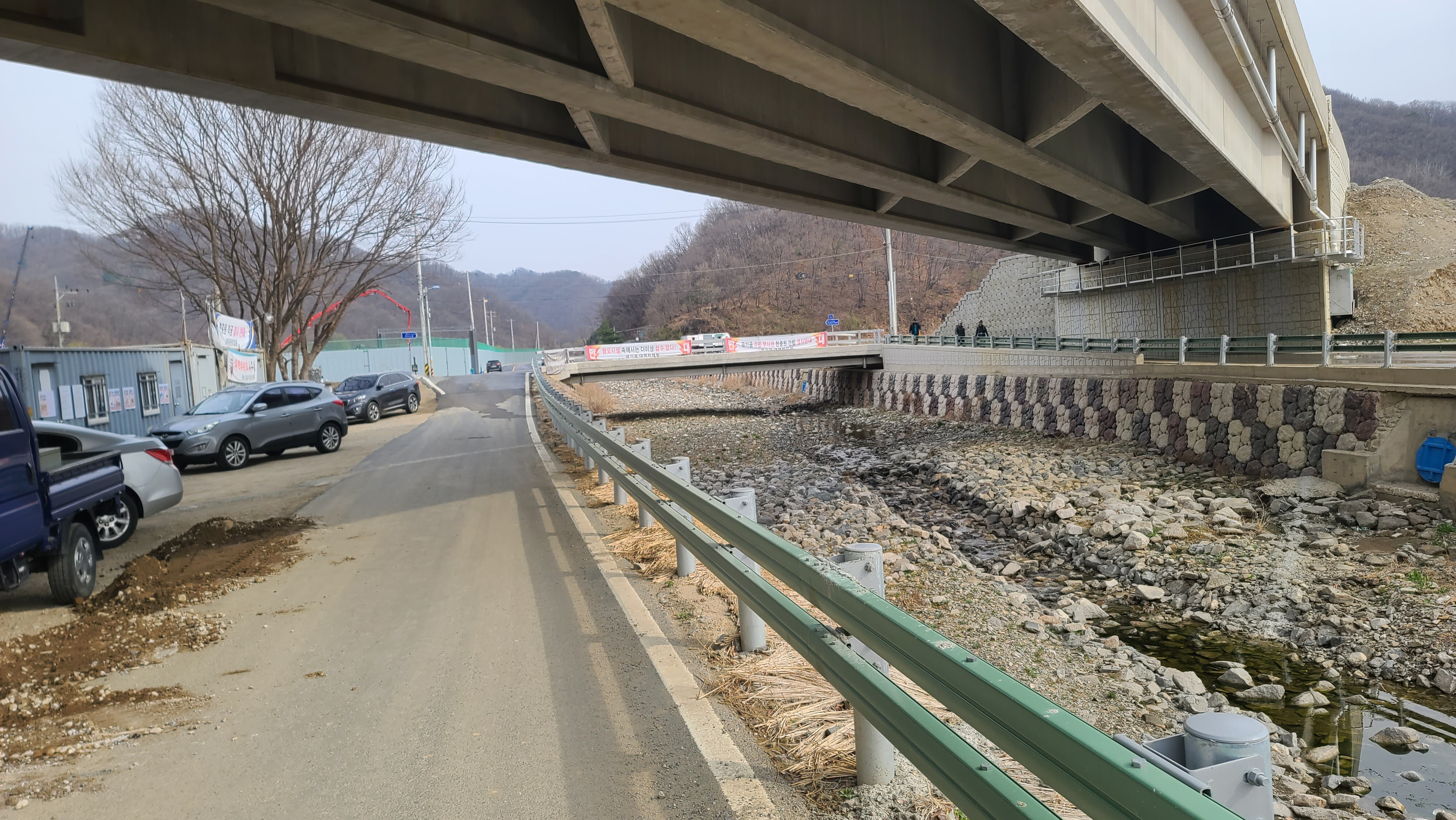 대광리 우회도로의 고가도로가 곰기천 공중을 지나고 있고, 왼쪽 뒤에 국립연천현충원 조성사업이 한창이다. 평화의 길은 곰기천의 다리를 건너 연신로1375번길을 따라 차탄천 방향으로 내려간다.