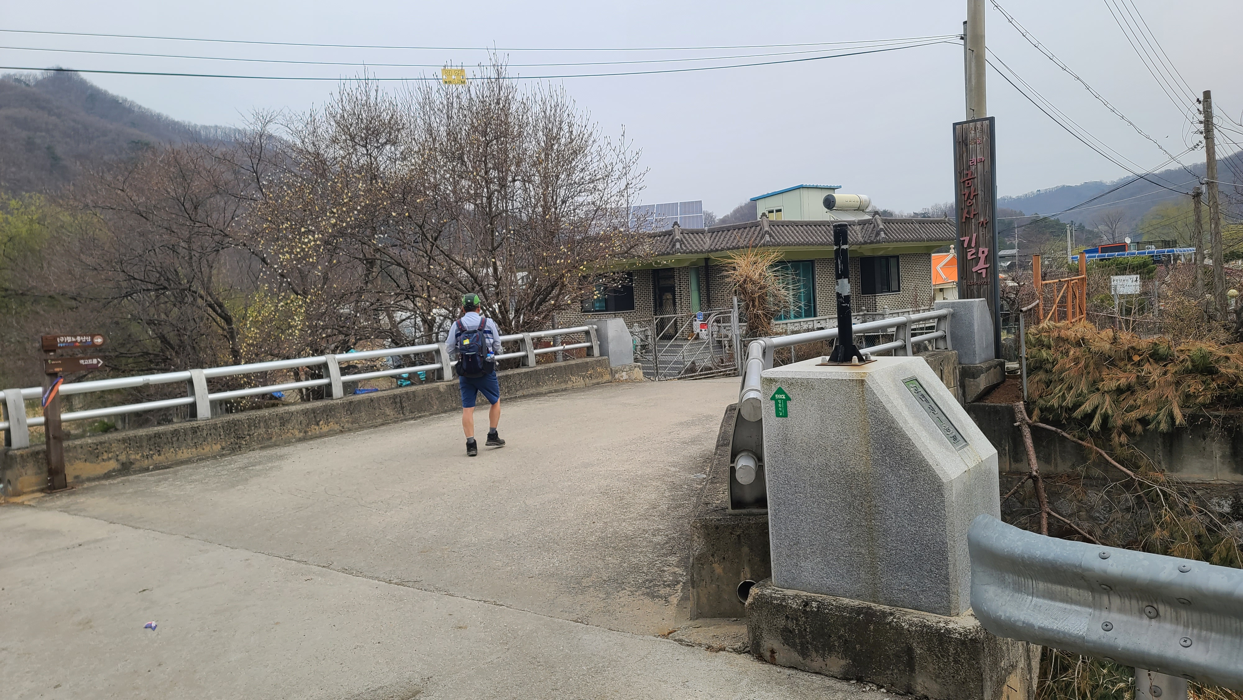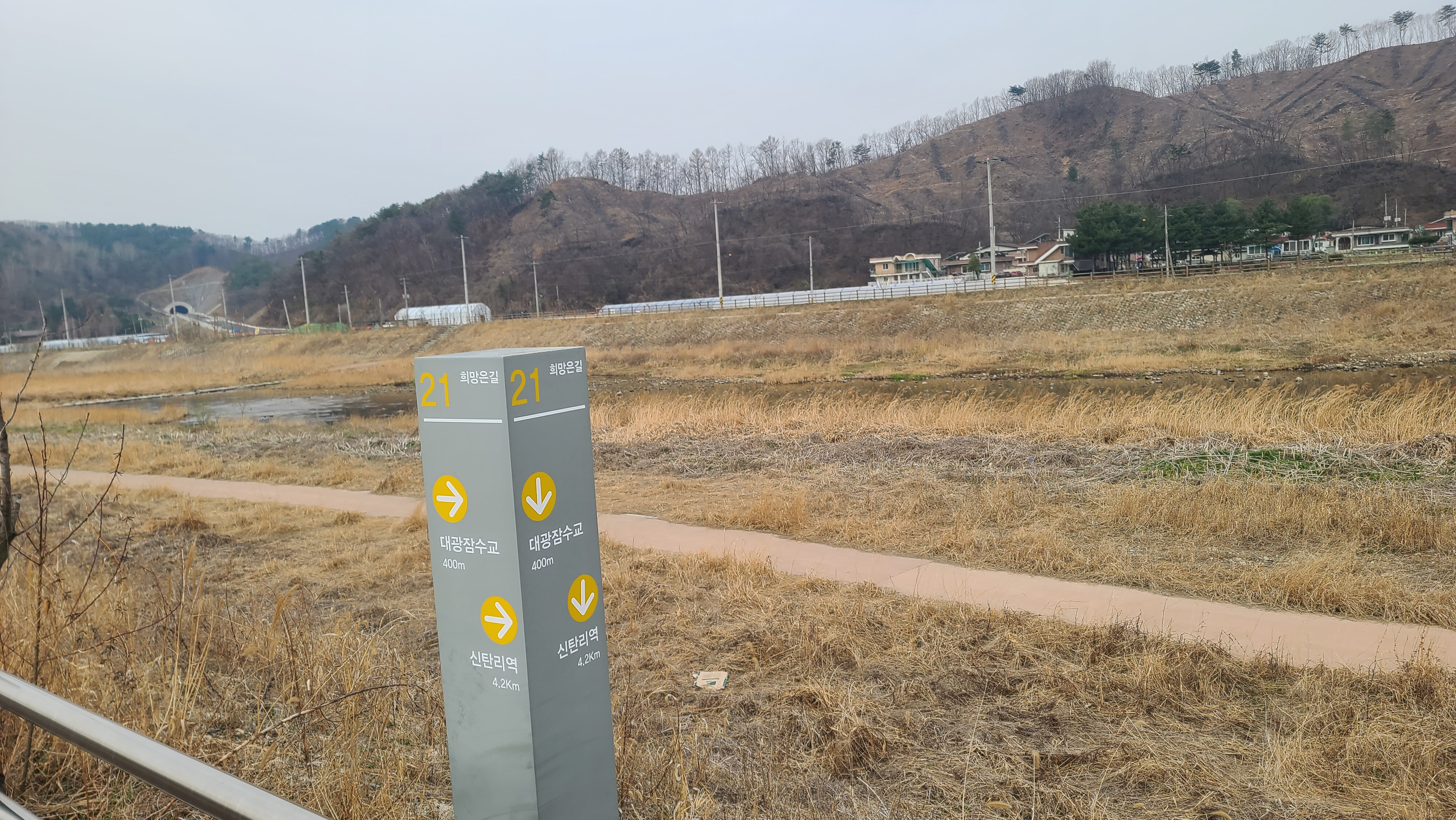 '희망온길' 이정목 앞에서 차탄천 징검다리와 소목개마을 입구를 돌아본다. 왼쪽 뒤에 건설 중인 대광리 우회도로 터널이 보인다.