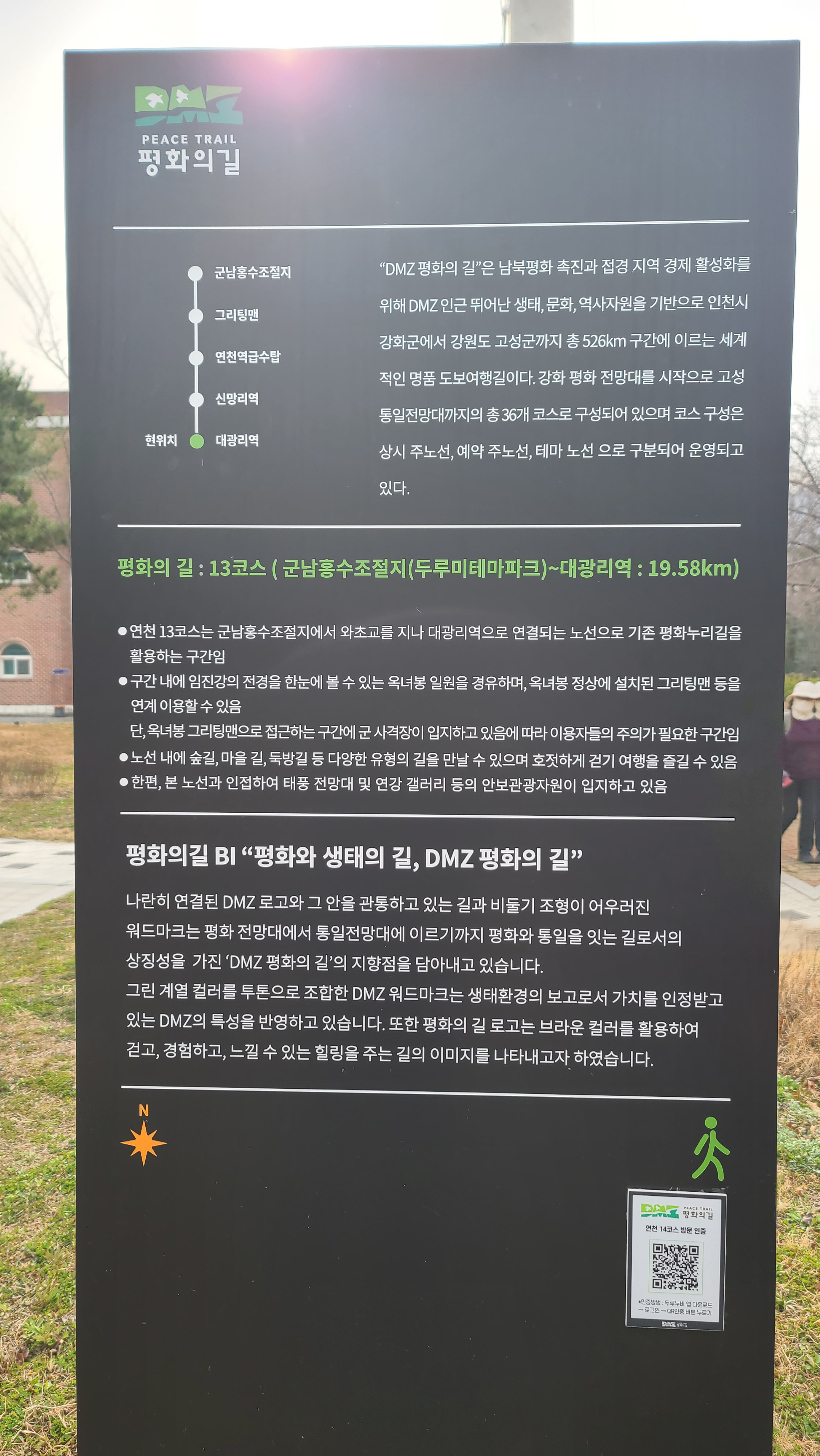 DMZ 평화의 길 13코스 안내판 아래쪽에 연천 14코스 방문인증 QR코드가 붙어 있다.