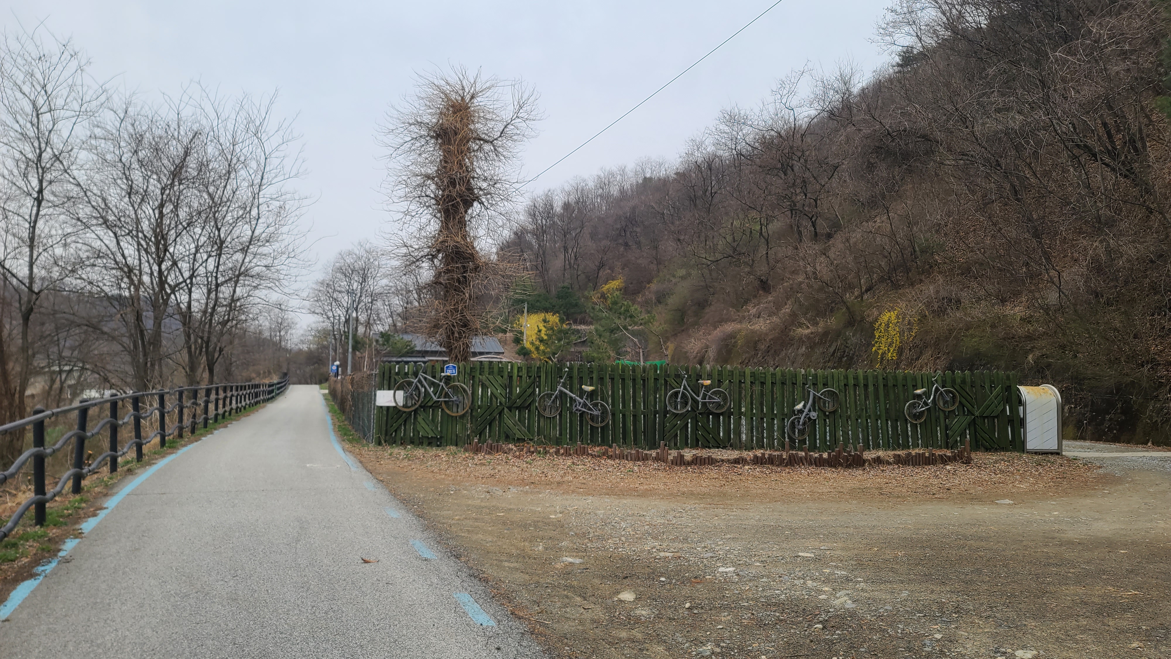 평화누리자전거길 역고드름쉼터 울타리에 자전거들이 걸려 있다.