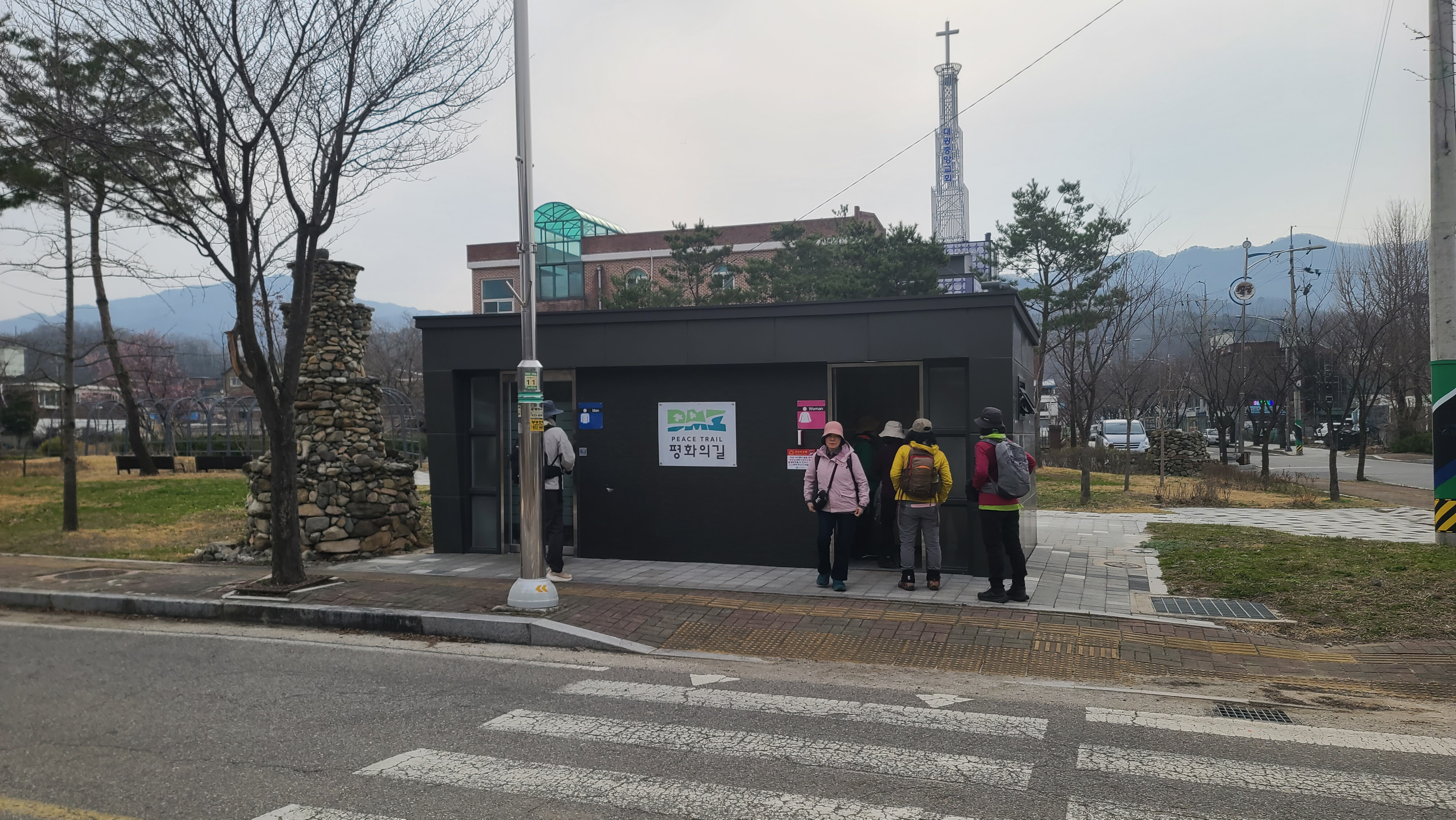 DMZ 평화의 길 14코스 시작지점 옆에 화장실과 돌탑이 있으며, 화장실벽에 DMZ 평화의 길 워드마크가 붙어 있다.