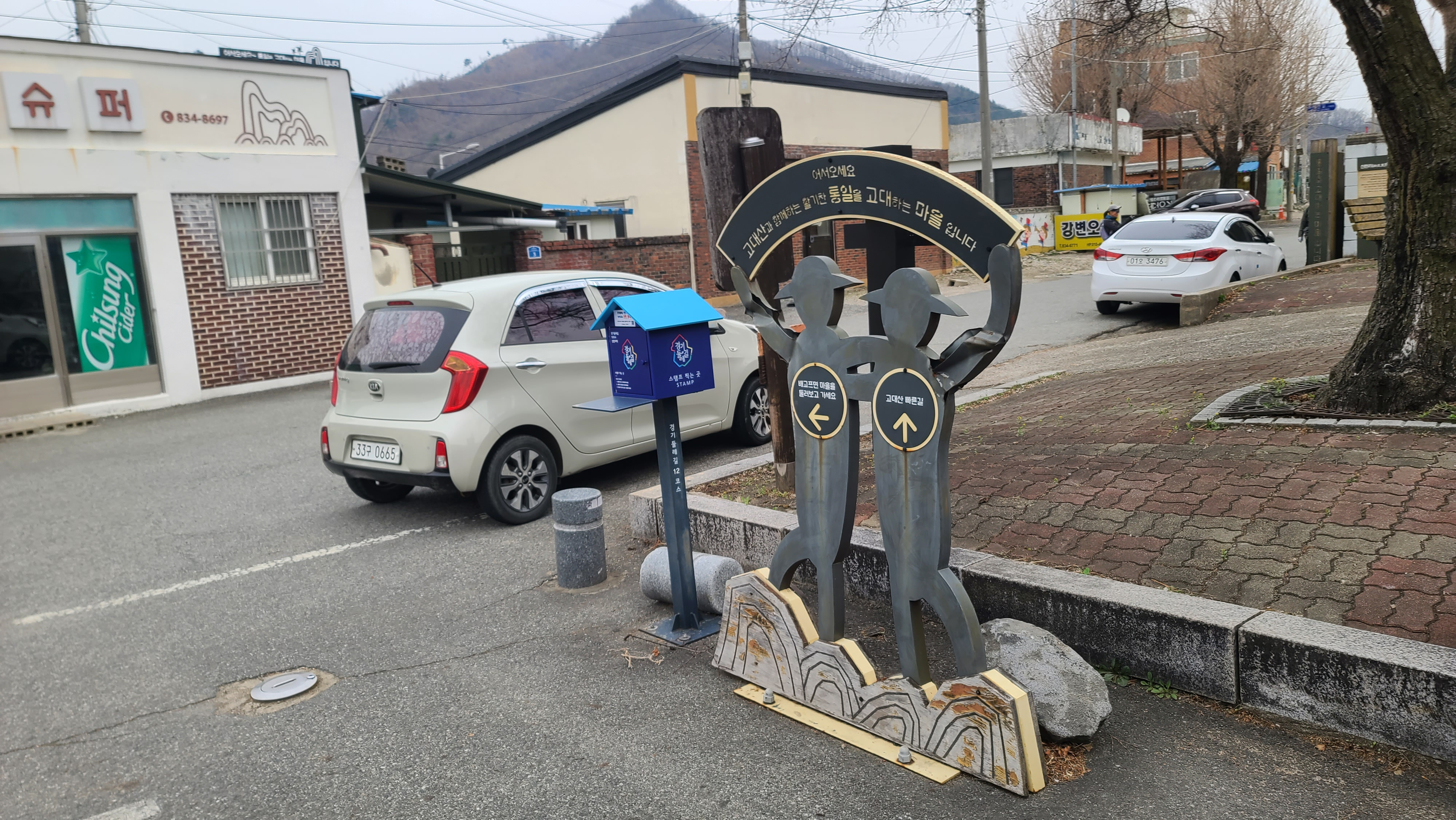 '고대산과 함께 하는 활기찬 통일을 고대하는 신탄리마을' 조형물과 경기둘레길12코스 스탬프함을 돌아 오른쪽 길로 올라간다.