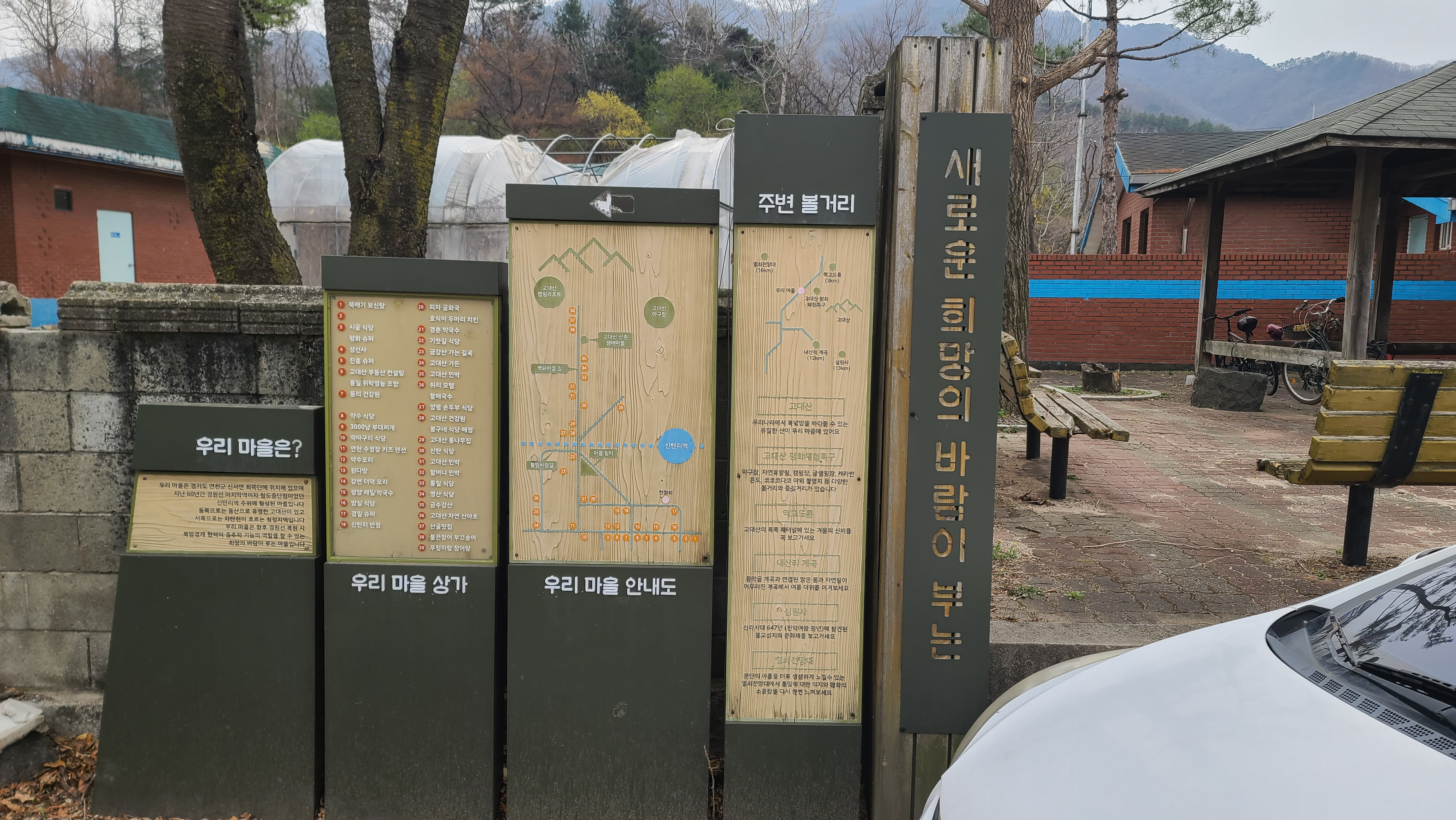 고대산 산촌마을 쉼터에 지역명이 적힌, 원통 모형의 '한국의 심장' 조형물이 조성되어 있고, 왼쪽에 마을안내도 등 게시판이 있다.