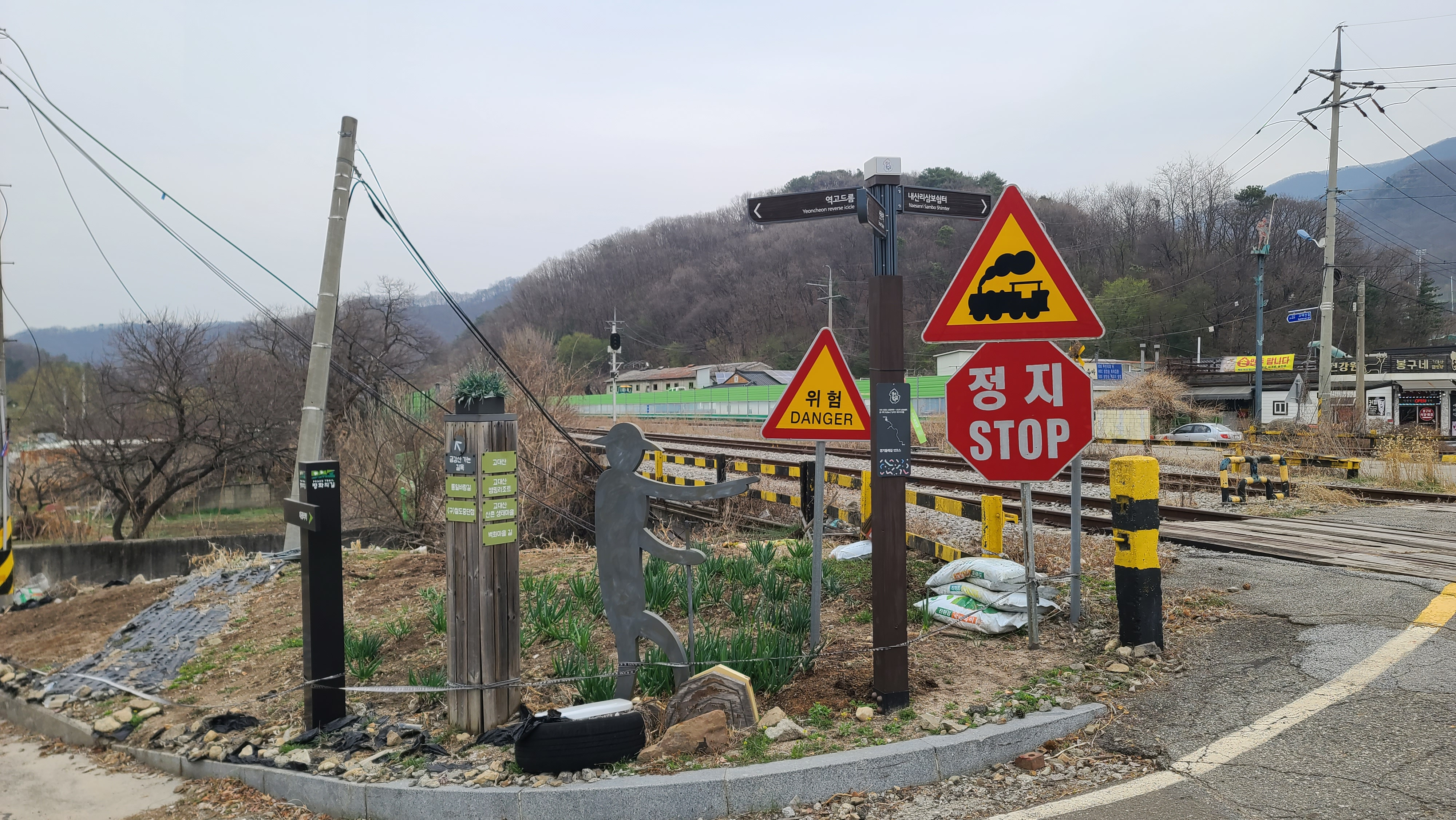 경원선 철도건널목 입구에서 오른쪽 길은 내산리쉼터, 고대산, 고대산 캠핑리조트, 고대산 산촌생태마을, 벽화마을로 가는 길이고, 평화의 길은 왼쪽 길을 따라 경원선 옛 철도 중단점과 역고드름 방향으로 이어간다. 경원선 철도로 나가 남북 방향을 살피고 나온다.