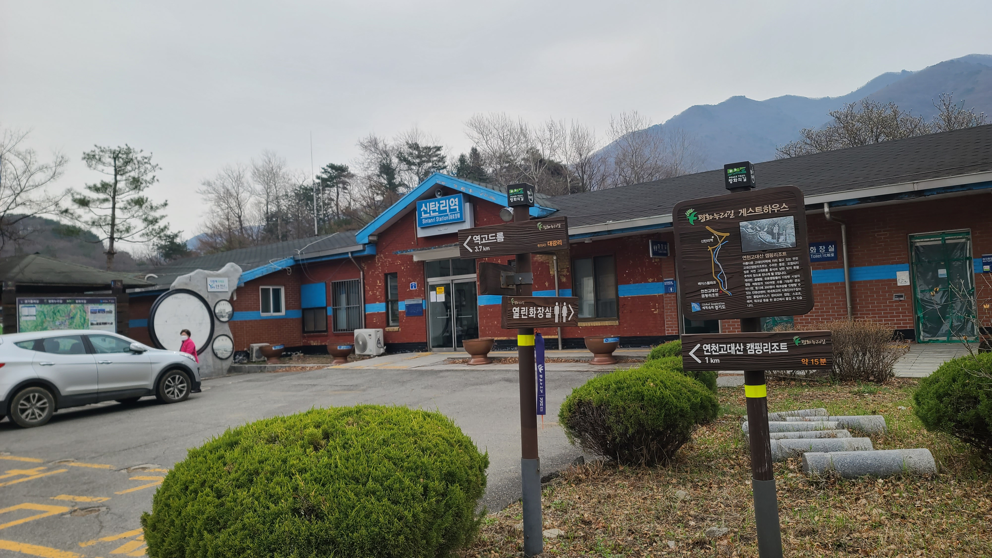 신탄리역 광장에 평화누리길 이정목과 평화누리길 게스트하우스 안내판이 세워져 있다. 역고드름 3.7km 지점이다.