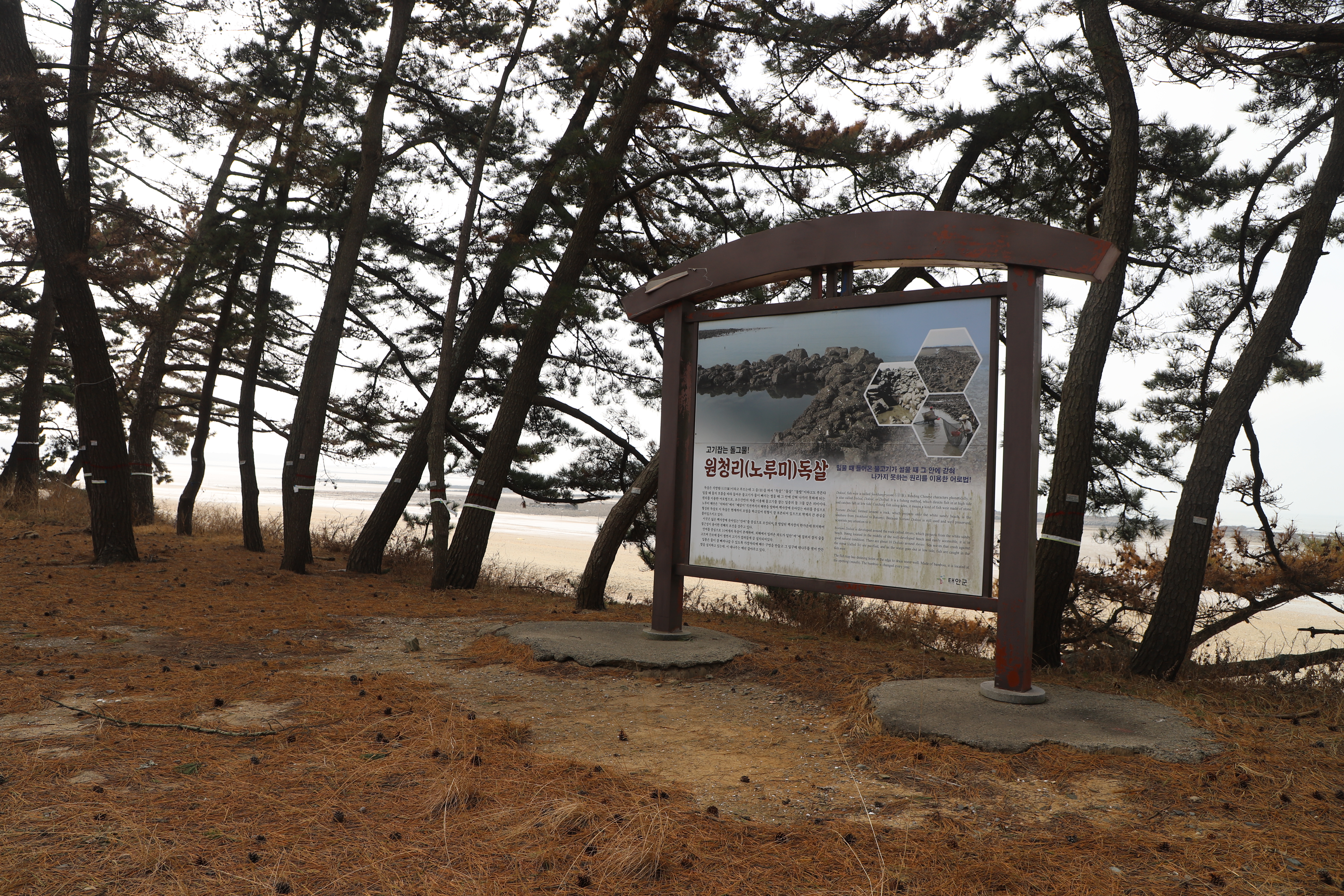 고기잡는 돌그물! 원청리(노루미) 독살 : 독살은 석방렴(石防簾)이라고 부르는데 그 음(音)을 따서 "독살" "돌살" "돌발"이라고도 부른다. 밀물 때 물의 흐름을 따라 들어온 물고기가 물이 빠지는 썰물 때 그 안에 갇혀 나가지 못하게 되는 원리를 이용한 어로법으로, 조수간만의 차를 이용해 물고기를 잡는 일종의 돌 그물 같은 의미이다. 노루미 해안은 "덕바위"에서 "배암지" 직전까지의 해변을 말하며 백사장에 솟아있는 바위를 중심으로 형성된 독살로 이 독살은 현재까지 조업을 하고 있어 원형이 잘 보존되어 있으므로 학계의 큰 관심을 불러일으키고 있다. 이곳은 넓은 백사장에 솟아있는"안여"를 중심으로 조성되어 잘 발달된 백사장의 한가운데 위치하여 접근성이 용이한 천혜의 조건을 갖추고 있다. 안여를 중심으로 10여 개의 독살이 존재하며, 외해에서 밀려온 파도가 일단 "여"에 걸려서 잠시 숨을 고르며 간조에 물이 썰면서 고기가 걸려들게끔 설치되어 있다. 입통은 물이 잘 빠져나갈 수 있도록 가장자리에 배수 구멍을 만들고 그 입구에 대나무를 엮어 만든 발을 설치하고 있는데, 이 대나무는 매년 갈아주고 있다. - 안내판