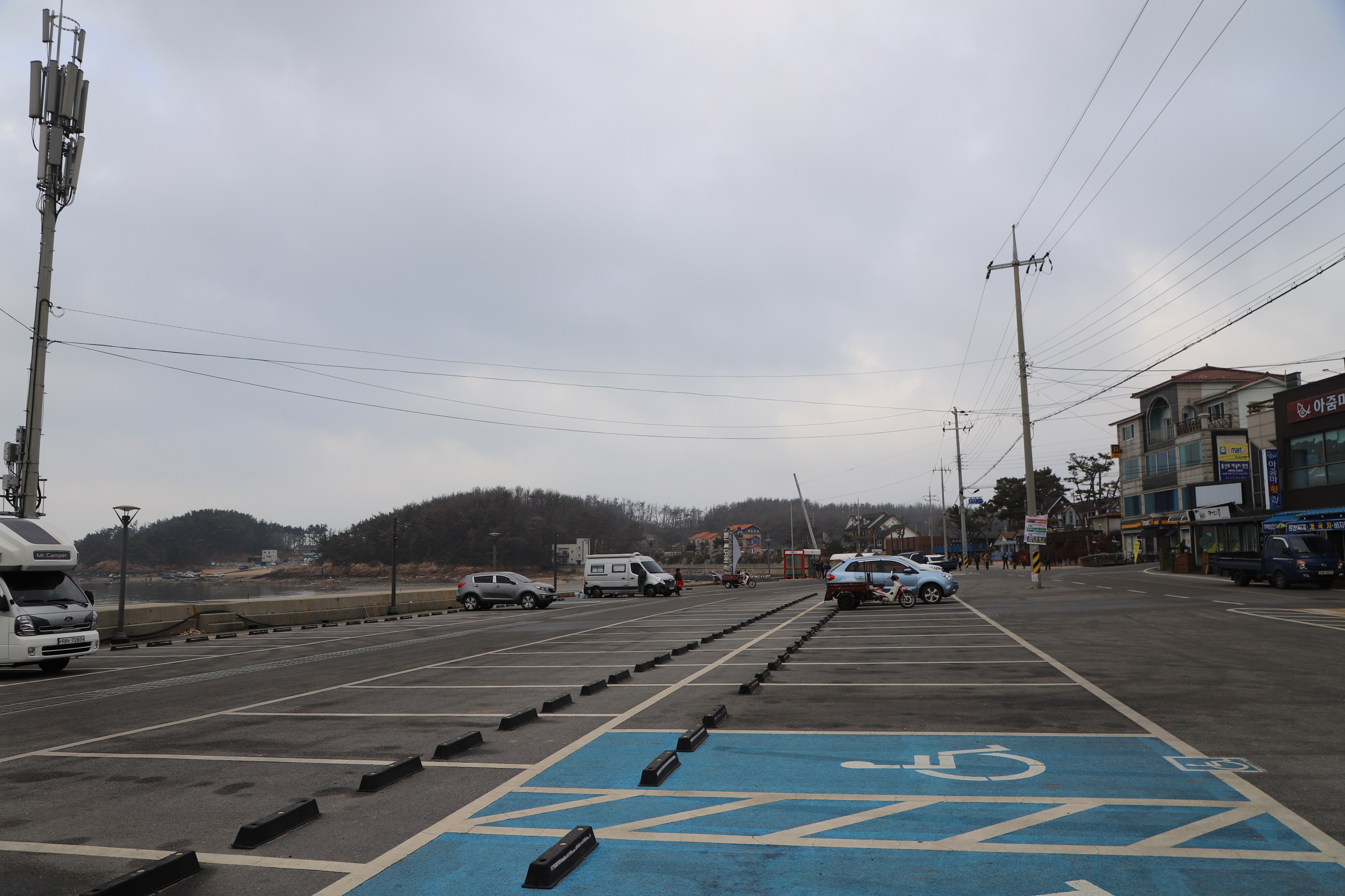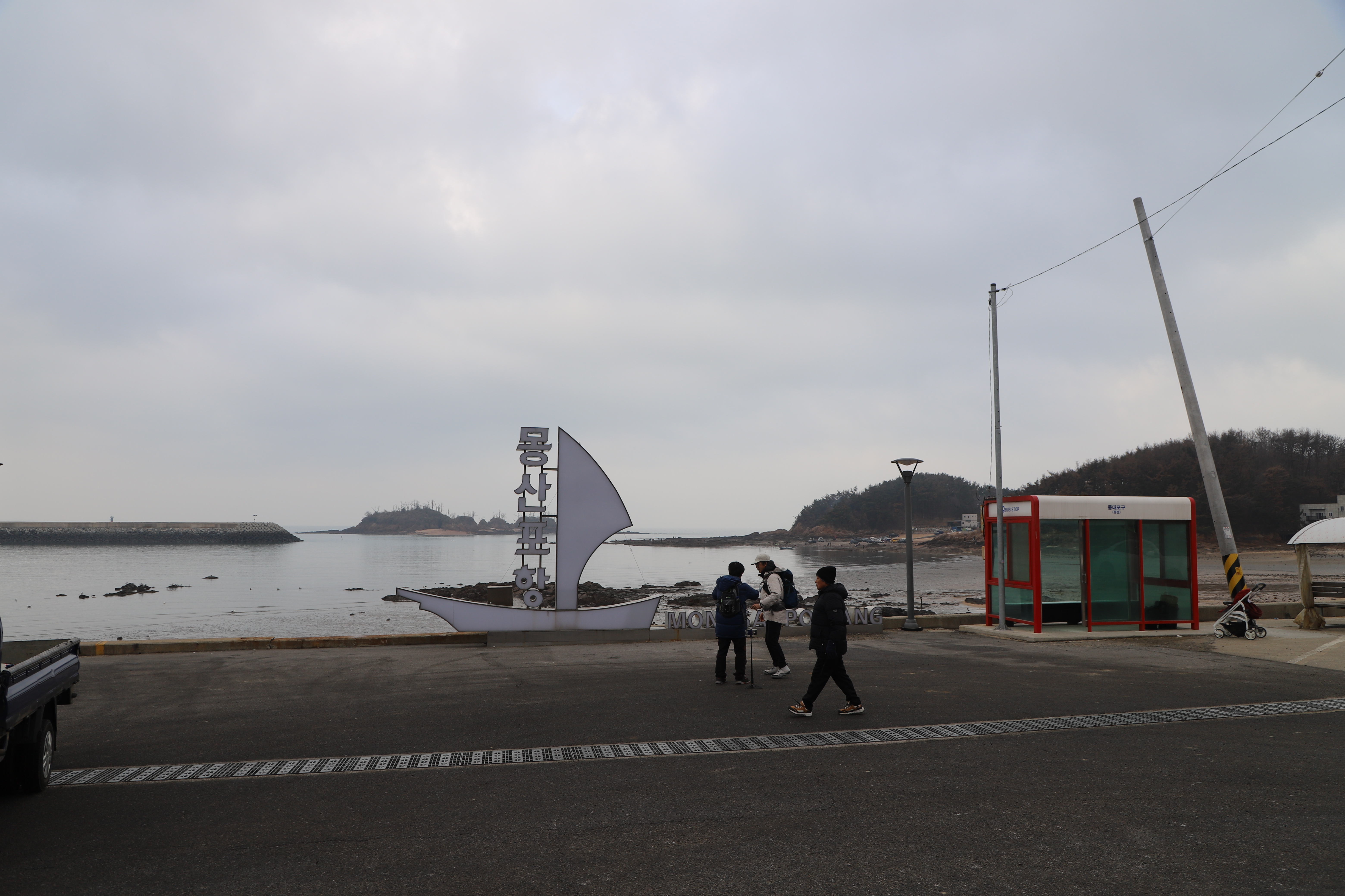 몽산포항 주차장에서 동서트레일 2구간 출발지로 올라간다. 앞쪽에 몽산포항 조형물과 몽대포구 버스정류소가 있다.
