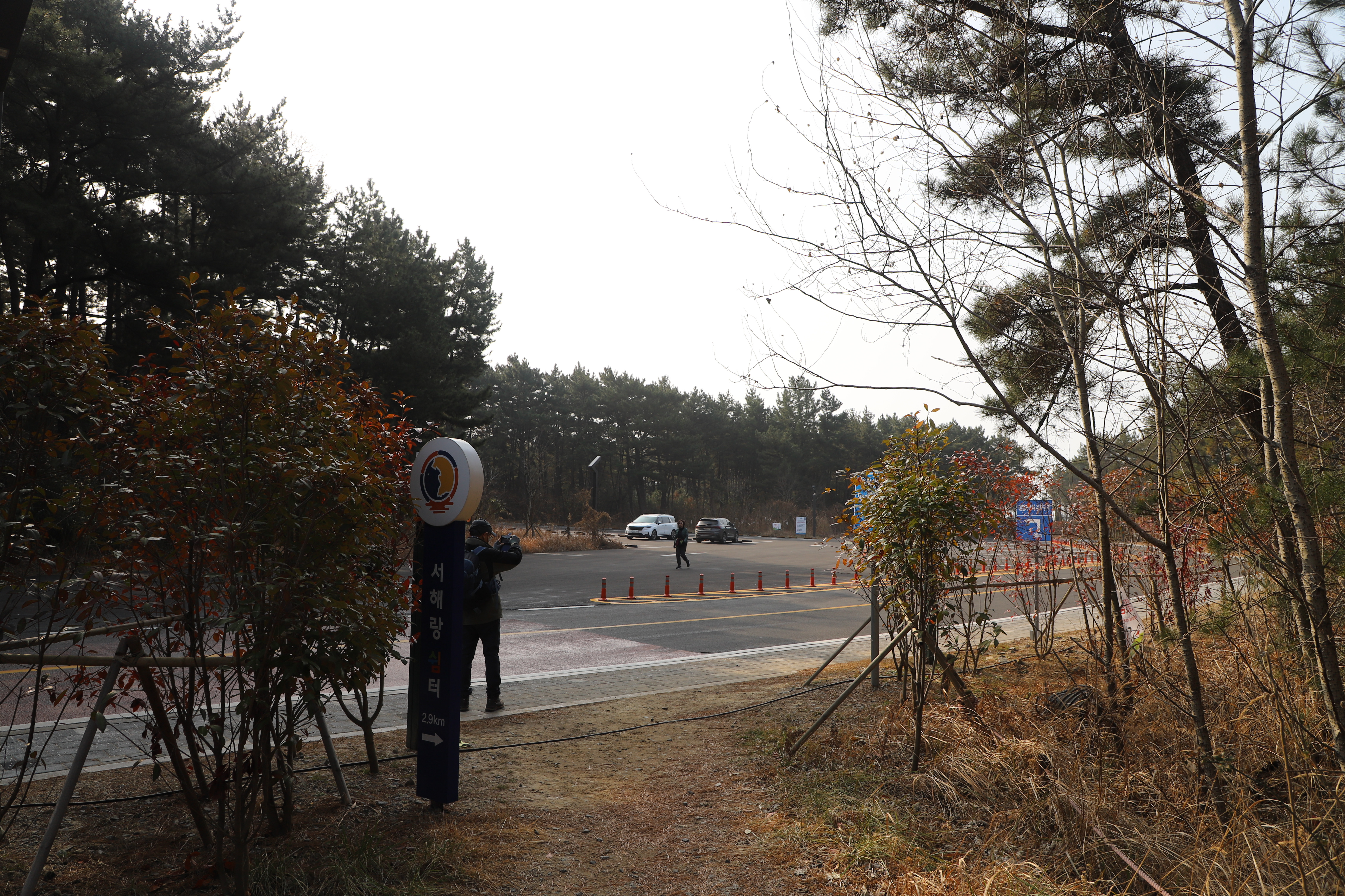 왼쪽에 몽산포 주차장, 그 건너편에 태안해안체험학습관이 있다. 동서트레일은 회전교차로에서 CU표지판 오른쪽으로 이어간다.