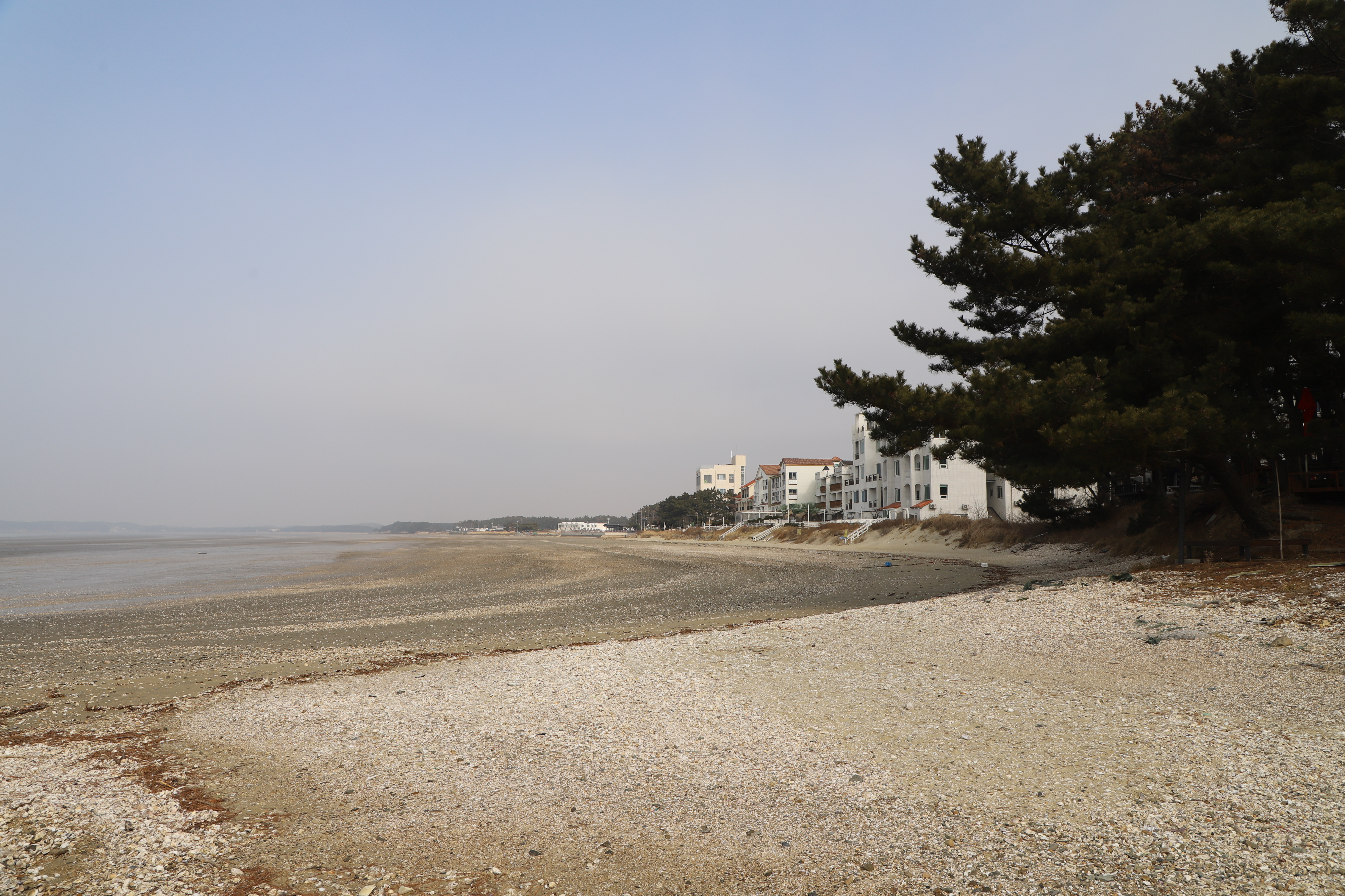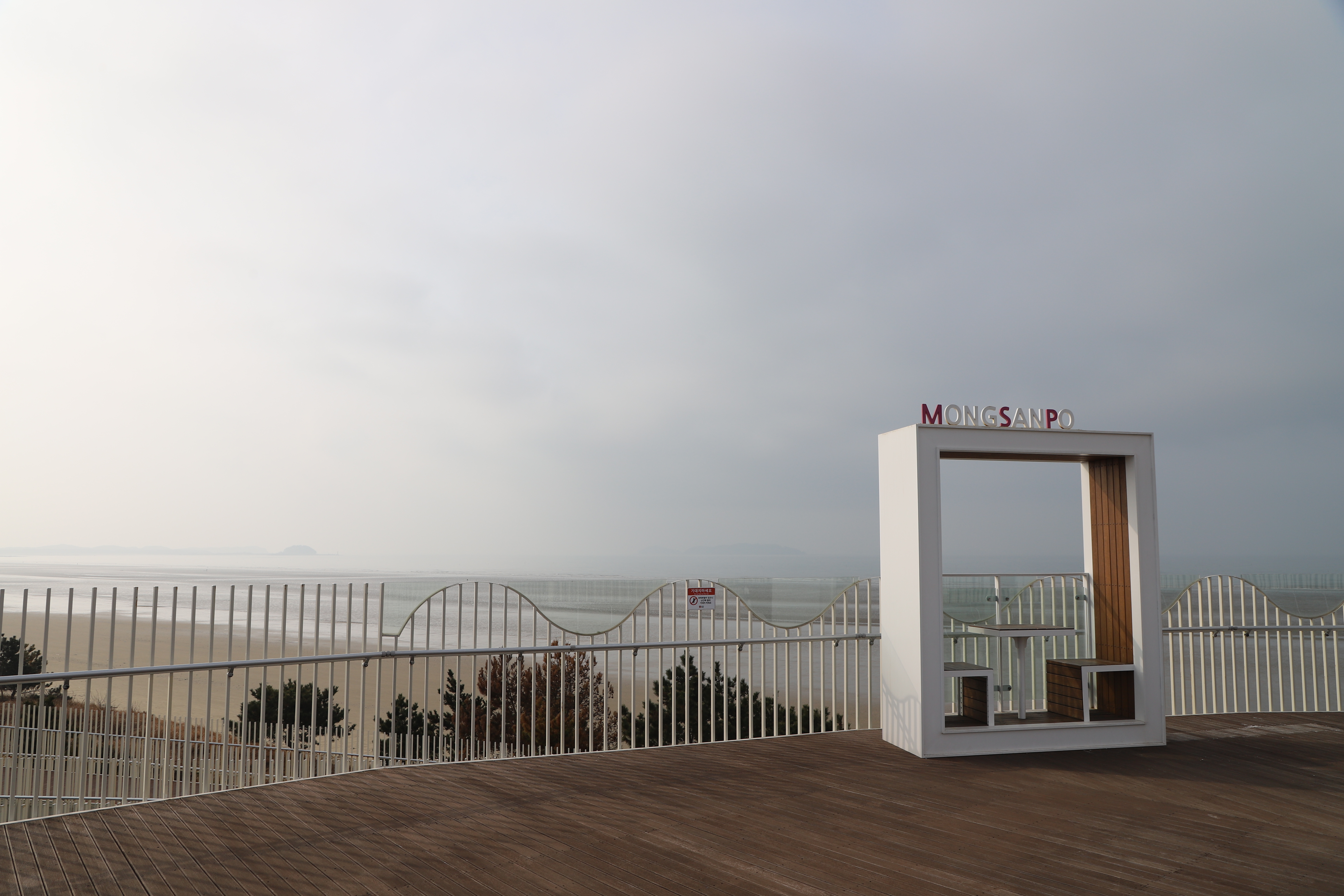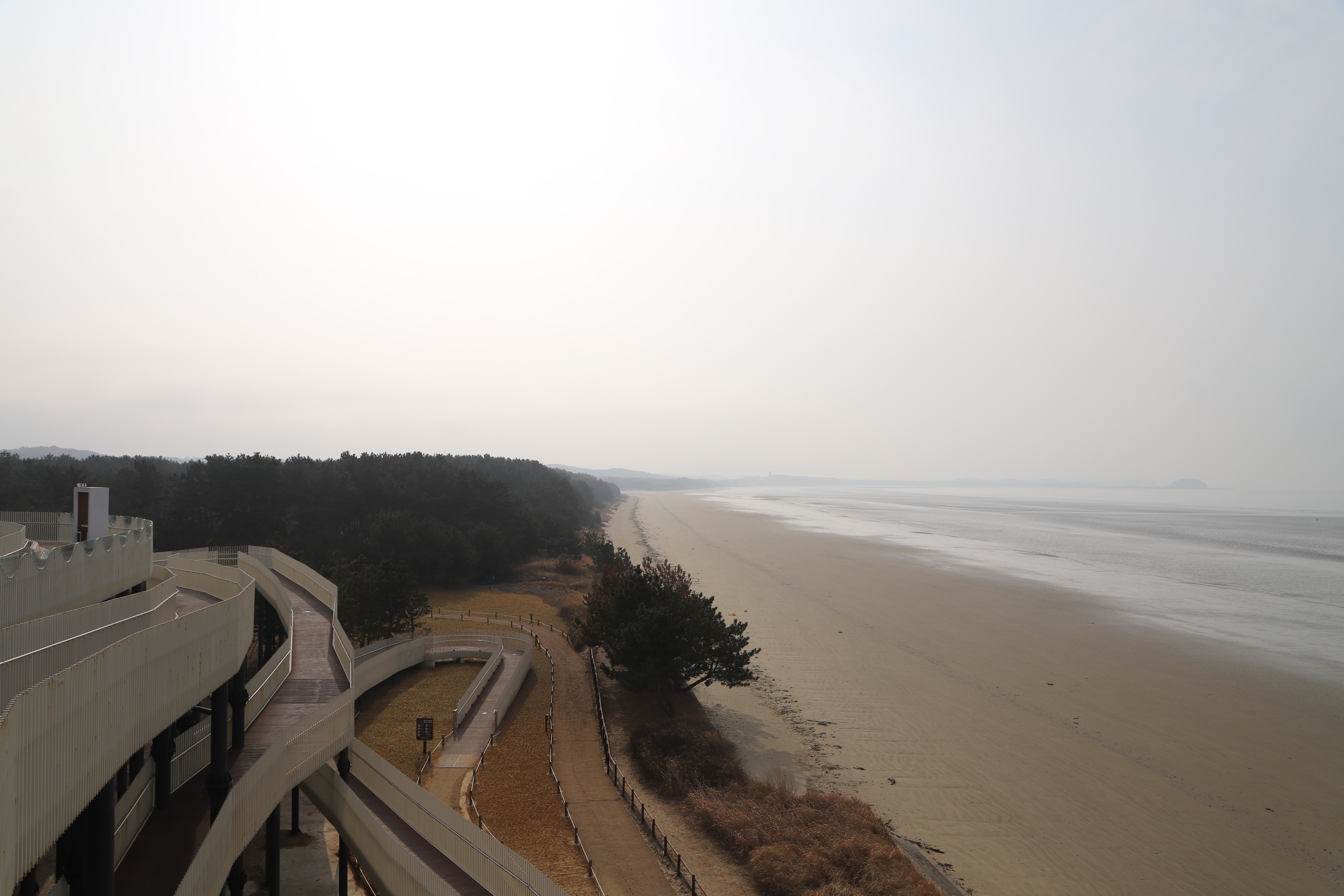 태안군 남면 신장리 몽산포(夢山浦) 해수욕장은 태안8경 중 7경에 속한다. 모래가 곱고 모래 사장이 드넓다. 북쪽으로 몽산리 해변으로 이어지고 남쪽으로 달산리 달산포 해수욕장으로 이어지는 길면서 넓은 몽산포(夢山浦) 해수욕장은 청포대 해수욕장과 더불어 태안군의 대표 해수욕장이다. 지난 번에는 공사 중인 몽산포 전망대가 완공되어 몽산포 전망대에 올라가 태안군 남면 해변과 바다를 조망하는데, 미세먼지가 풍경을 흐릿하게 한다. 몽산포항과 등대전망대, 오형제섬이 정답다. 남쪽 해안을 따라 해송숲이 펼쳐지고 해변에 자리한 펜션들과 야영장도 아름답다. 날이 좋은 날 몽산포 전망대에서의 전망은 환상적일 것이라는 생각이 들었다.